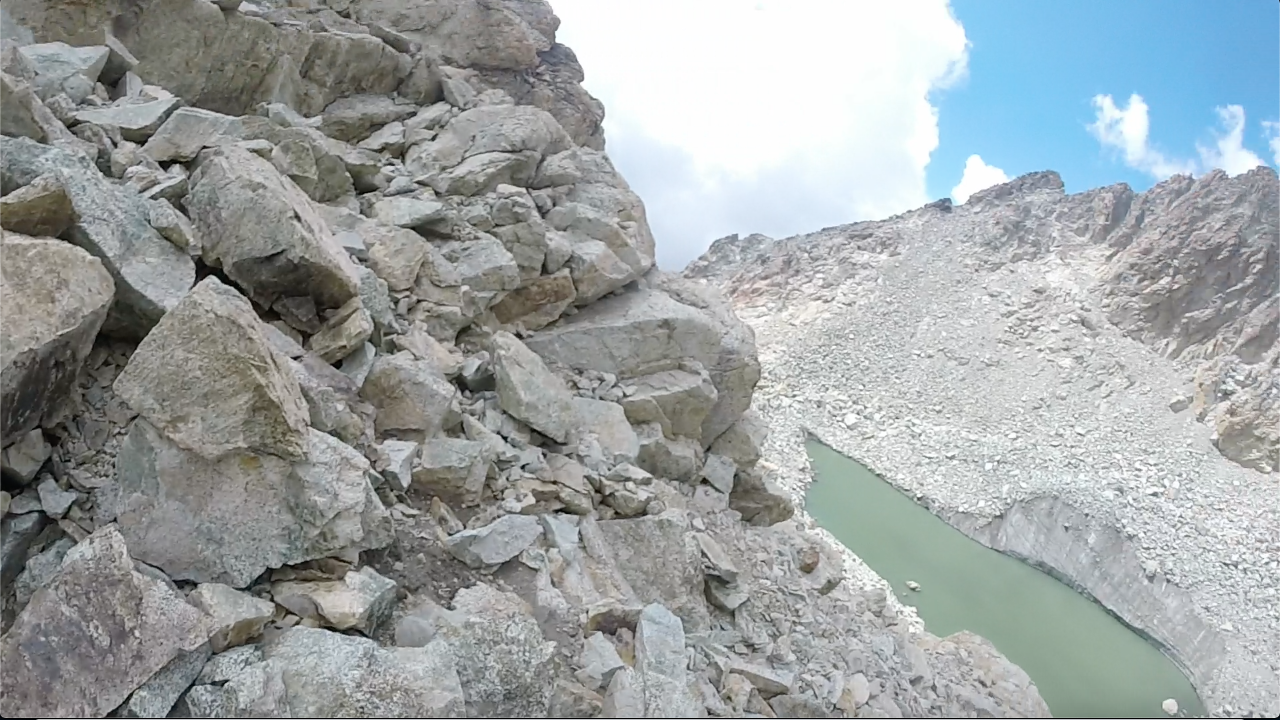 Dalla Punta si scende dapprima su facili sfasciumi, dopodiché il terreno diventa più ripido e sfasciumoso, da scendere dove più sembra agevole, fino alla pietraia del Ghiacciaio Quarnero, ormai (Luglio 2022) in secca, dov’è ubicato lo splendido lago glaciale.