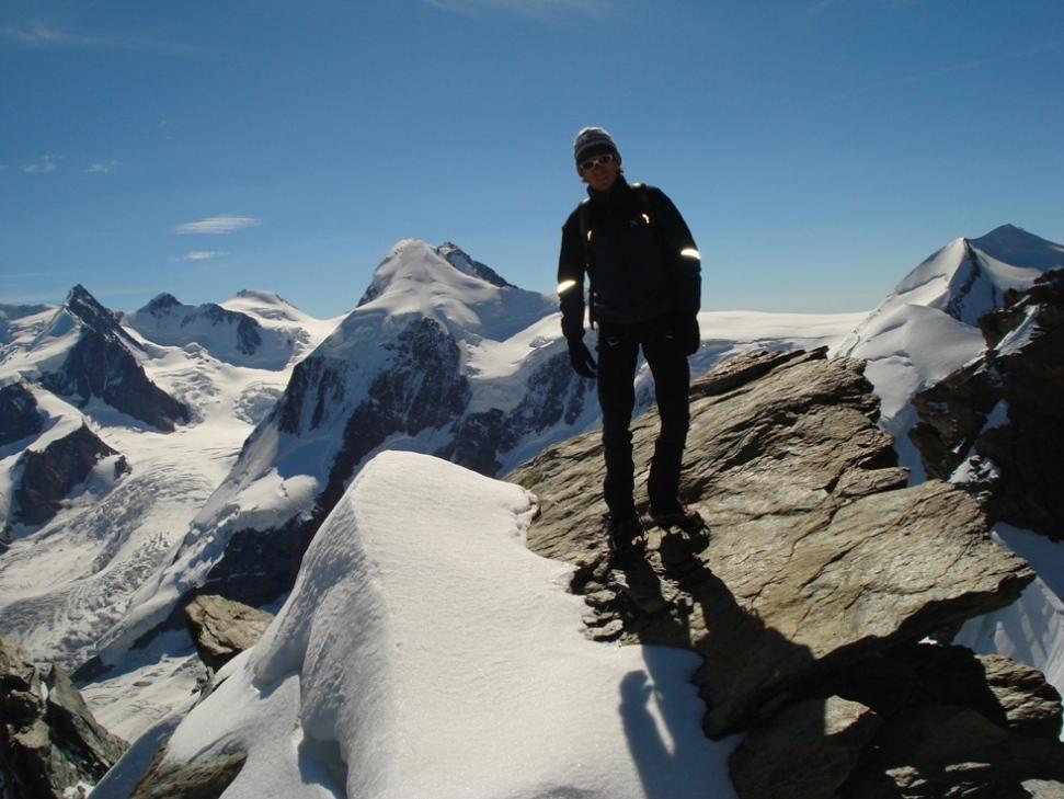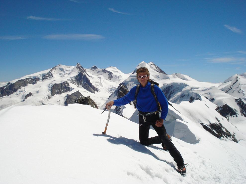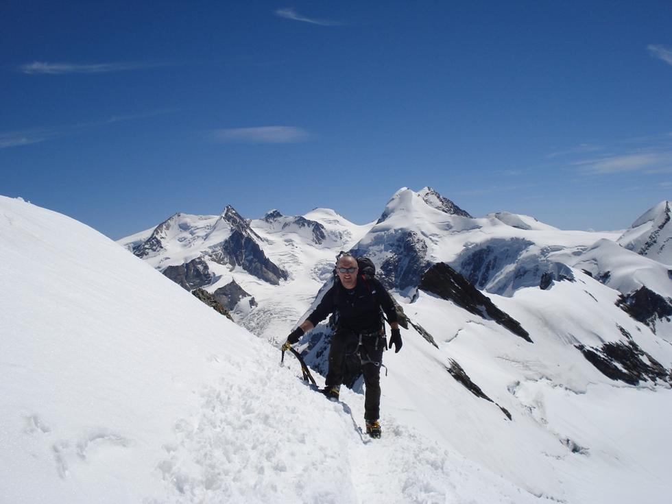 Partiti da Plateau Rosà con la seconda benna in circa tre ore e mezza giungiamo in vetta al Breihorn centrale dopo aver raggiunto il colle tra la quota 4016 e il Breithorn orientale. Superate numerose cordate e fatta tutta la parte rocciosa in conserva. Condizioni super e tempo splendido. Scendiamo velocemente al colle fra i due Breithorn dove incontriamo Bruno e sua moglie Franca ed assieme a loro proseguiamo per la vetta occidentale.