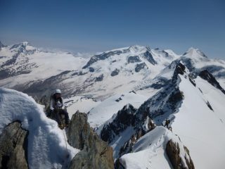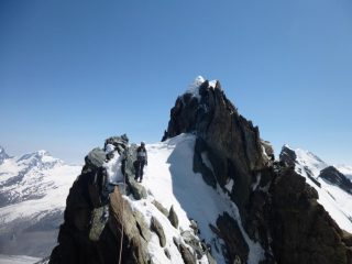 Ottime condizioni in zona, buon rigelo notturno, crepacci ben chiusi. Fatta solo la traversata del Breithorn centrale. La terminale prima di arrivare all’attacco della cresta si passa agevolmente. Fatta tutta con i ramponi ai piedi visto che i tratti nevosi si alternano diverse volte con le parti in roccia., comunque nei passaggi piu’ delicati la roccia e gli appigli sono sempre ben puliti.