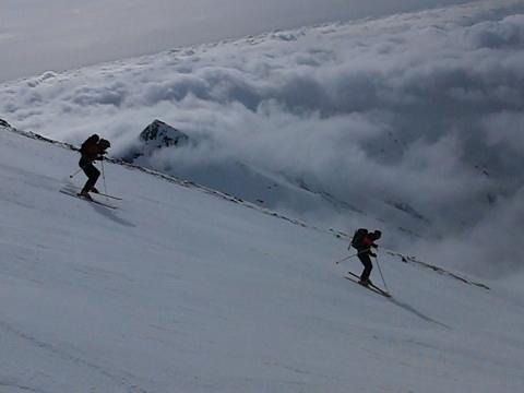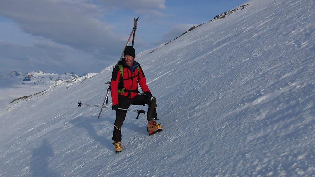 Volevamo tentare la sud-est passando dall’anticima: purtroppo il poco rigelo notturno ha reso impraticabili i traversi per raggiungere il versante sud-est, si sprofondava fino alla pancia! Notte insonne all’invernale del Cà d’Asti con poche coperte bagnate e tre pseudo materassi anch’essi fradici posati sul freddo pavimento in pietra…sconsigliabile! I pendii di discesa oggi erano perfetti con neve dura e compatta ma con ottimo grip fino quasi alla riposa, poi crosta sfundusa.