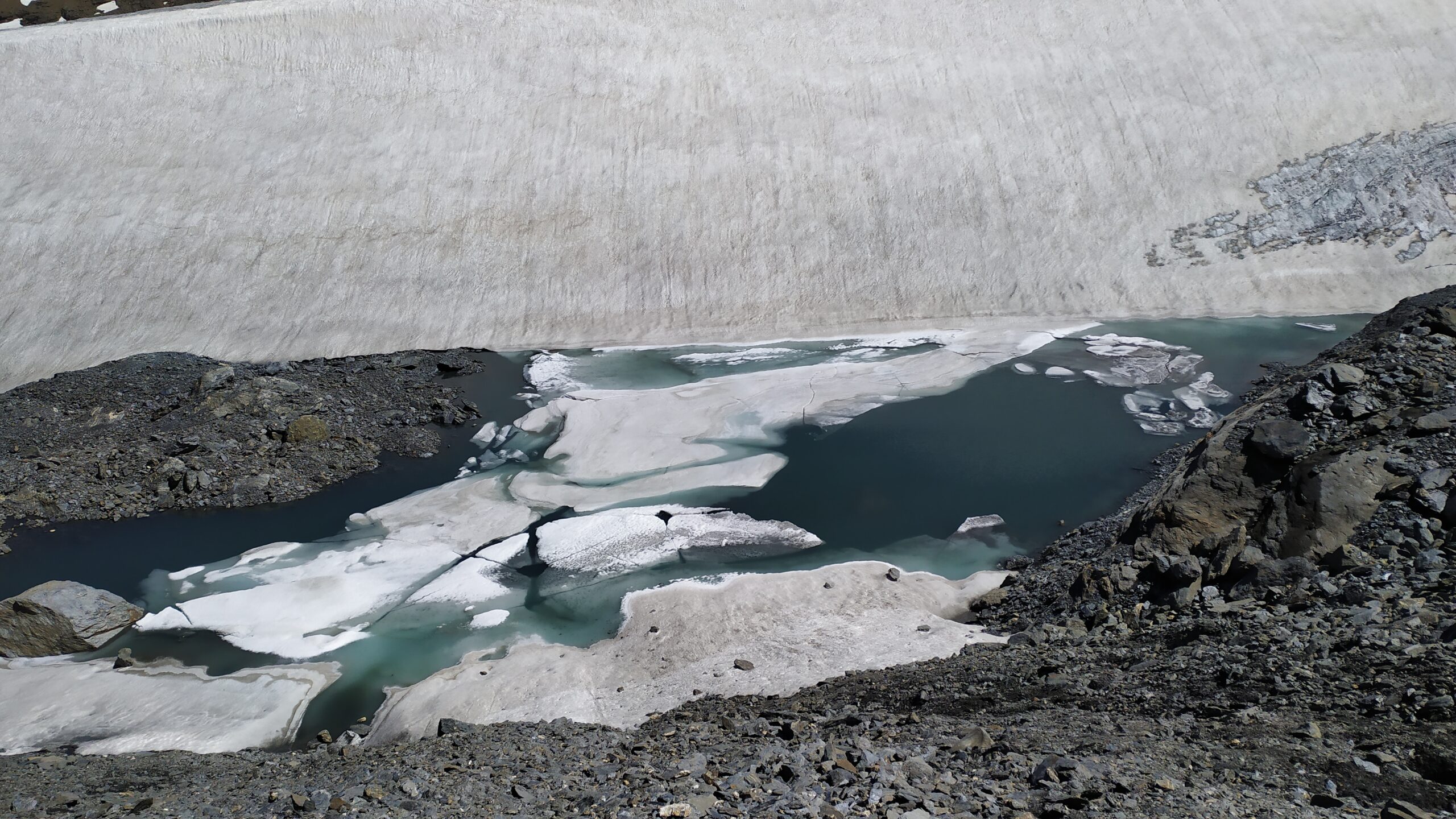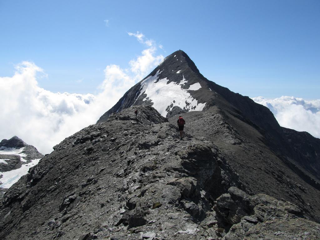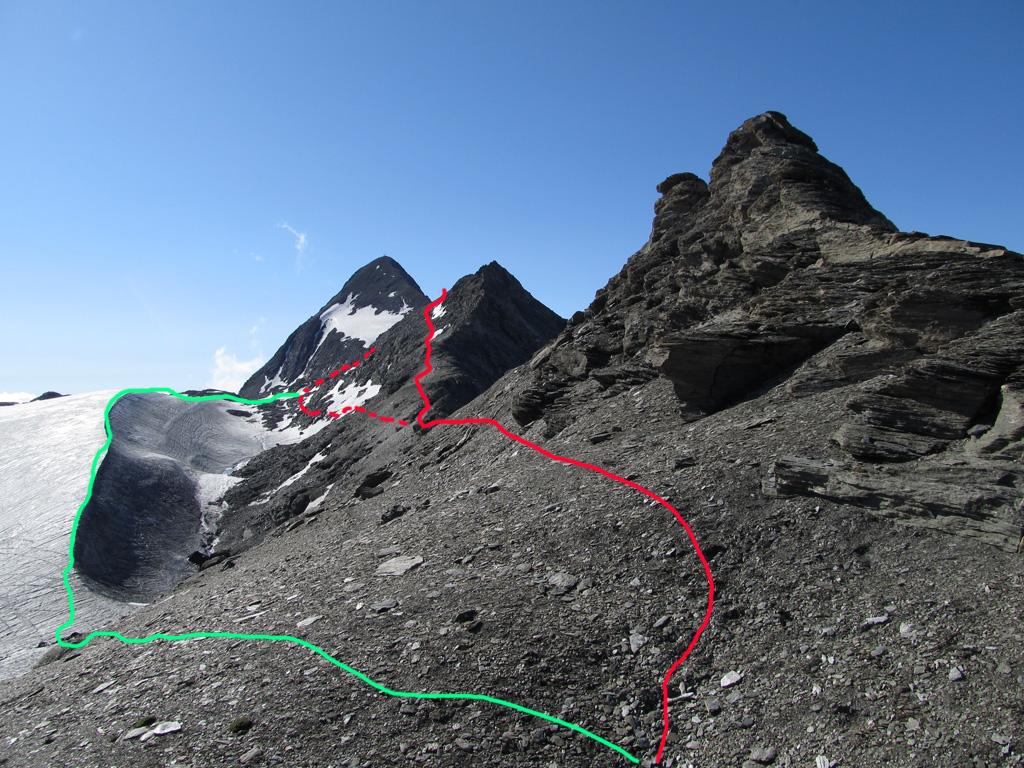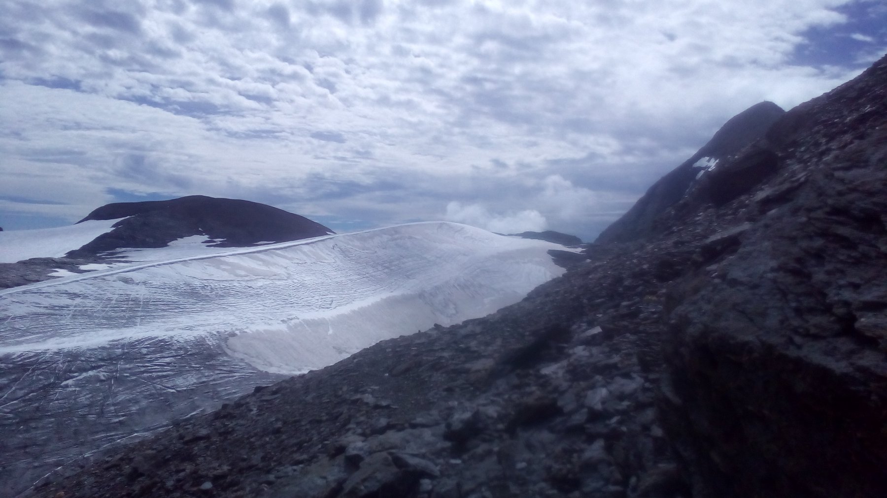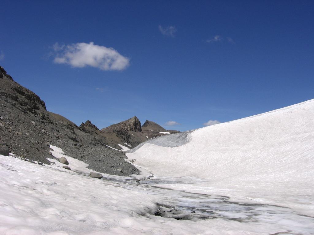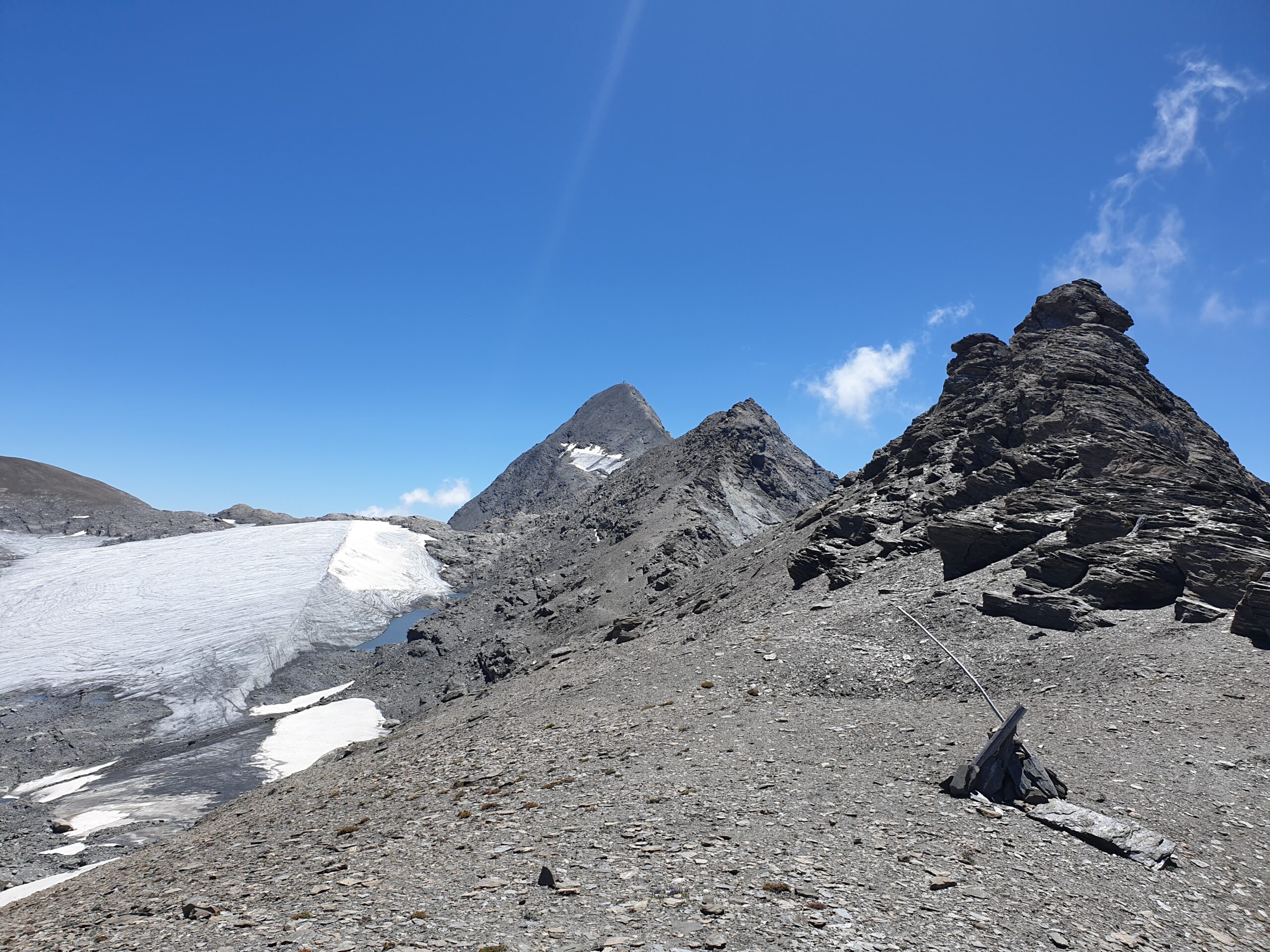 Finalmente in lontananza si vede il Rocciamelone, ma l’avvicinamento non è finito. Si procede a mezza costa su detriti alla destra del ghiacciaio seguendo rari ometti e tracce, man mano conviene alzarsi fino a raggiungere il filo di cresta dopo aver aggirato i torrioni rocciosi di uno spuntone, oppure ancora più comodo conviene porre piede sul ghiacciaio (non servono ramponi in quanto è pianeggiante) passando sull’ampio dosso del bordo dell’ex laghetto effimero ora svuotato). Si raggiunge la traccia che sale dal Colle della Resta (Rifugio Tazzetti) o sul ghiacciaio o direttamente sul crestone detritico se non si è scesi, e finalmente si è alla base del pendio finale della piramide del Rocciamelone.