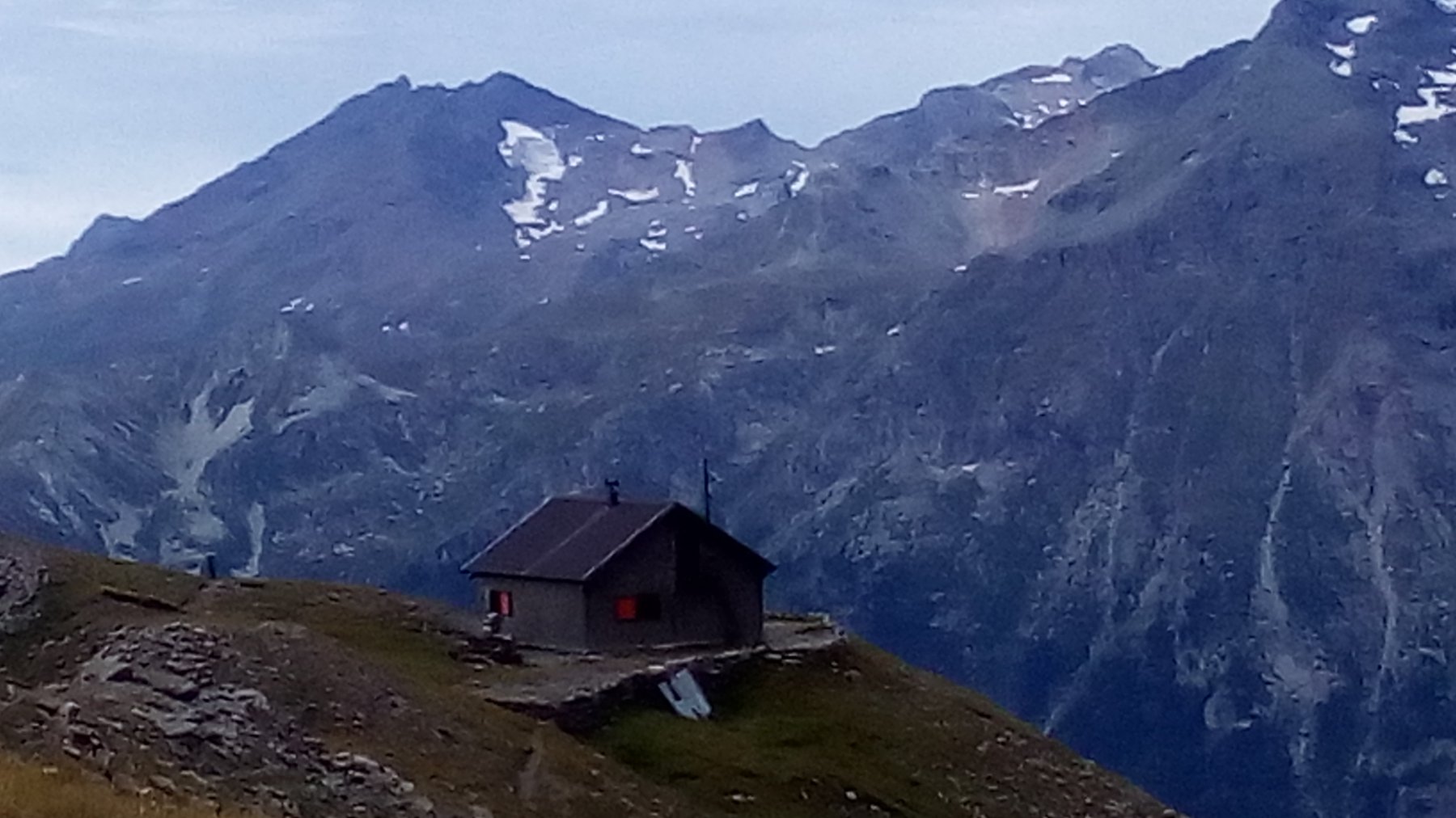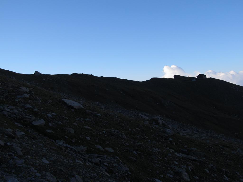 Da questo colletto si prosegue a mezza costa con il rifugio già ben visibile. Non è necessario passare al Rifugio posto sulla Punta Carolei, ma comunque la deviazione costa 1 minuto.