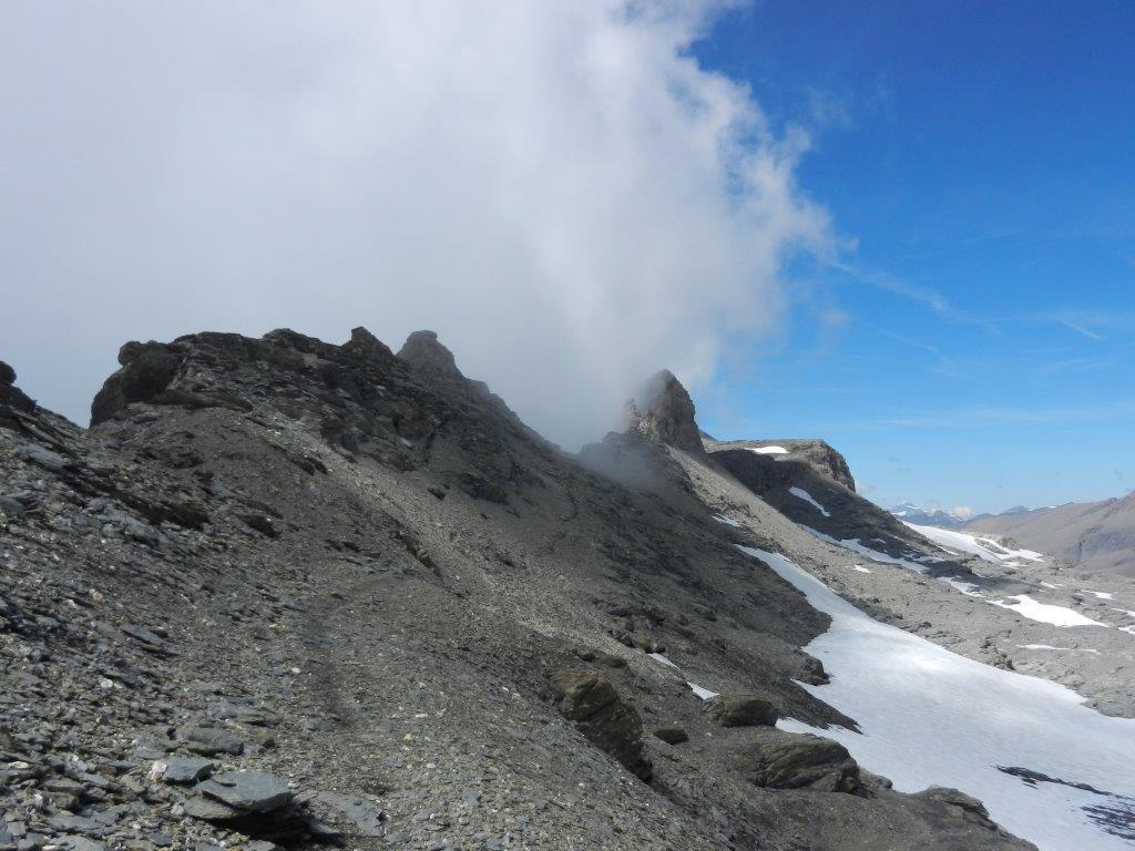 Si rimonta la crestina di rocce ed erba passando nei pressi dei serbatoi dell’acqua, e poi si inizia un lungo traverso ascendente, attraversando una vasta pietraia di rocce di piccola e media dimensione, qualche tratto si rivela un po’ faticoso ma mai pericoloso (può essere consigliabile il casco per eventuali pietre smosse in alto da animali). L’unico punto leggermente più ostico è una breve placca inclinata ricoperta di detriti, non troppo esposto (si cammina sempre). Giunti in vista del Passo di Novalesa, il percorso si fa più ripido e a tratti faticoso, ma in breve si arriva sotto l’intaglio, dove si nota un cavo metallico che aiuta la progressione se si vuole salire direttamente, altrimenti si può passare ancora più facilmente sulle roccette di destra aiutandosi con le mani sbucando al Passo di Novalesa 3220 m.