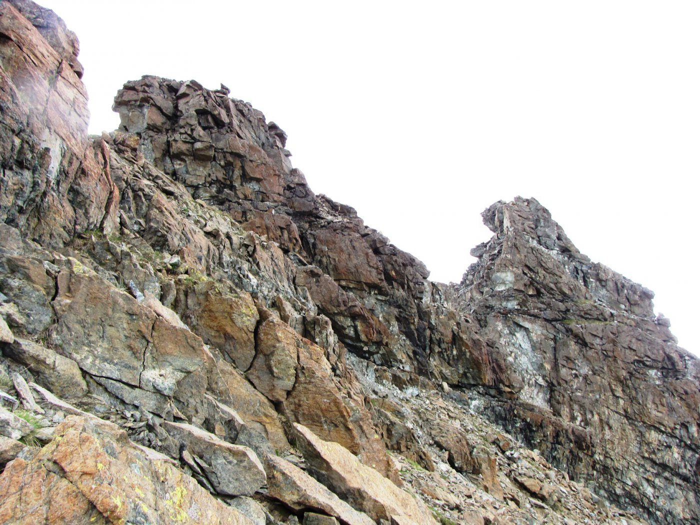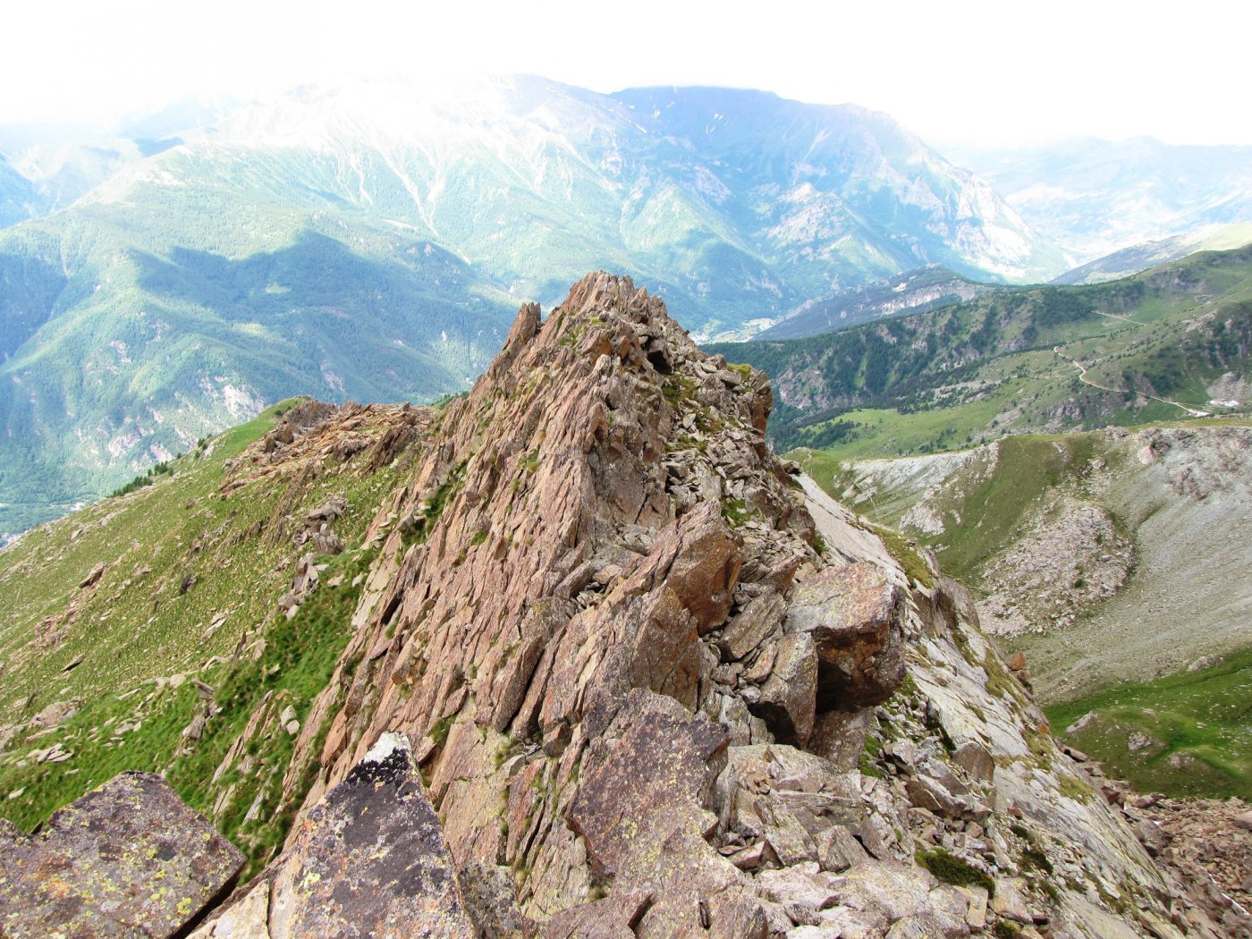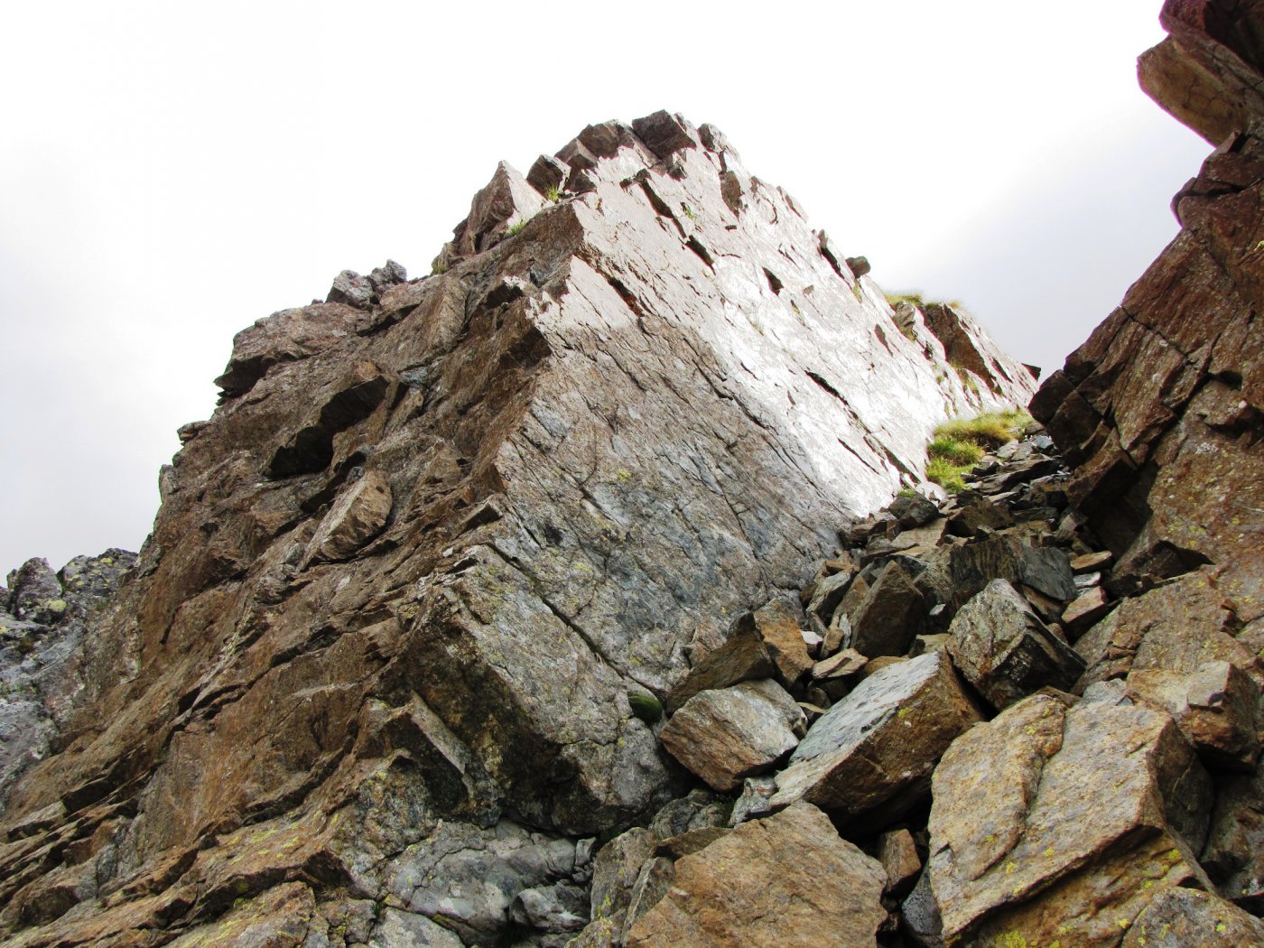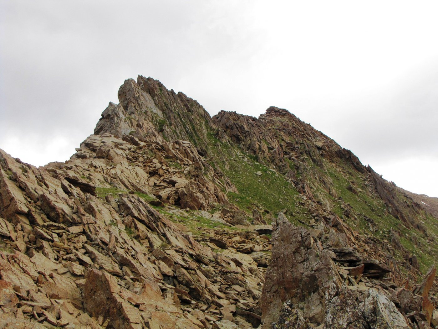 La prima parte è costituita da blocchi facili ed erba, quindi segue un bel torrione ben visibile già da sotto: se si segue il filo si trovano dei bei passaggi sul II° e su roccia sana, altrimenti ci si tiene bassi sui prati di dx e si evitano le difficoltà. Dopo questa parte più stretta e verticale segue un tratto facile a grossi blocchi e quindi un pezzo in piano. Quindi la cresta si impenna di nuovo, presentando sempre passaggi facili e divertenti ma mai obbligati.
