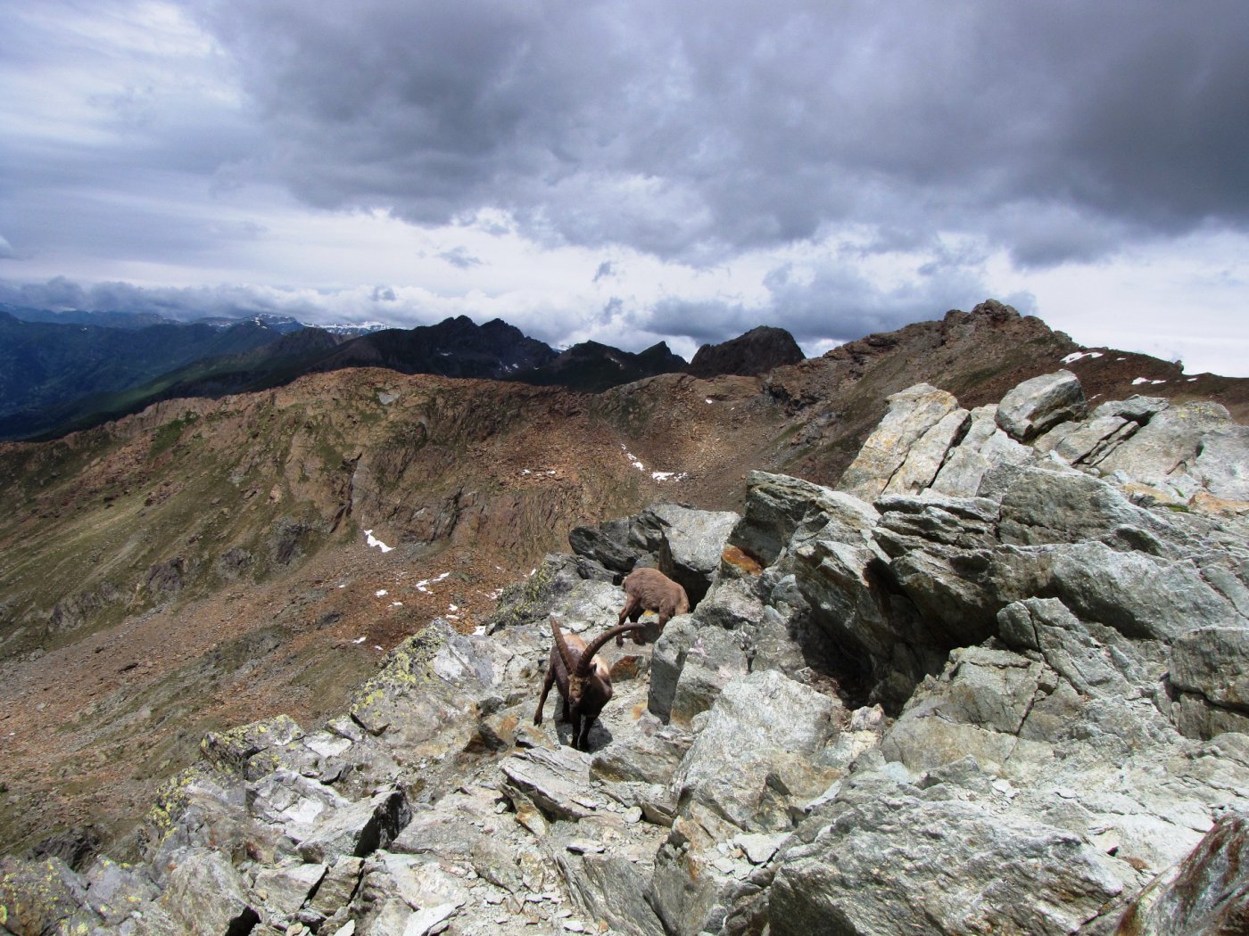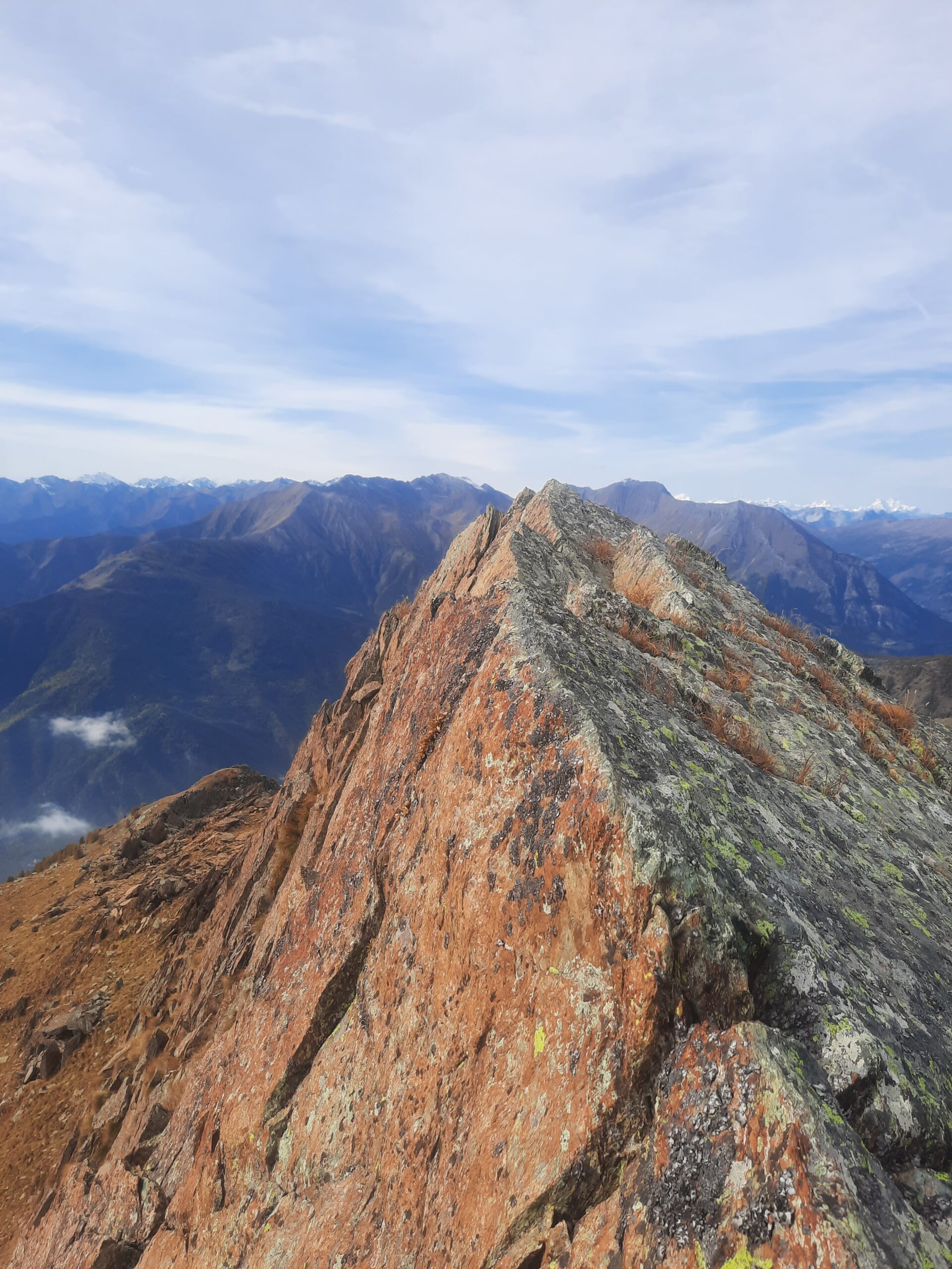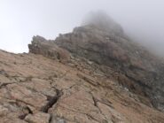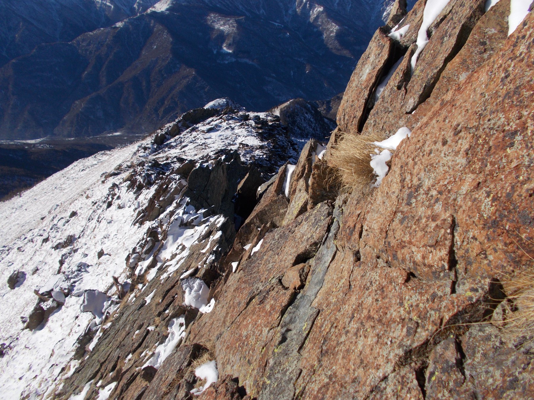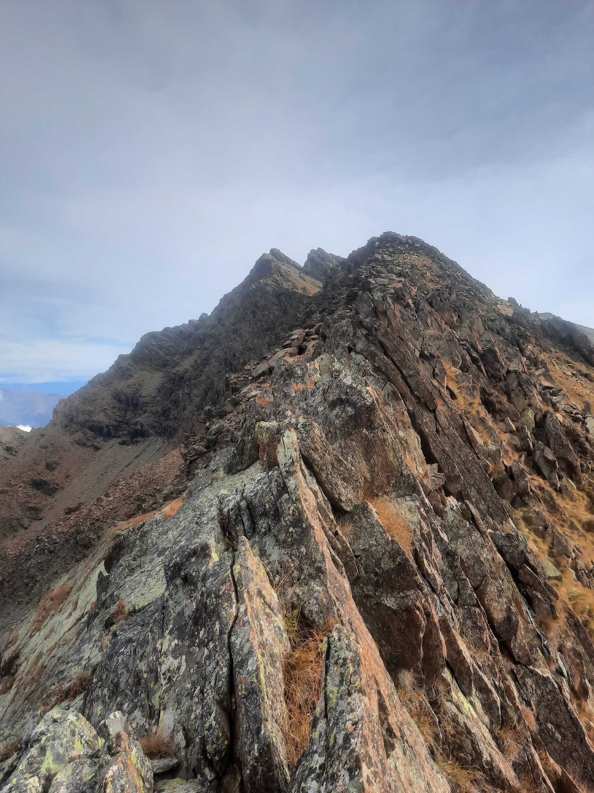 La prima parte è costituita da blocchi facili ed erba, quindi segue un bel torrione ben visibile già da sotto: se si segue il filo si trovano dei bei passaggi sul II° e su roccia sana, altrimenti ci si tiene bassi sui prati di dx e si evitano le difficoltà. Dopo questa parte più stretta e verticale segue un tratto facile a grossi blocchi e quindi un pezzo in piano. Quindi la cresta si impenna di nuovo, presentando sempre passaggi facili e divertenti ma mai obbligati.