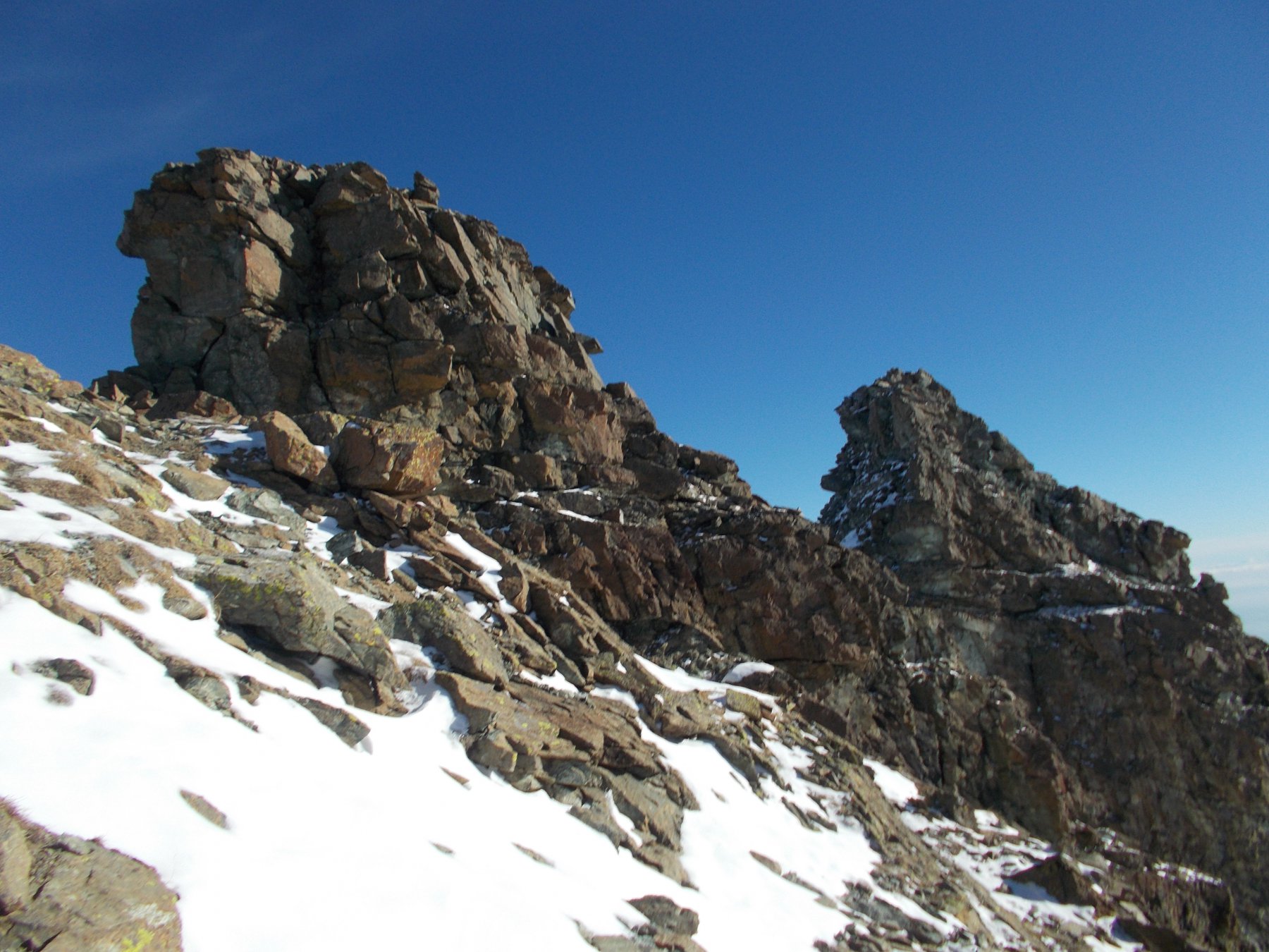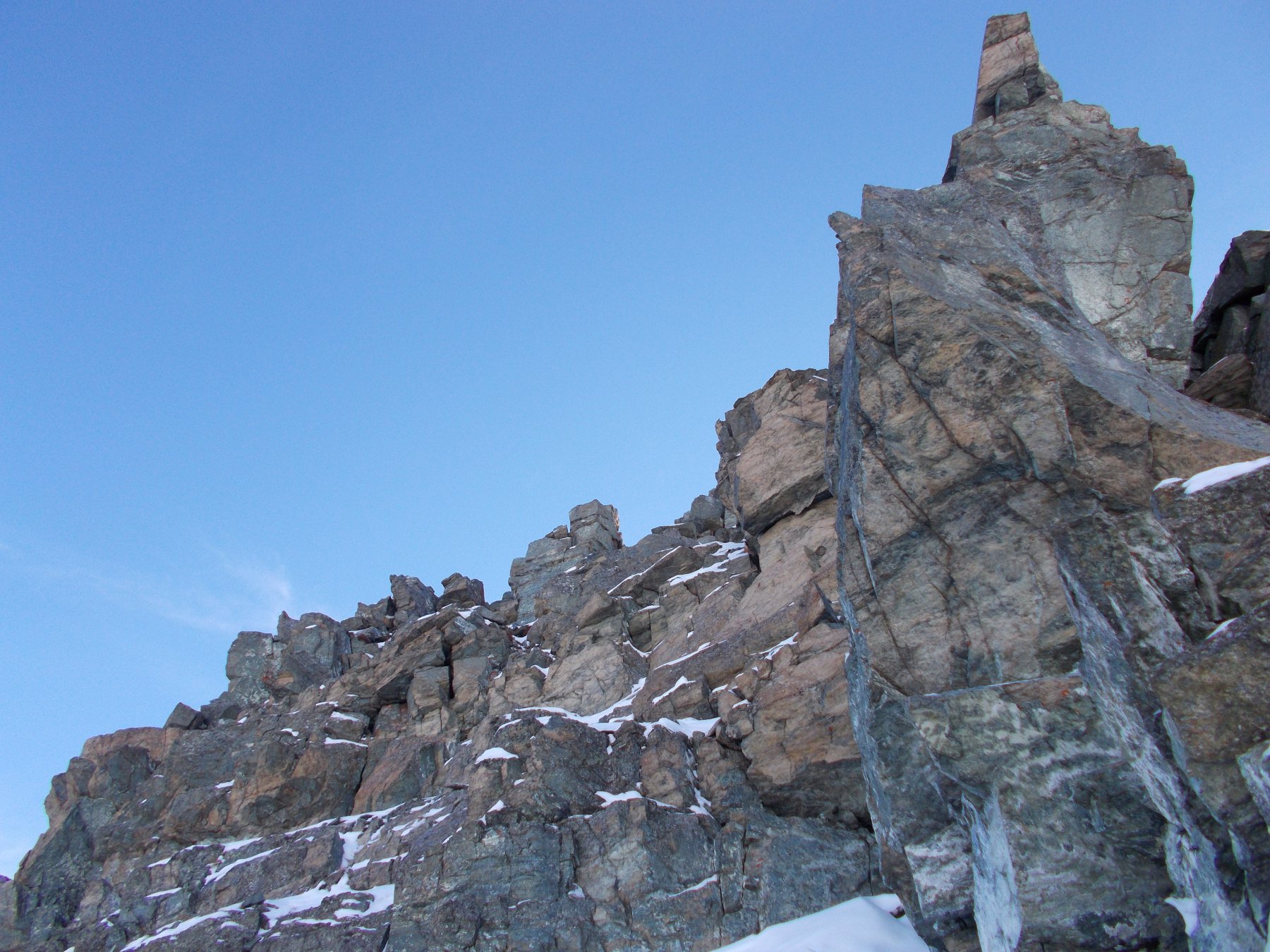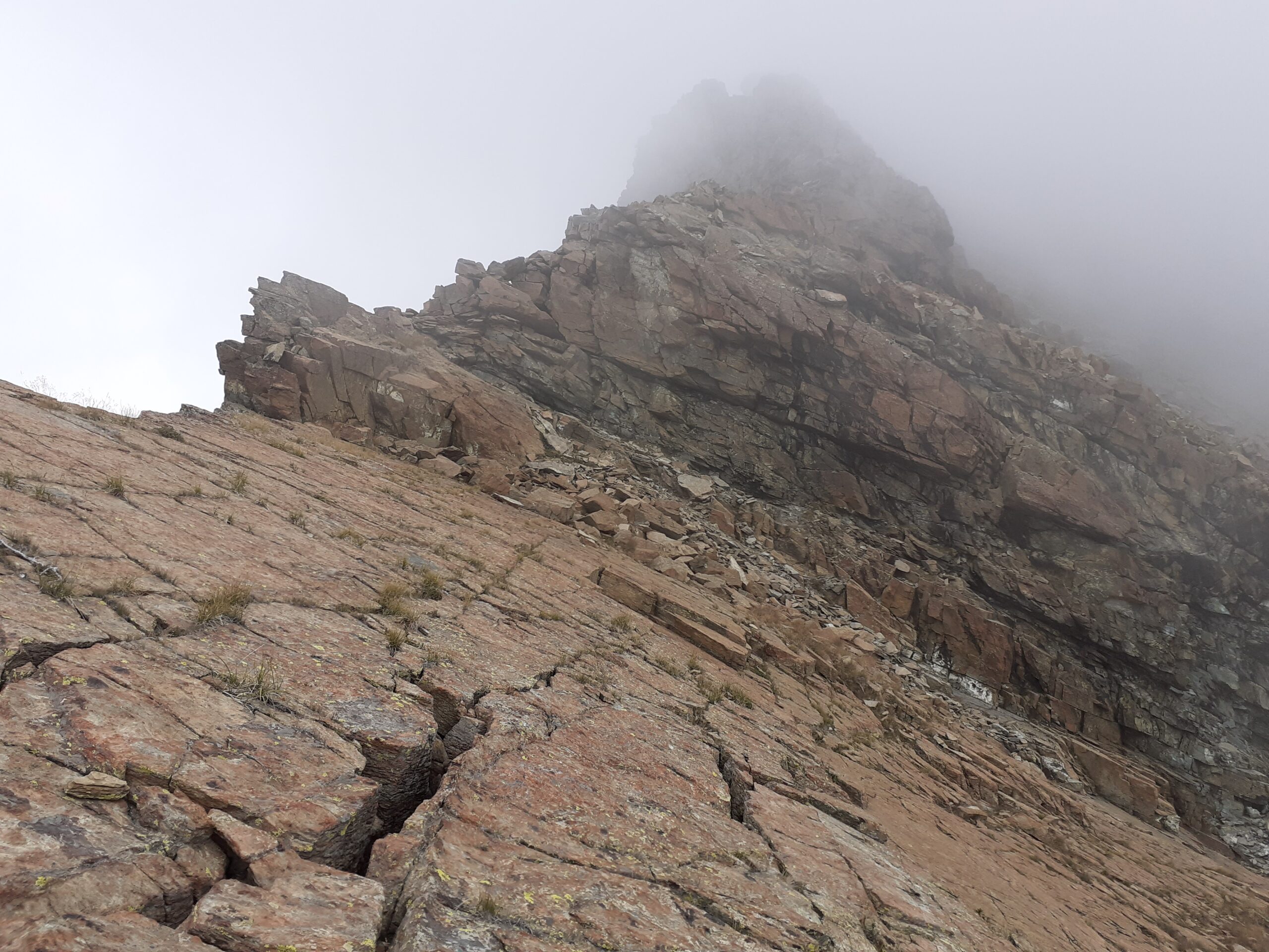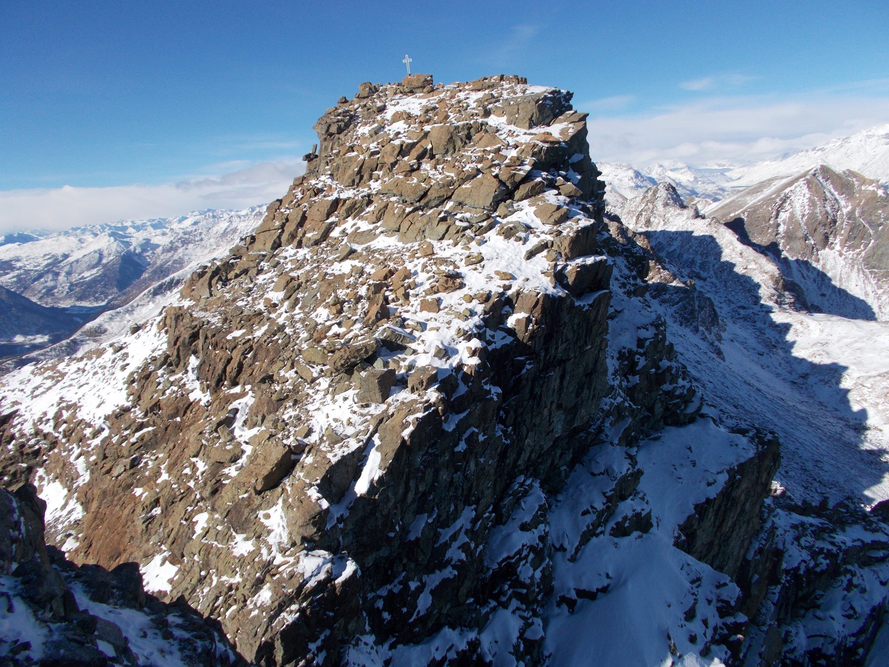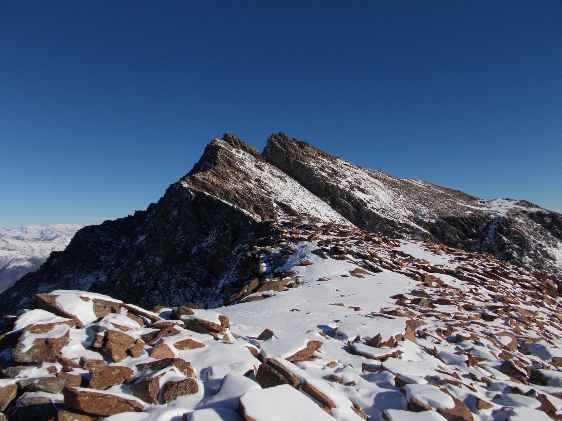 Si raggiunge così la cima NO (la più bassa, m 2772), da dove con una breve discesa su sfasciumi si raggiunge il colletto fra le due cime. Con una successiva risalita sul ripido versante nord per gradoni e infine un camino un po’ esposto (II) (roccia un po’ più dubbia – grossi blocchi ma da testare con attenzione) si raggiunge la cima principale (la SE, 2778m).