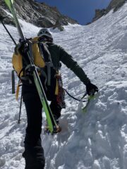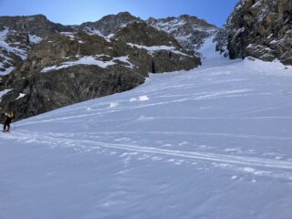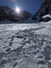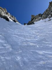 Parte alta ripida 45+ gradi, molto tecnica e impegnativa: alternanza di neve dura e morbida, lavorata dai precedenti passaggi.. difficile da sciare.