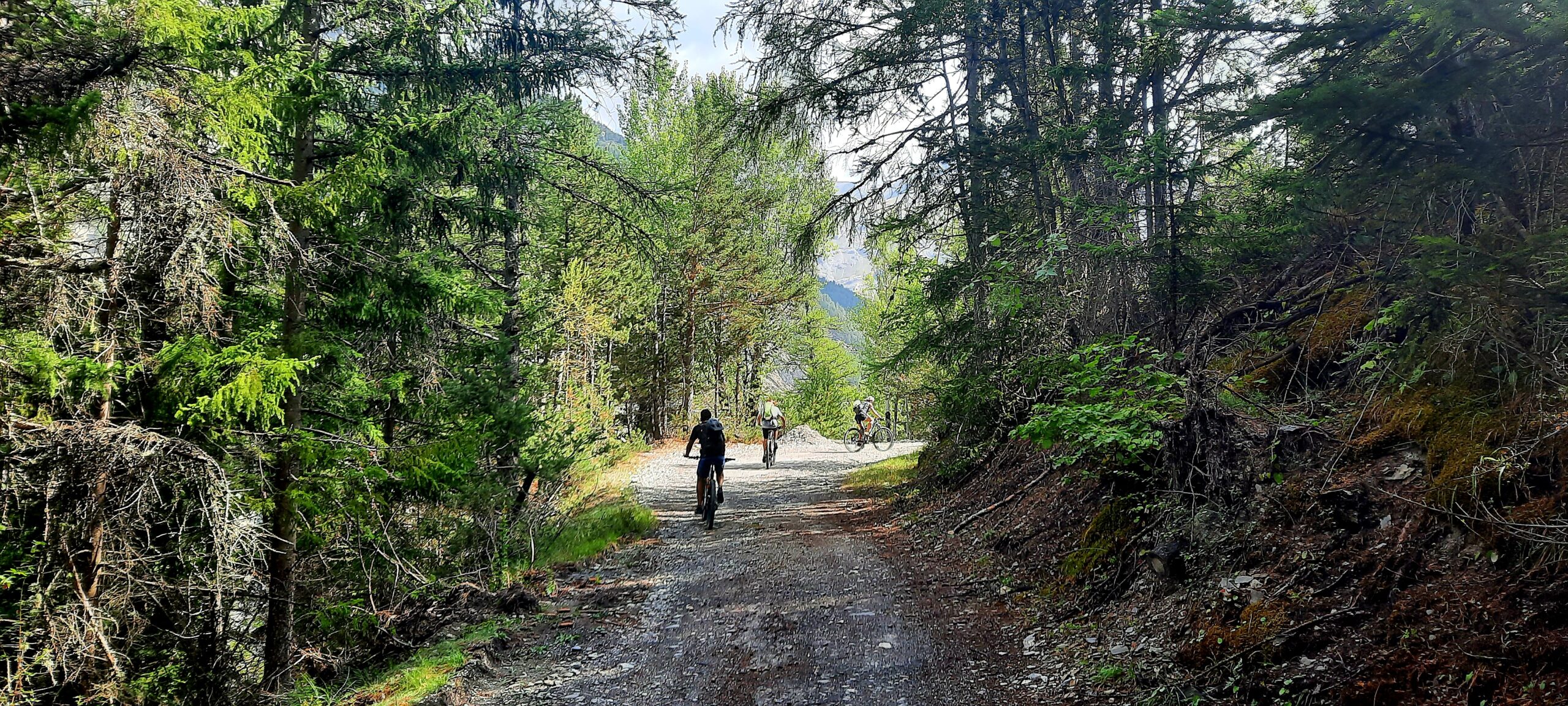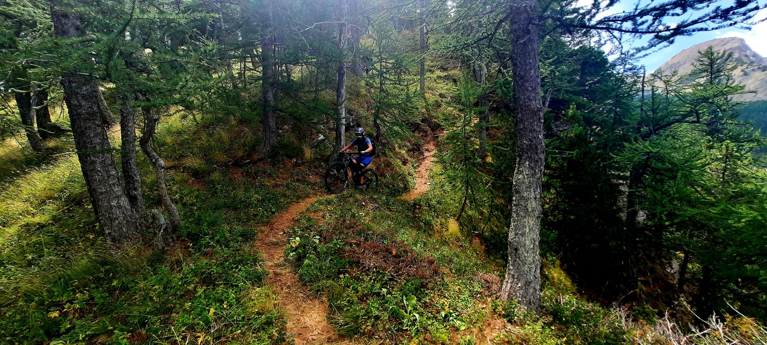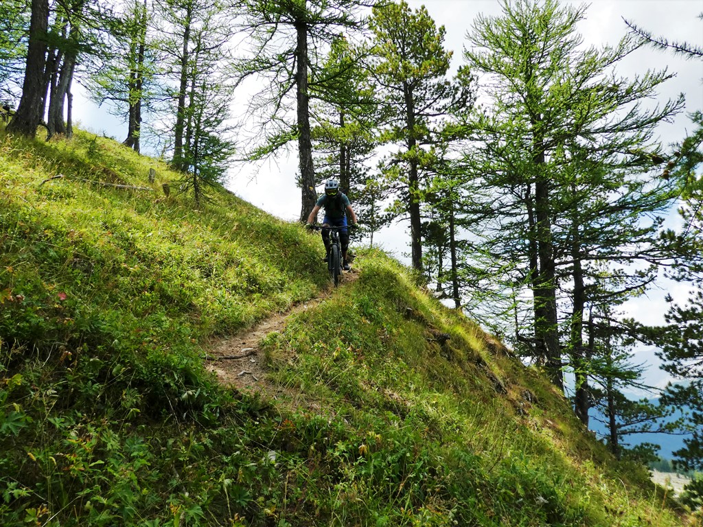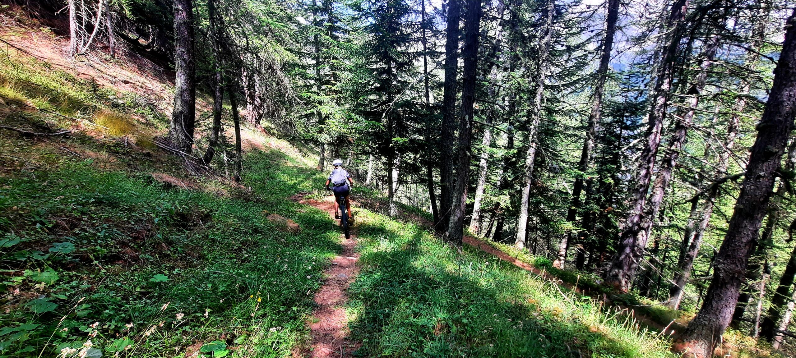 Si ritorna per la militare e poco dopo si trova sulla dx l’inizio del single track che divalla nel bosco (palina). Con percorso facile si scende fino ad incrociare un altro tratturo, si continua in discesa con percorso divertente incrociando una sterrata che va seguita verso dx. Subito dopo la stradina si restringe a tratturo ed incrocia una sterrata da seguire a sx per ricongiungersi alla carrozzabile che sale da Meyronnes. Si continua a sx e con un tratto in falsopiano ci si riporta sul percorso di salita in corrispondenza della cisterna dell’acqua da cui si fa ritorno all’auto peril percorso di salita.