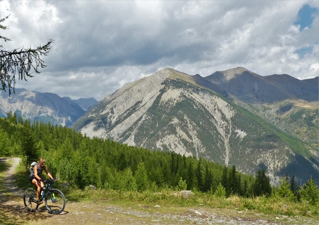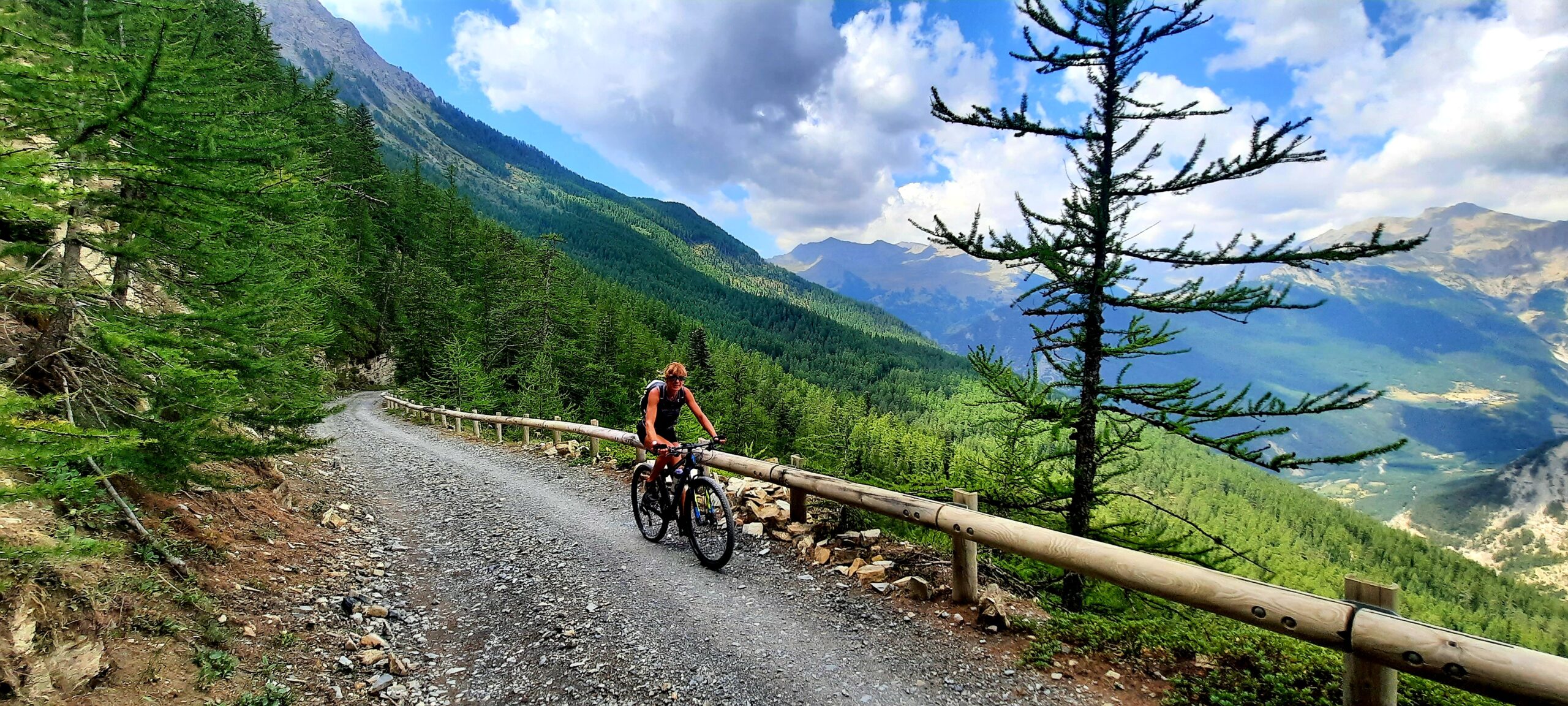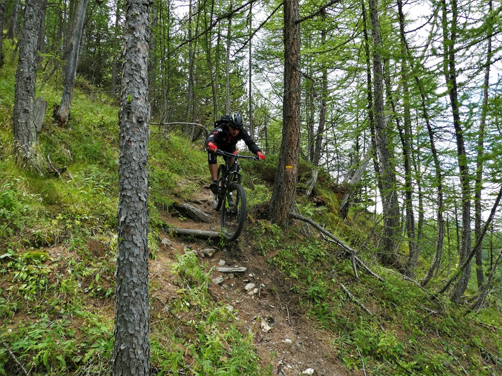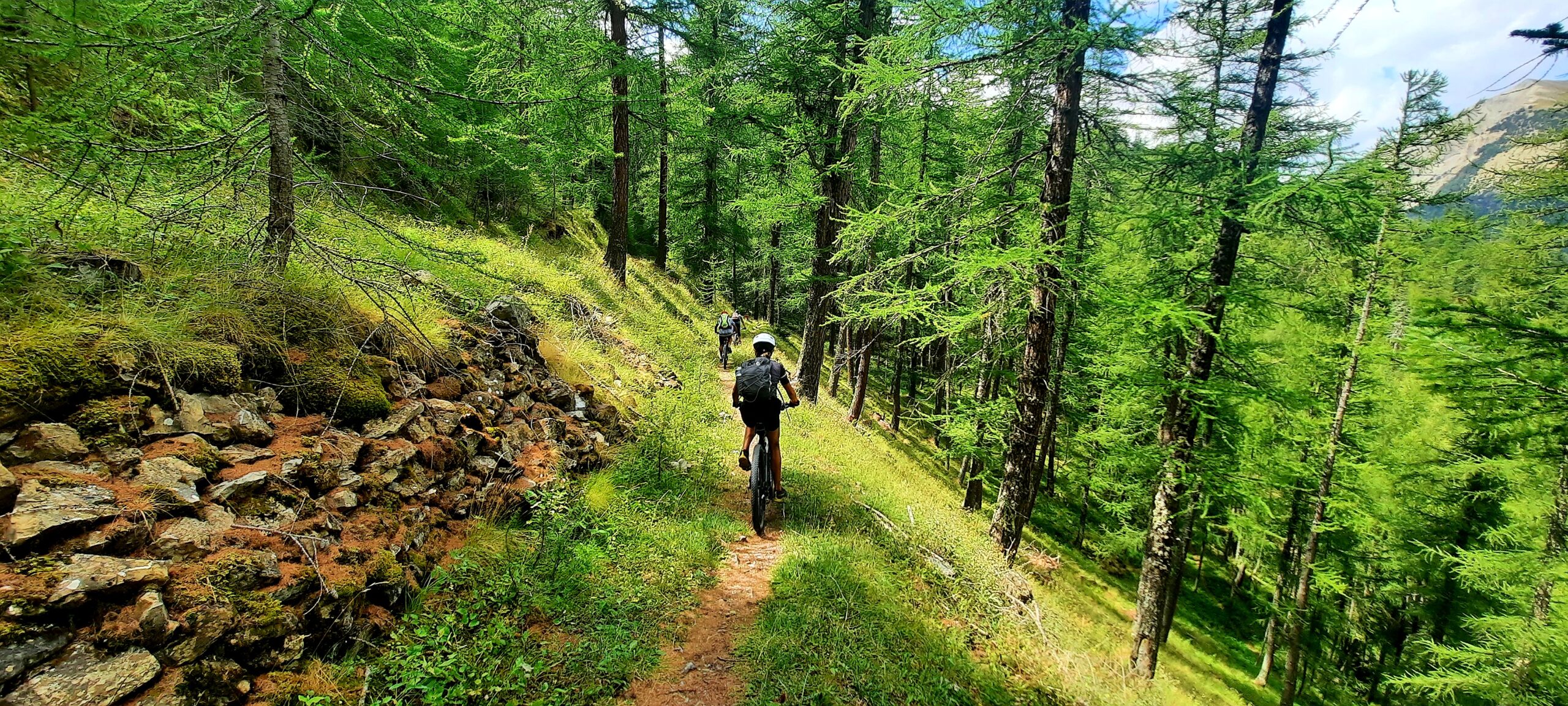 Si ritorna per la militare e poco dopo si trova sulla dx l’inizio del single track che divalla nel bosco (palina). Con percorso facile si scende fino ad incrociare un altro tratturo, si continua in discesa con percorso divertente incrociando una sterrata che va seguita verso dx. Subito dopo la stradina si restringe a tratturo ed incrocia una sterrata da seguire a sx per ricongiungersi alla carrozzabile che sale da Meyronnes. Si continua a sx e con un tratto in falsopiano ci si riporta sul percorso di salita in corrispondenza della cisterna dell’acqua da cui si fa ritorno all’auto peril percorso di salita.