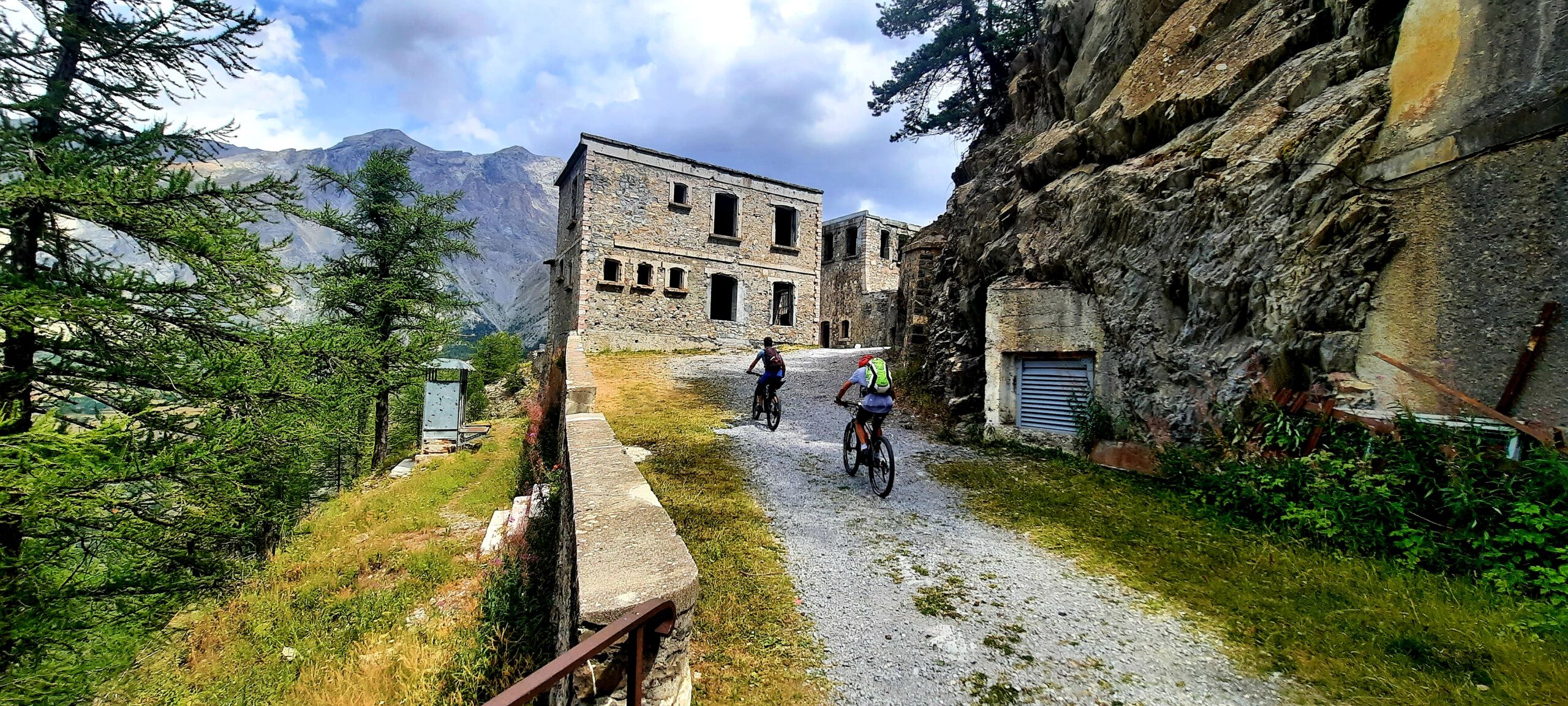 Per la discesa si seguono le tacche gialle che aggirano il forte dal versante opposto a quello di salita. In breve il sentiero diventa molto ripido e a tratti esposto richiedendo un’ottima tecnica di discesa. Arrivati a monte del forte inferiore si prosegue a sx dove la traccia porta a divallare sulla militare quota 1900 m. In breve a dx si raggiunge anche il forte inferiore ben più esteso del precedente dove si gode di un’ottima vista su tutta la valle che scende dal colle della Maddalena.