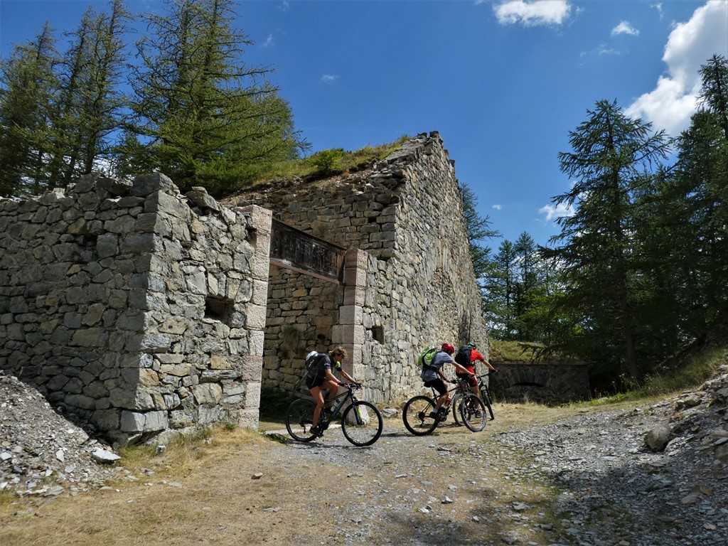 In un bosco misto di conifere si raggiunge un primo bivio nelle vicinanze del quale si trova una cisterna dell’acqua. Si continua a dx arrivando ad uno spiazzo dove è presente una fontana. Si pedala sulla dx e di fronte ad un bivio si prosegue a sx seguendo sempre le indicazioni per il forte. Un lungo e panoramico traverso porta a costeggiare una staccionata in legno.