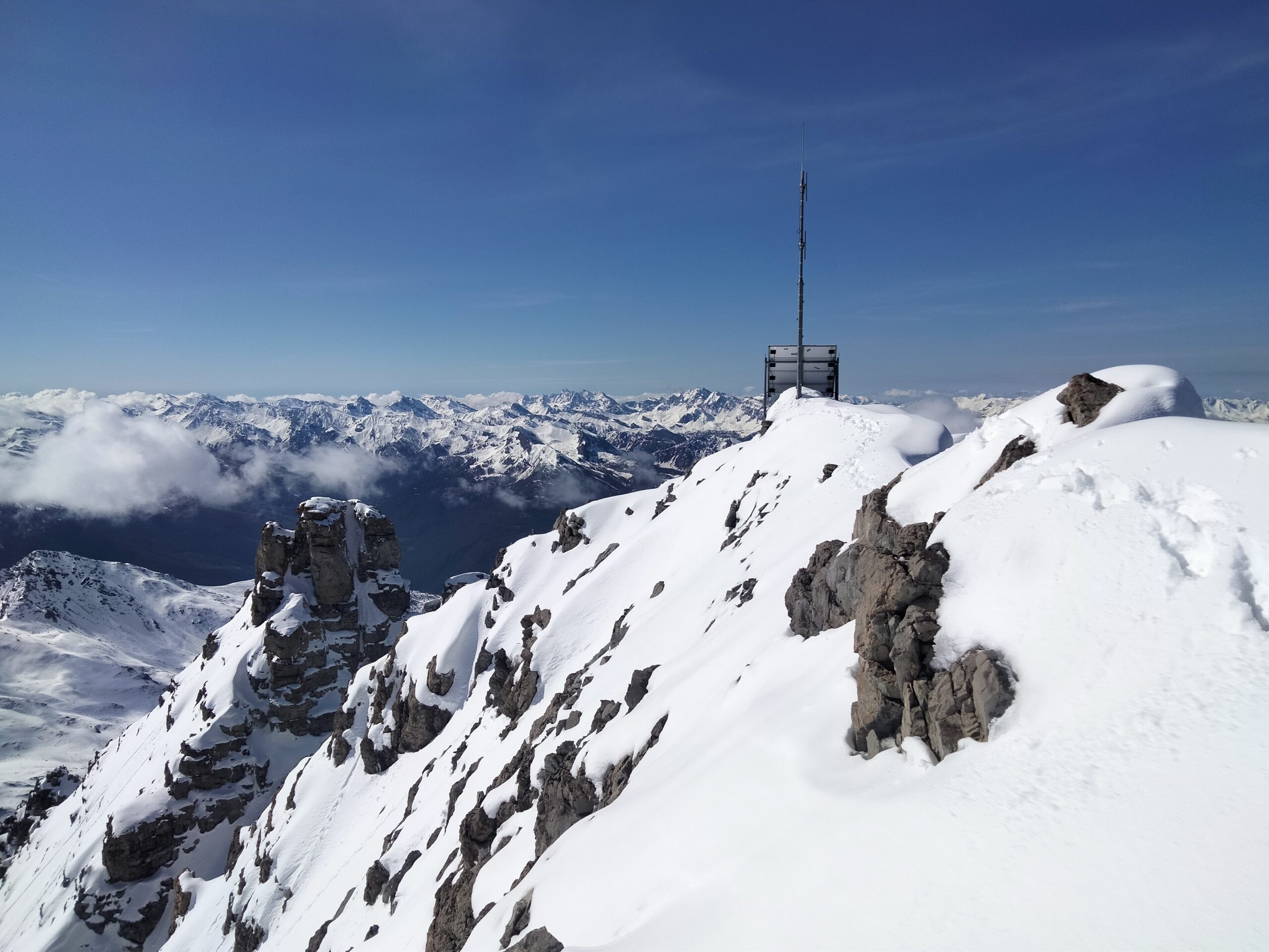 3min di portage dal pontino a q. 2050m (il cui attraversamento è il vero crux della gita, specie al mattino con -1° e la brina). Neve continua ma nei primi 100-200m a breve ci sarà qualche interruzione. Buono innevamento dai 2300m in su, utili i rampant dall’ultima rampa sotto il Col des Portes. Si sale ancora sci ai piedi comodamente fino ai 3100 poi conviene calzare i ramponi. Canale in condizioni abbastanza comode per la salita, sono presenti 3 strettoie: una bassa che in realtà è legata ad uno scivolamento di neve e poi 2 strettoie nell’ultima parte. Ho fatto la ca$$ata di lasciare gli sci alla breccia: quando mi sono affacciato nel canale E dopo la fissa e il traverso mi sono reso conto che era tutto perfettamente innevato e si sarebbe potuto partire sci ai piedi dalla cima…mannaggia a me. Dall’antenna ho ancora attraversato alla cima con la piattaforma (breve tratto roccioso con 2 fix) e da lì sono sceso diretto fino al traverso su pendenze minori e neve migliori. Partenza dalla breccia con 5 curve su 20cm di farina da lacrimuccia, 1° strettoia passabile mettendo gli sci dritti per 2m, la 2° invece va scalettata (con sci 178 si passa al pelo). La 3° si evita sciando sulle contropendenze di dx. Neve dura fino al Col des portes con un velo di fresca sopra, quindi ho optato per aspettare e scendere verso S fino al pianoro 2630, da lì breve ripellino fino al Col des Portes e giù dal versante N di salita su una crema al burro spaziale, mai sfondosa né collosa, fino a 3min dall’auto.