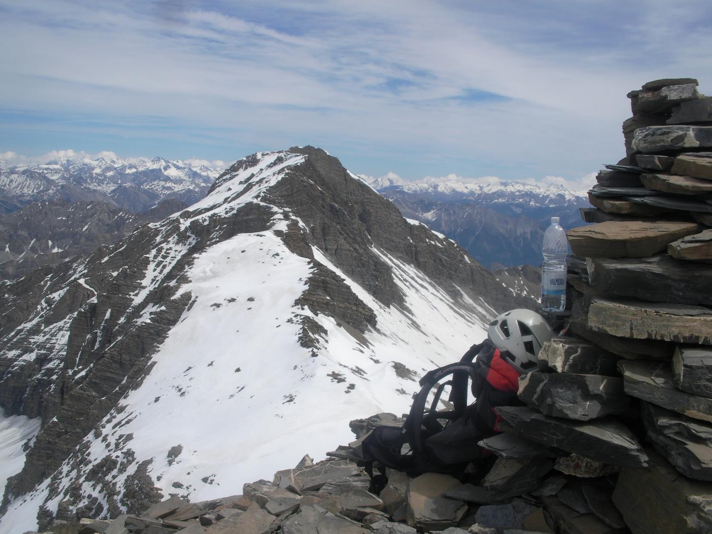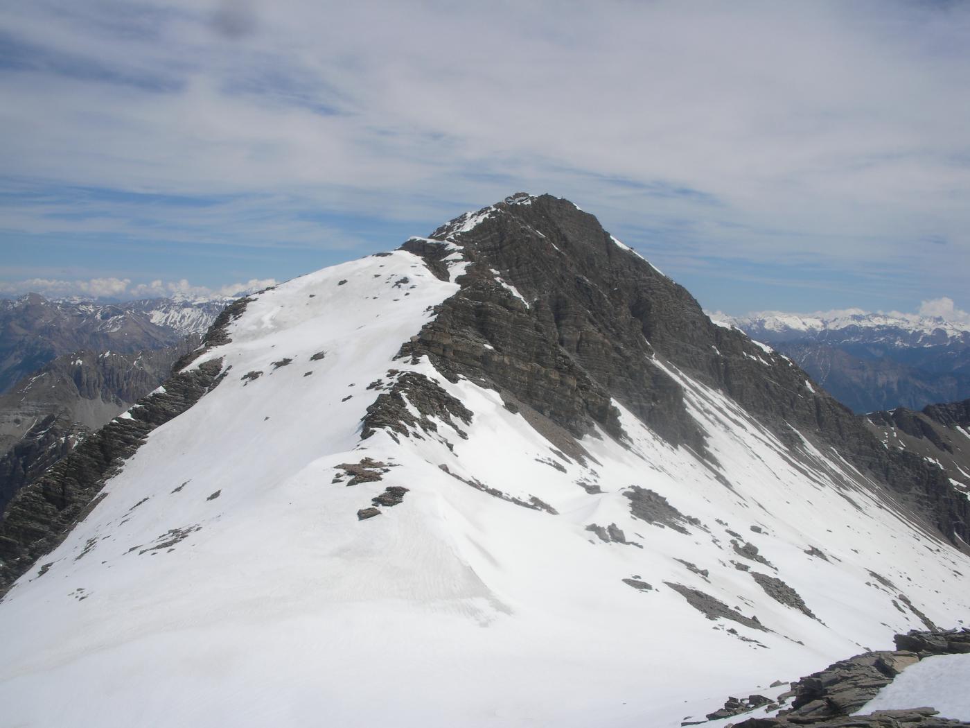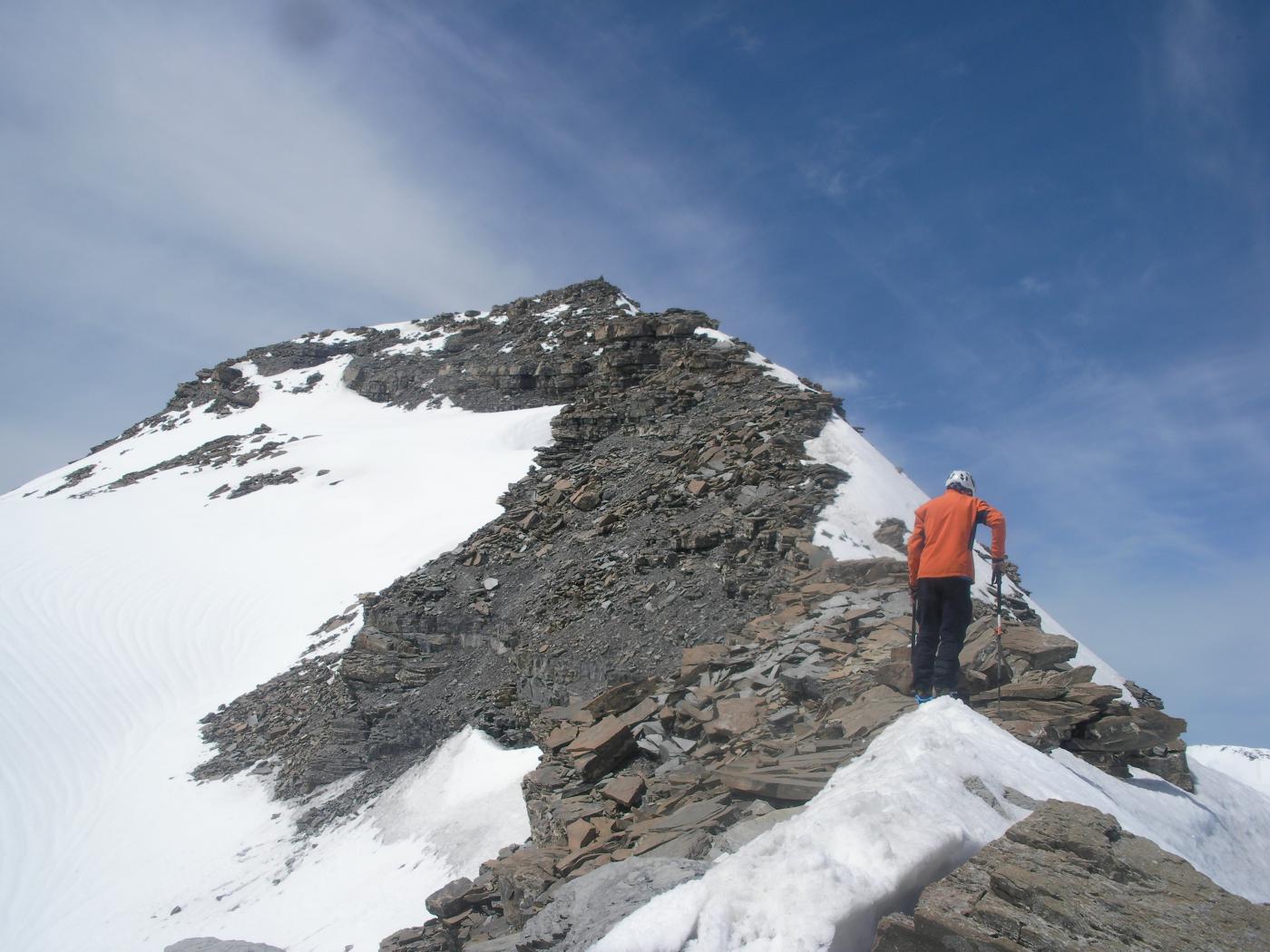 I plateau superiori decisamente meno ripidi, conducono in breve alla base dell’erto pendio che da accesso al colle, da dove poi svoltando a dx per cresta di roccia a scaglie mista a neve in meno di mezz’ora si e’ in vetta. (dalle 5 alle 6 ore dalla base in punta).