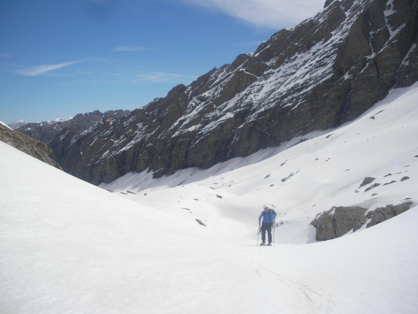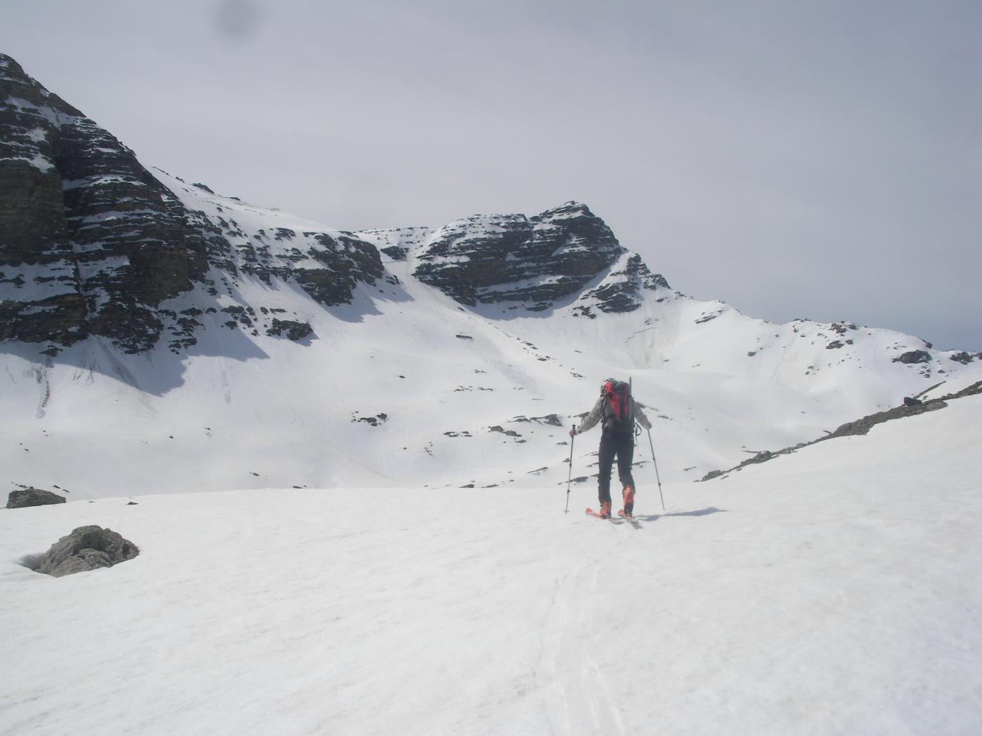 Dalla Cabane de la Mouthe prendere a risalire il vallone orientato nord-est badando di mantenersi sul suo estremo lato dx, onde evitare i risalti rocciosi che si notano sulla sx salendo.