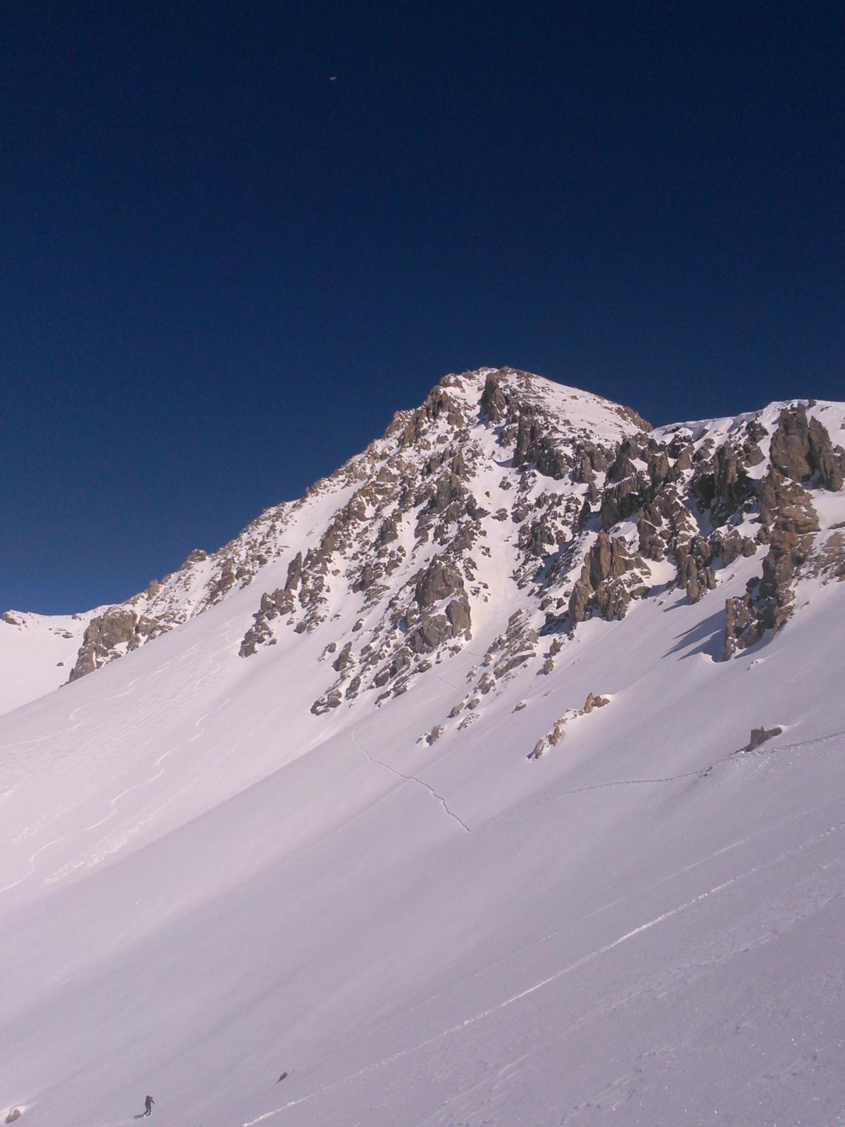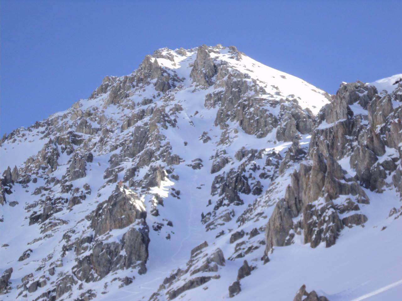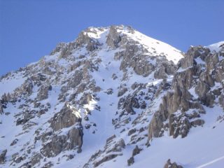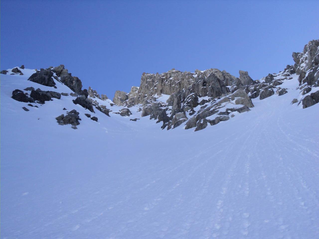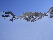 Da qui si perdono una cinquantina di mt di dislivello sull’altro versante obliquando verso destra e raggiungendo l’evidente attacco del canale che sale con orientamento sud-ovest fino in cima.