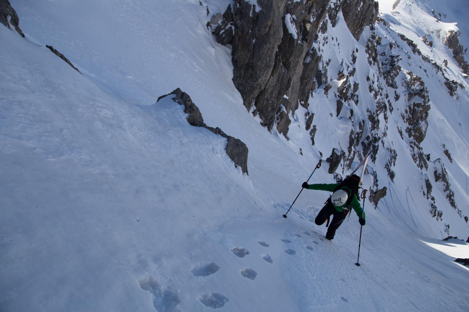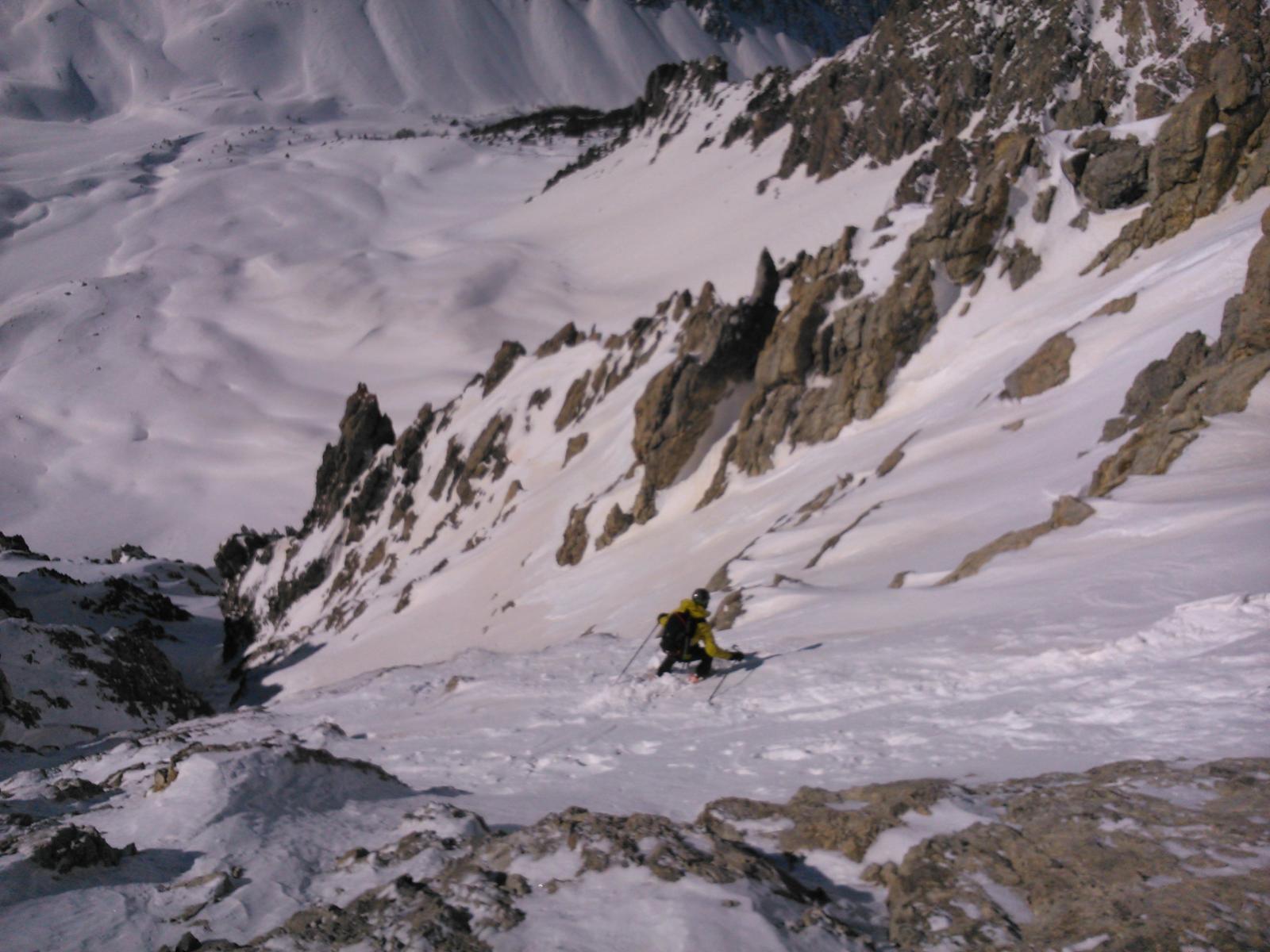 I primi 300 mi rimangono costanti sui 40°, poi eseguito un traverso entusiasmante su pendii sospesi al centro della parete, il canale prosegue via via più ripido (45° 100 m); l’uscita (50 m 50°) esposta a Sud presenta numerose roccette insidiose, risultando comunque sciabile con un entrata abbastanza tecnica.