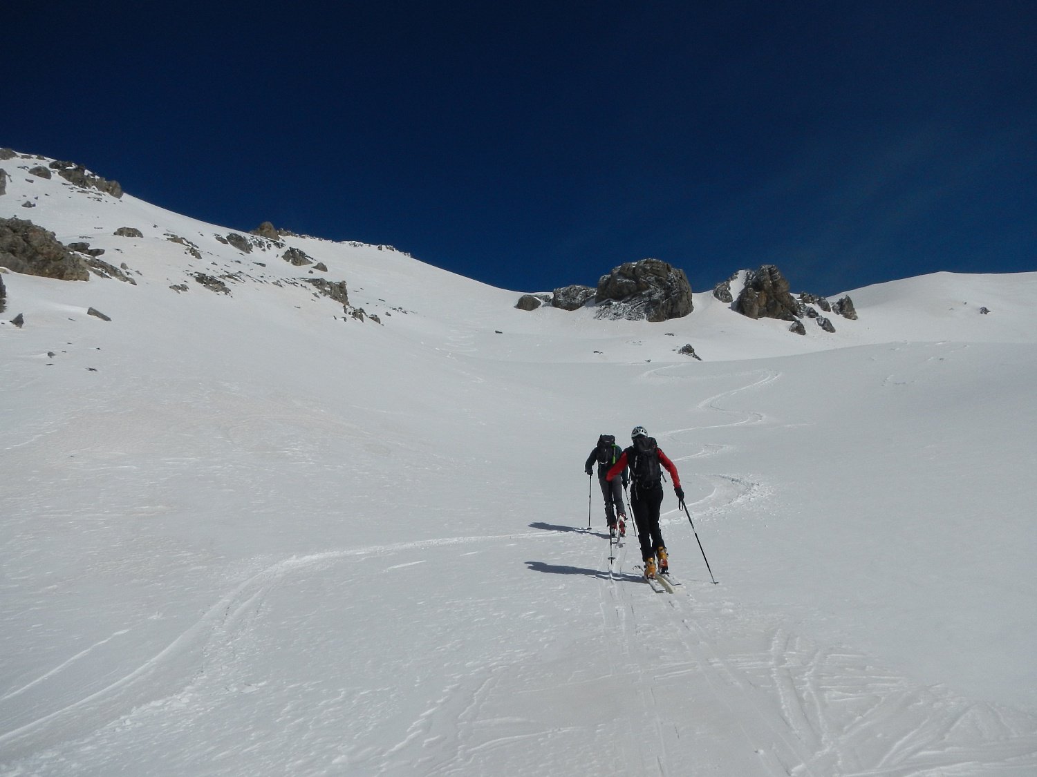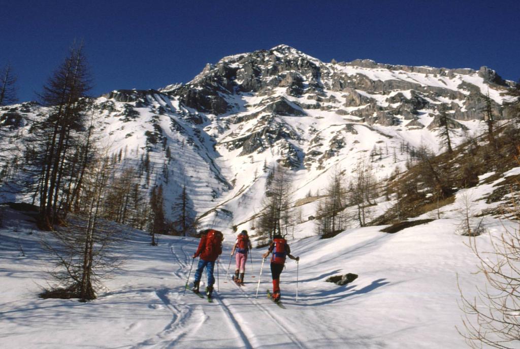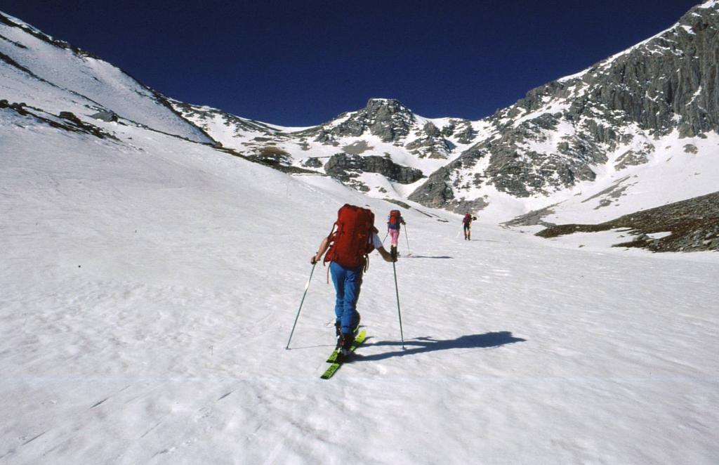 Appena possibile, ai primi tornanti, si abbandona la strada e, sulla sinistra, si prosegue nel bel valloncello (anche questo tratto richiede neve sicura) fin nei pressi del Pian dei Morti.
