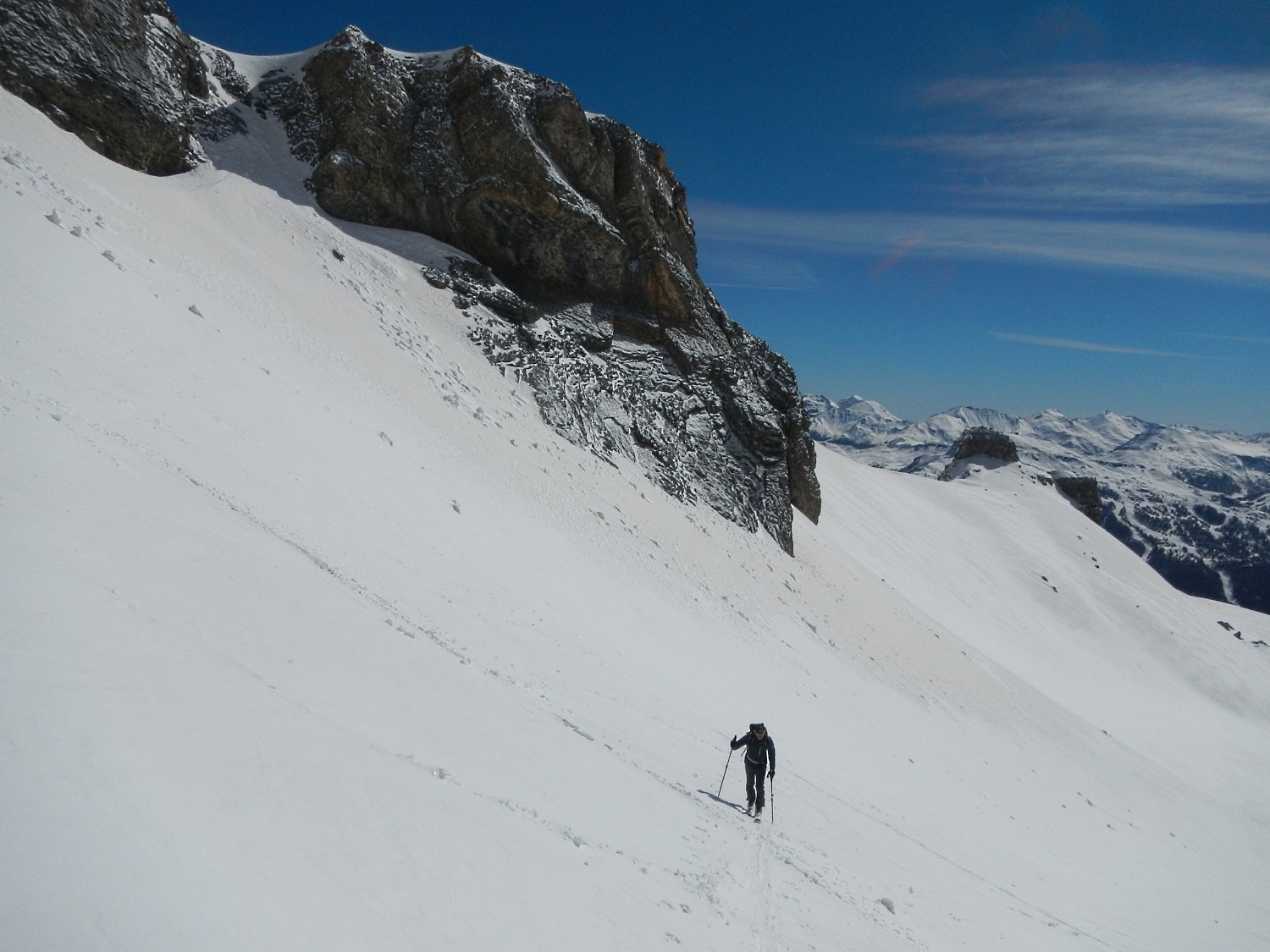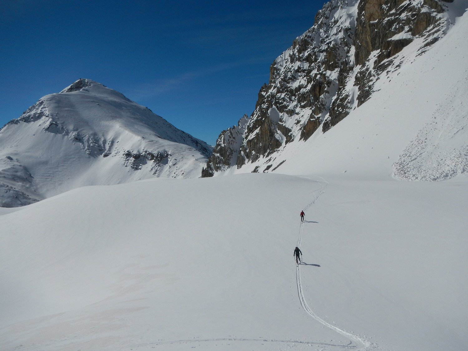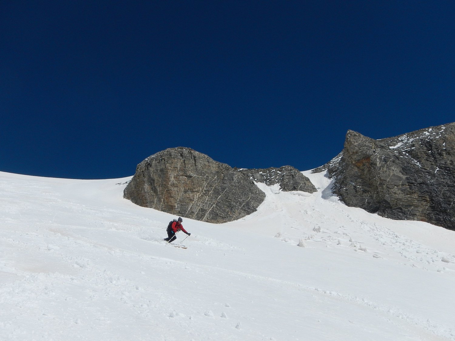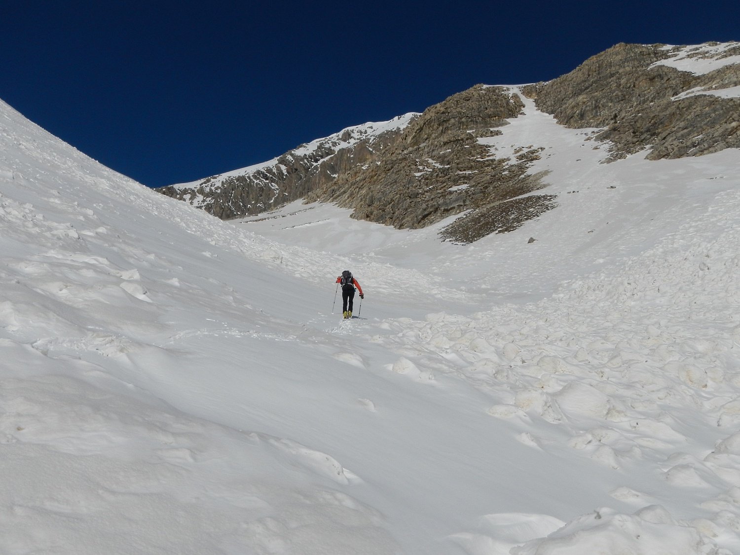 In genere gli sci si possono calzare a quota 1940 m., poco dopo l’incrocio con l’aspro valloncello di salita alla Chalance Ronde.