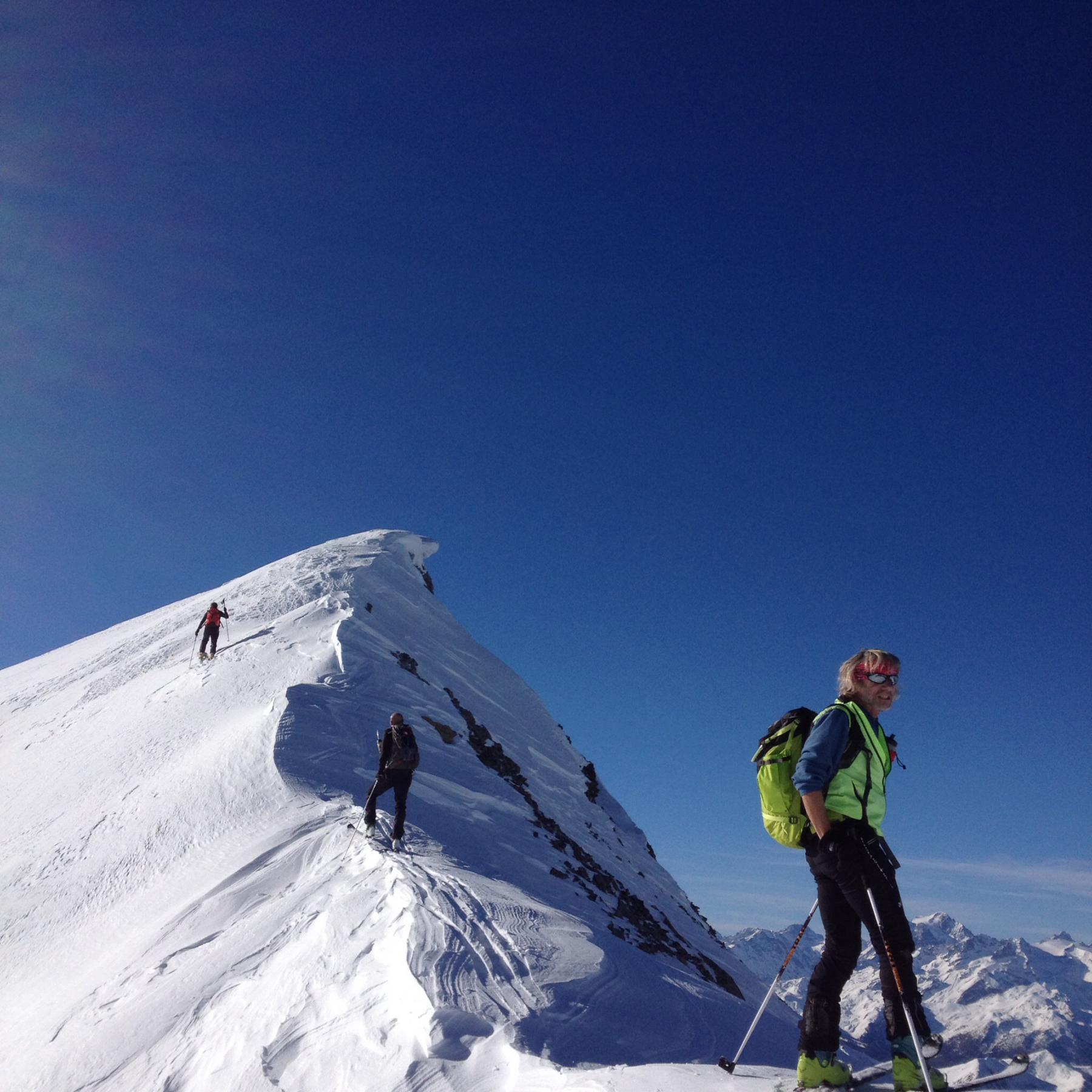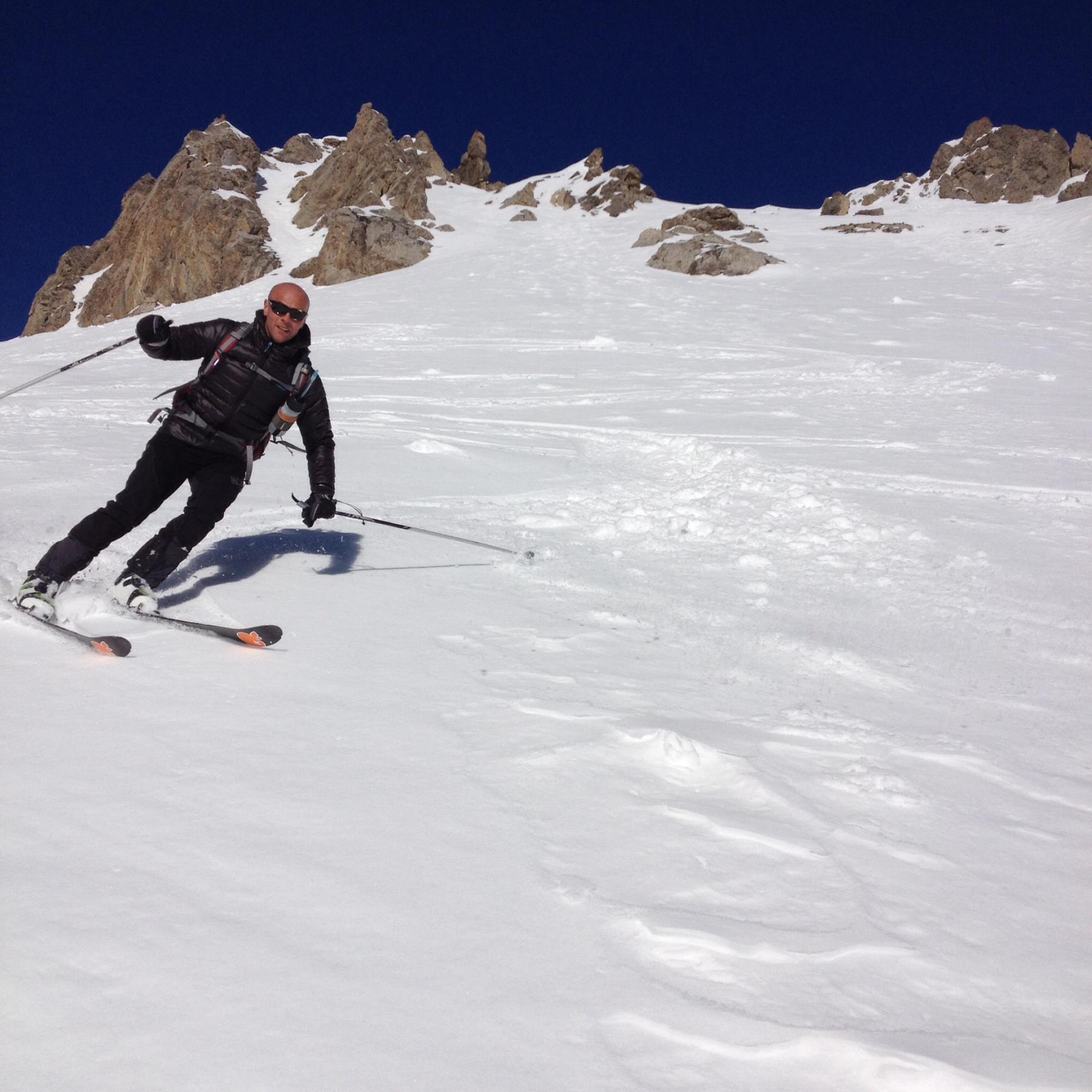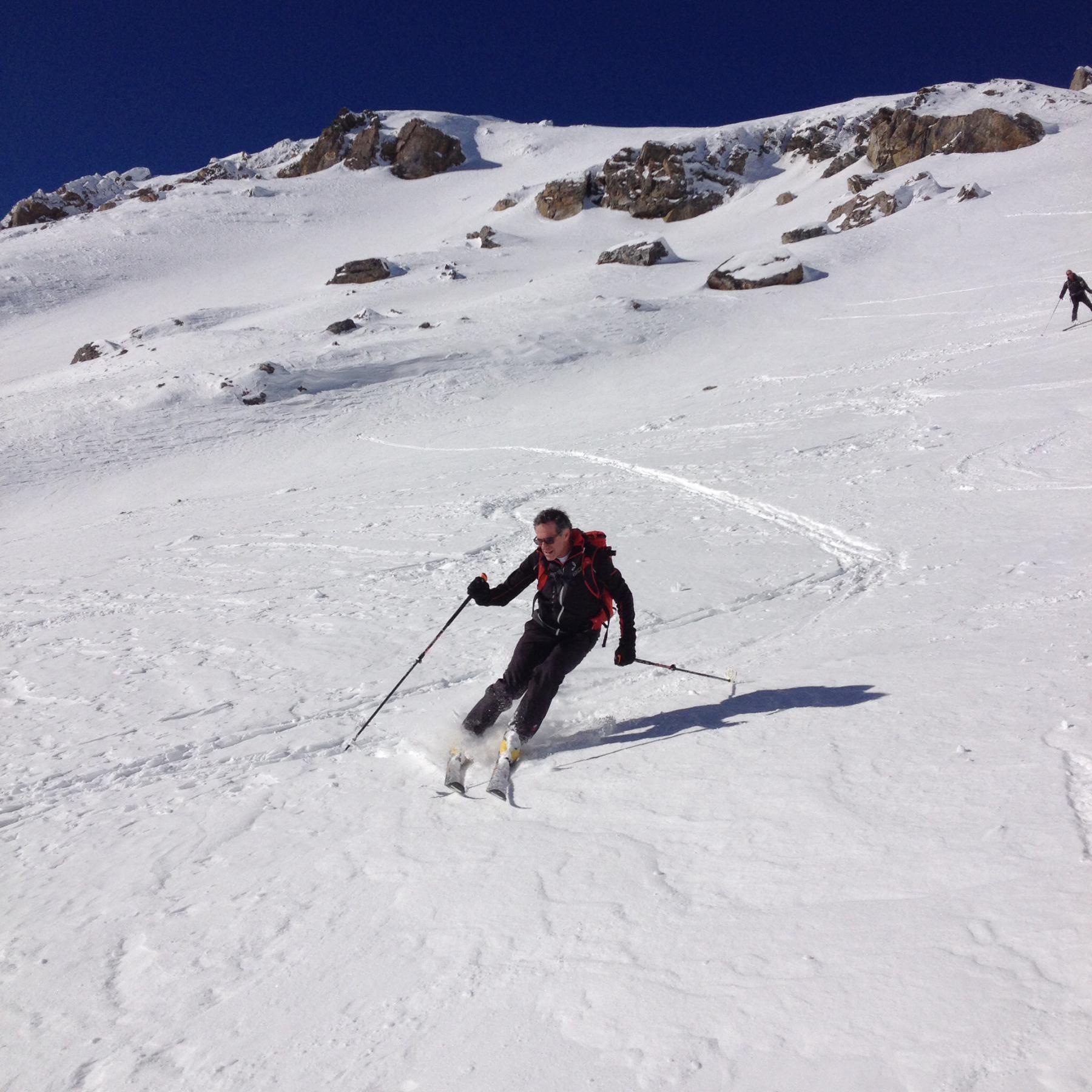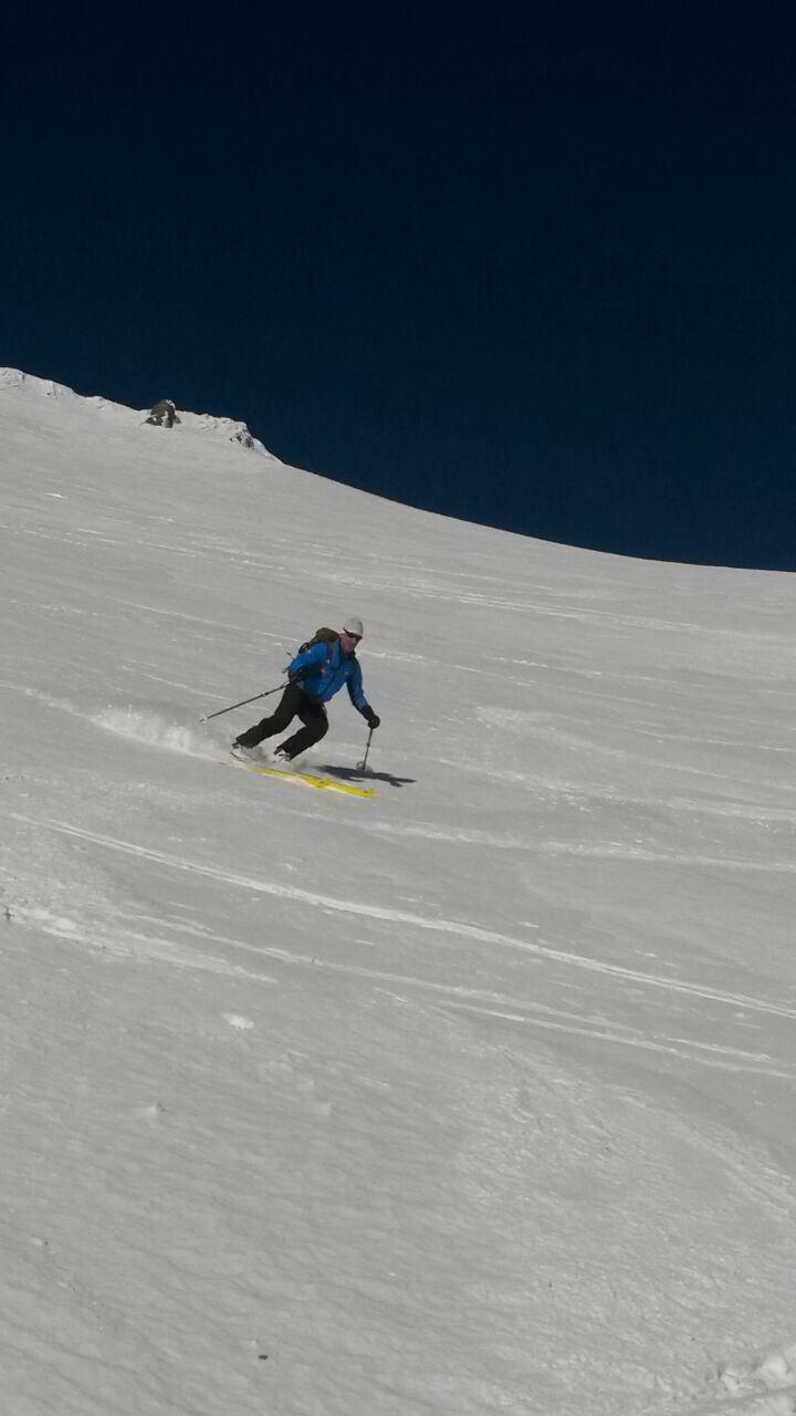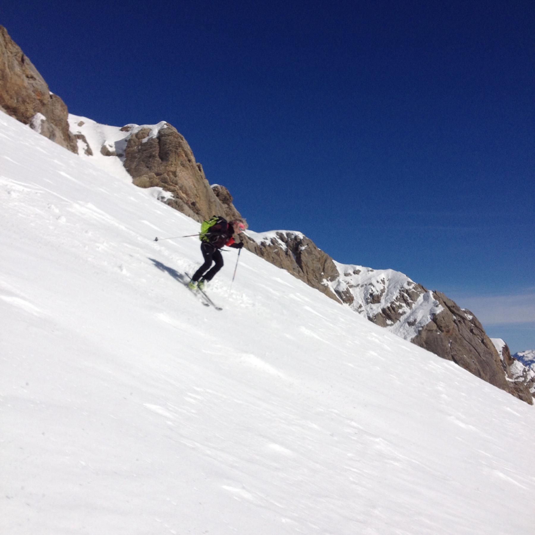 Prevedere 350 m. Di portage. Gli sci si calzano dopo il passaggio del rio. Temperatura abbastanza alta e assenza di vento, cielo blu e ottima visibilità. La prima parte della discesa è abbastanza divertente con bei tratti di farina pressata alternata a croste morbide.