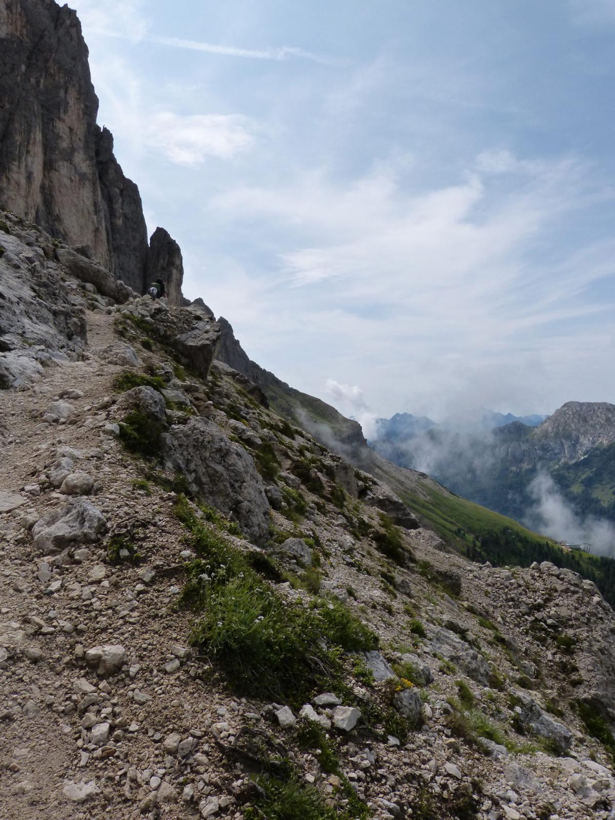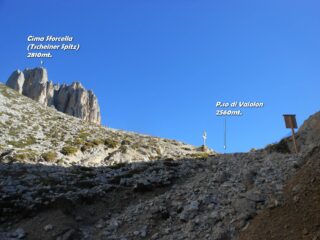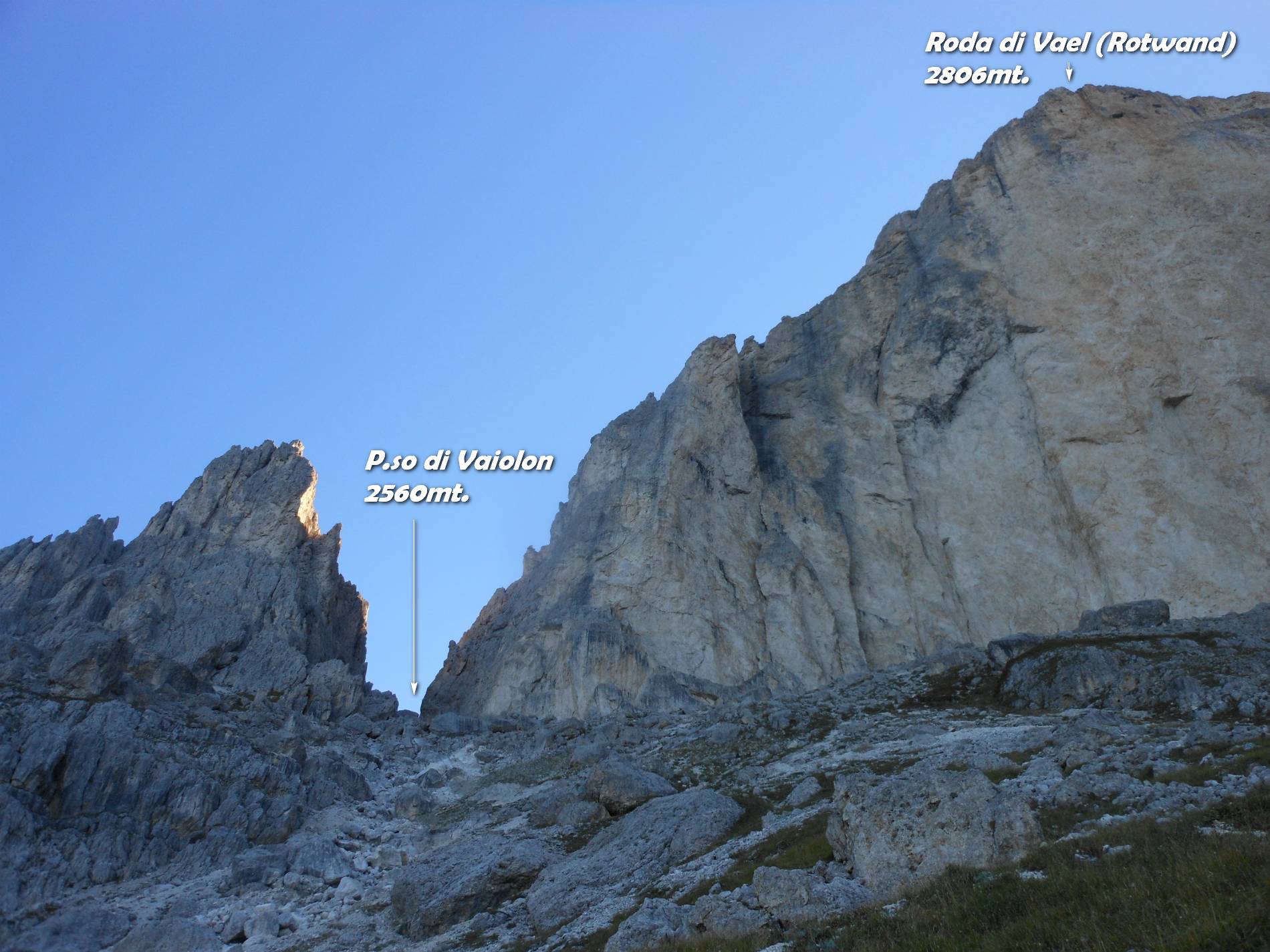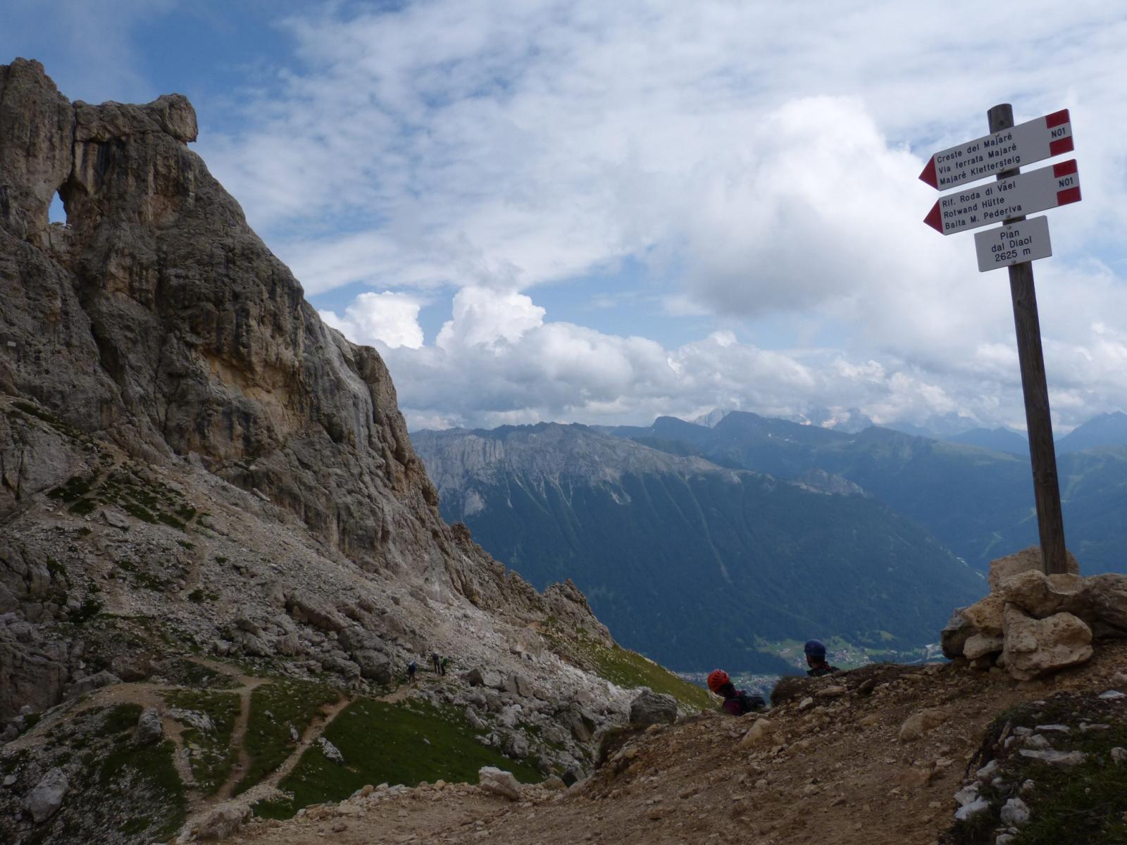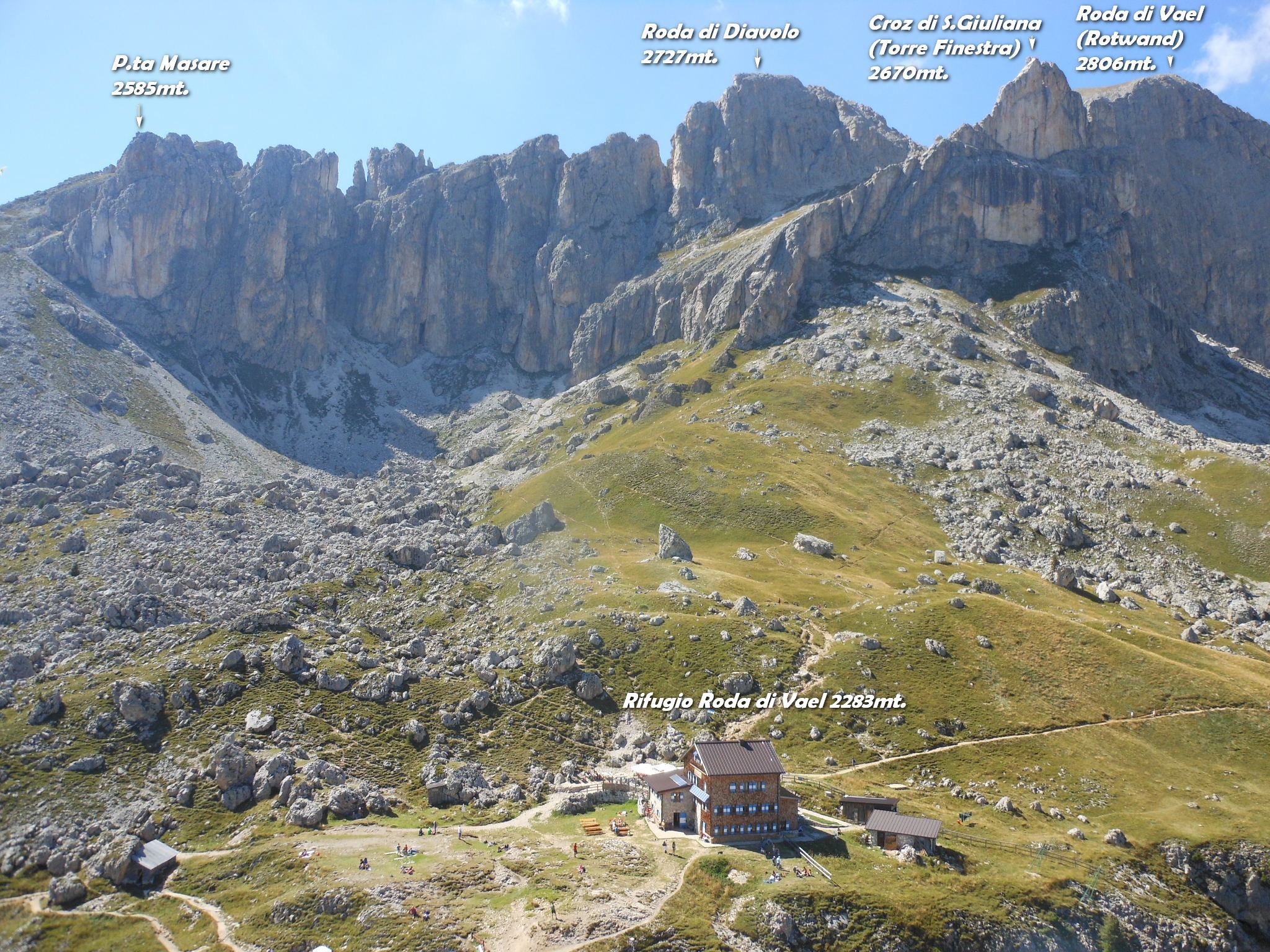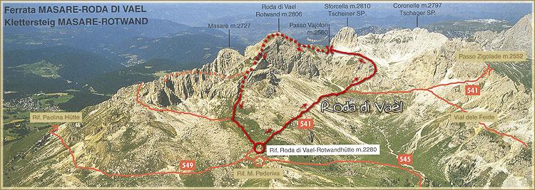 Dal Passo, pur non essendoci indicazioni, la salita appare evidente. Si segue la cresta, che è attrezzata in maniera non continuativa data la facilità della salita, che porta in cima dopo circa 45′ (2806 m; croce di vetta) A questo punto, in alternativa alla discesa dalla via di salita, si percorre l’opposto versante su evidente traccia che si fa progressivamente più impervia finchè compaiono i cavi e una scaletta che puntano alla Forcella delle Rode. Ignorate le funi che scendono un canalino (possibile discesa verso il rifugio Roda di Vael, difficoltà PD), proseguiamo a dx e affrontiamo il tratto chiave della via, ovverossia la traversata di una ripida parete dove la progressione è facilitata da un buon numero di staffe; si tratta di un passaggio molto scenografico che non pone eccessivi problemi al ferratista di media esperienza ma che può impressionare il neofita o chi non è avvezzo all’esposizione (difficoltà AD). Una breve risalita ci conduce al Pian de Diaol, dove il sentiero in discesa porta a un bivio segnalato; a sx si termina la ferrata della Roda di Vael mediante un altro tratto attrezzato, a dx si va a prendere la ferrata del Masarè (scelta consigliata). In entrambi i casi si raggiunge il rifugio Roda di Vael da cui si ritorna al punto di partenza,