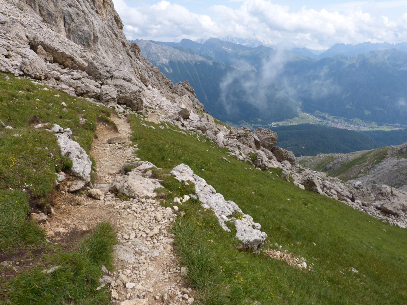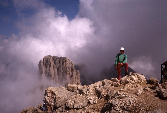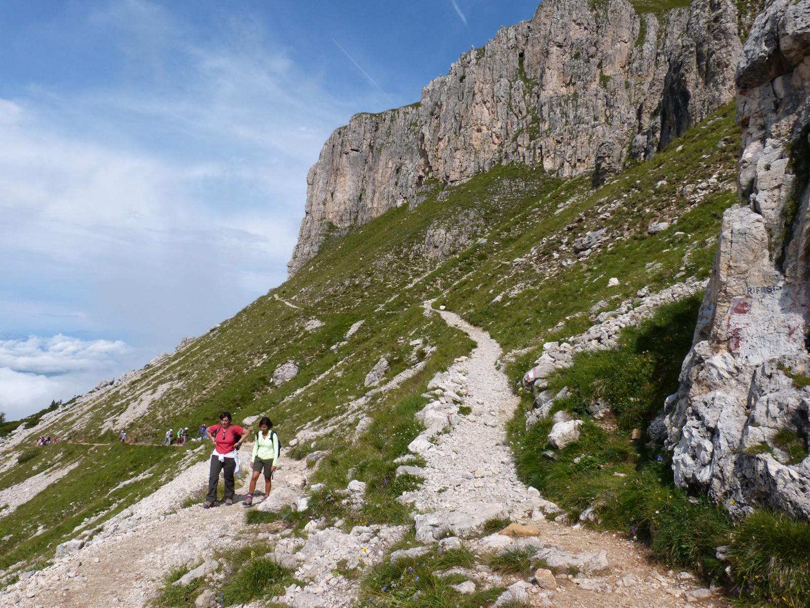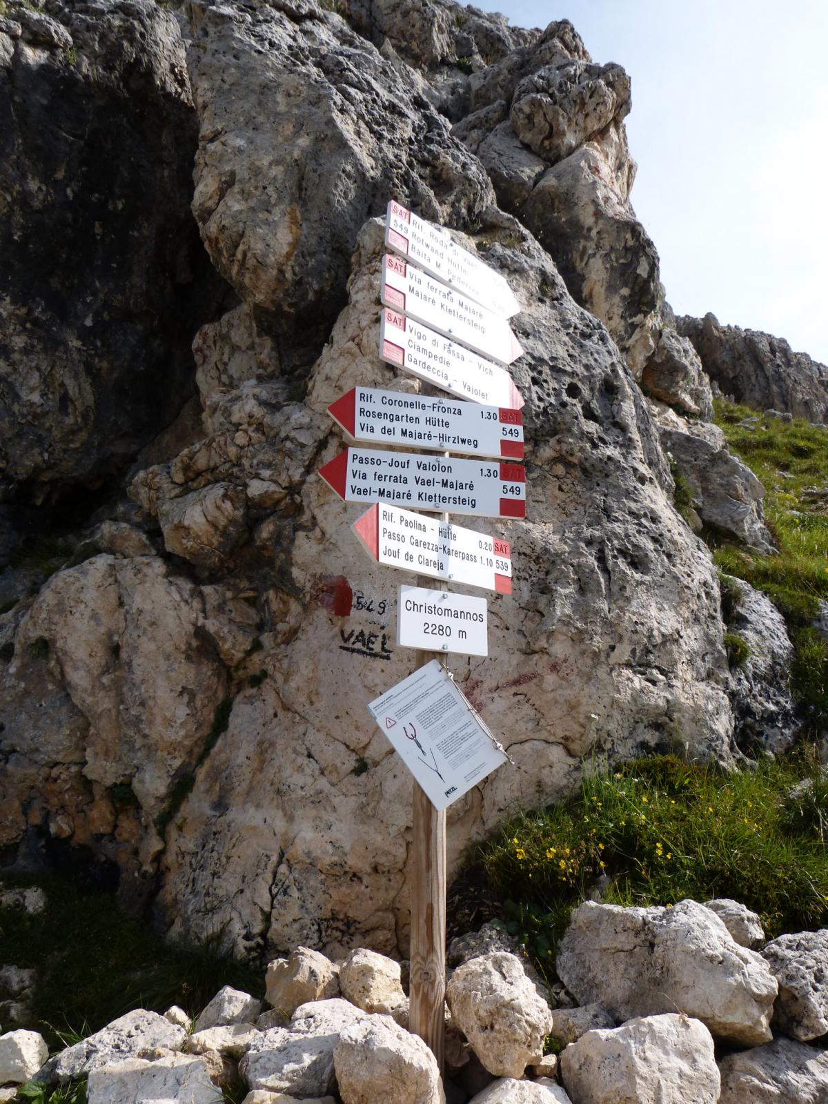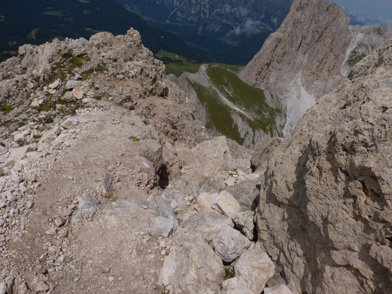 Dal Passo, pur non essendoci indicazioni, la salita appare evidente. Si segue la cresta, che è attrezzata in maniera non continuativa data la facilità della salita, che porta in cima dopo circa 45′ (2806 m; croce di vetta) A questo punto, in alternativa alla discesa dalla via di salita, si percorre l’opposto versante su evidente traccia che si fa progressivamente più impervia finchè compaiono i cavi e una scaletta che puntano alla Forcella delle Rode. Ignorate le funi che scendono un canalino (possibile discesa verso il rifugio Roda di Vael, difficoltà PD), proseguiamo a dx e affrontiamo il tratto chiave della via, ovverossia la traversata di una ripida parete dove la progressione è facilitata da un buon numero di staffe; si tratta di un passaggio molto scenografico che non pone eccessivi problemi al ferratista di media esperienza ma che può impressionare il neofita o chi non è avvezzo all’esposizione (difficoltà AD). Una breve risalita ci conduce al Pian de Diaol, dove il sentiero in discesa porta a un bivio segnalato; a sx si termina la ferrata della Roda di Vael mediante un altro tratto attrezzato, a dx si va a prendere la ferrata del Masarè (scelta consigliata). In entrambi i casi si raggiunge il rifugio Roda di Vael da cui si ritorna al punto di partenza,