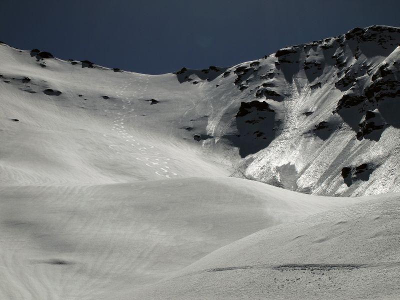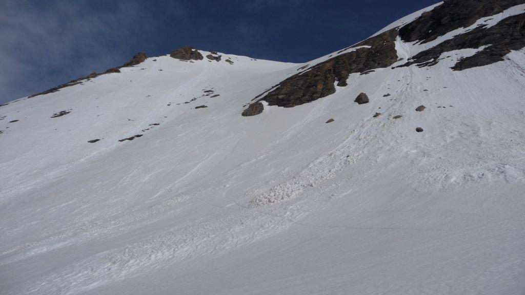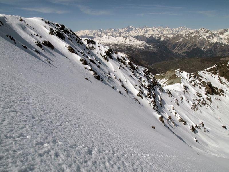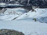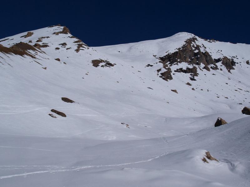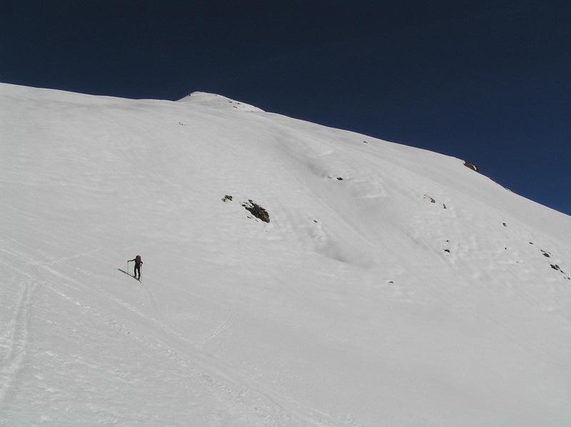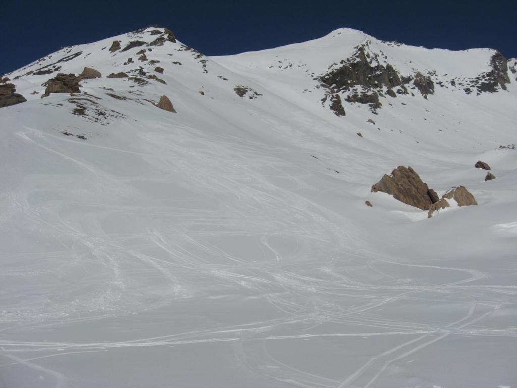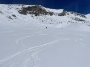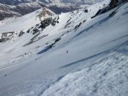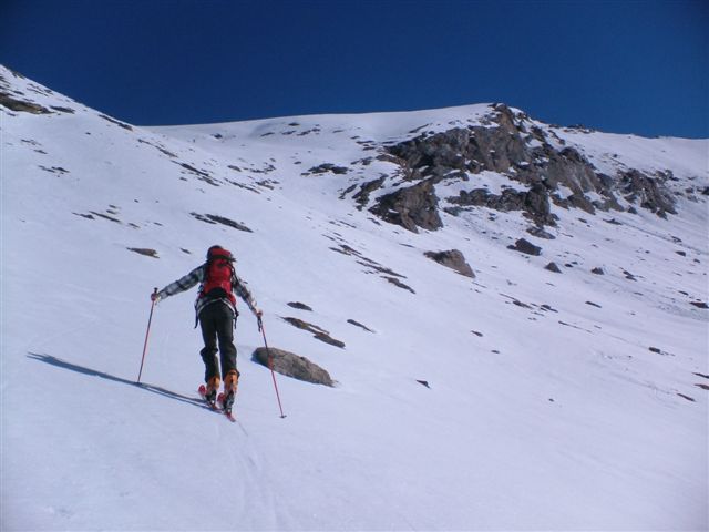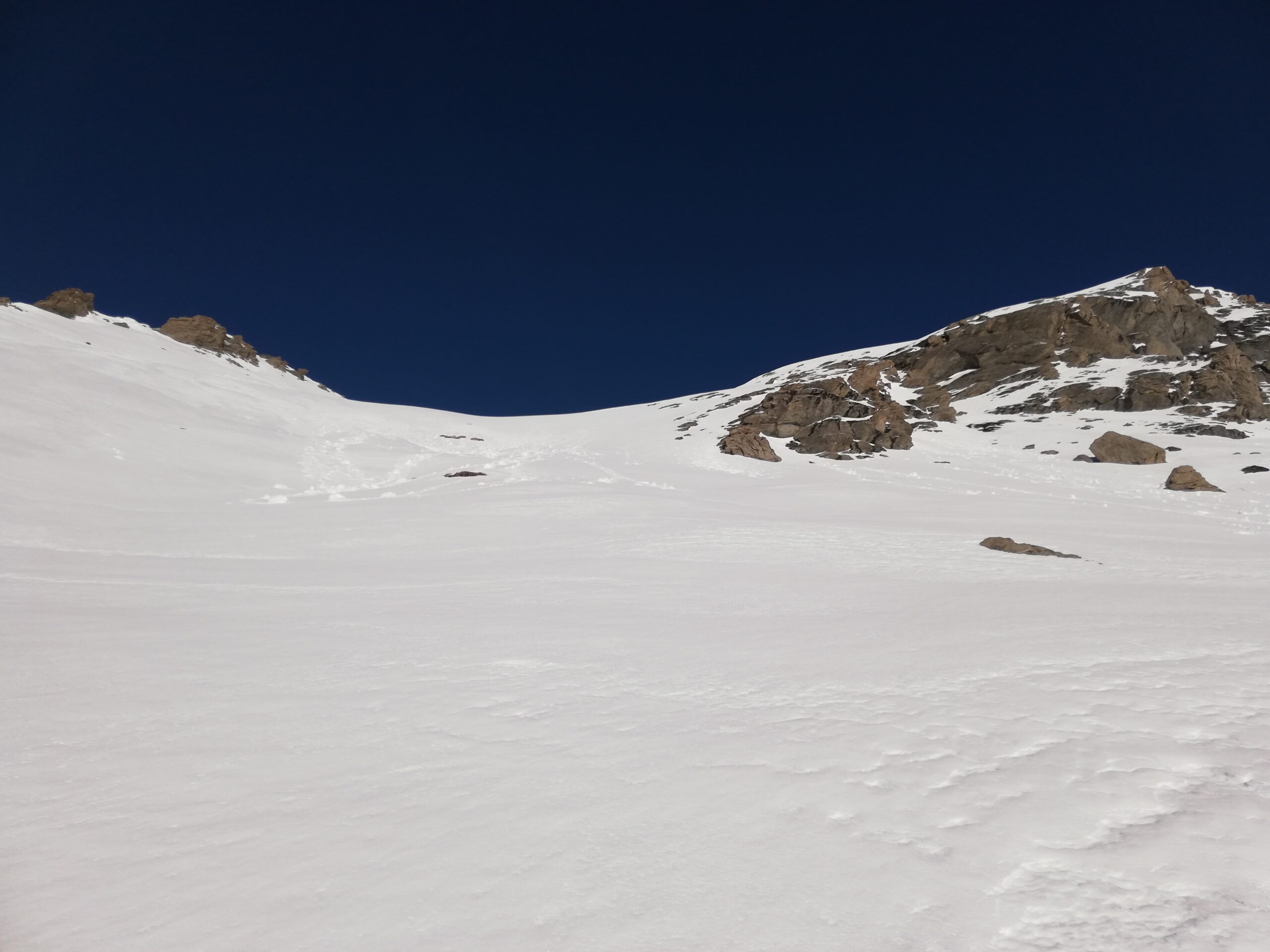2. proseguire finchè la dorsale lo consente (fino a circa 2900 m) per poi con un breve traverso verso destra si recupera il centro del pendio-canale e quindi al Colle della Rognosa.