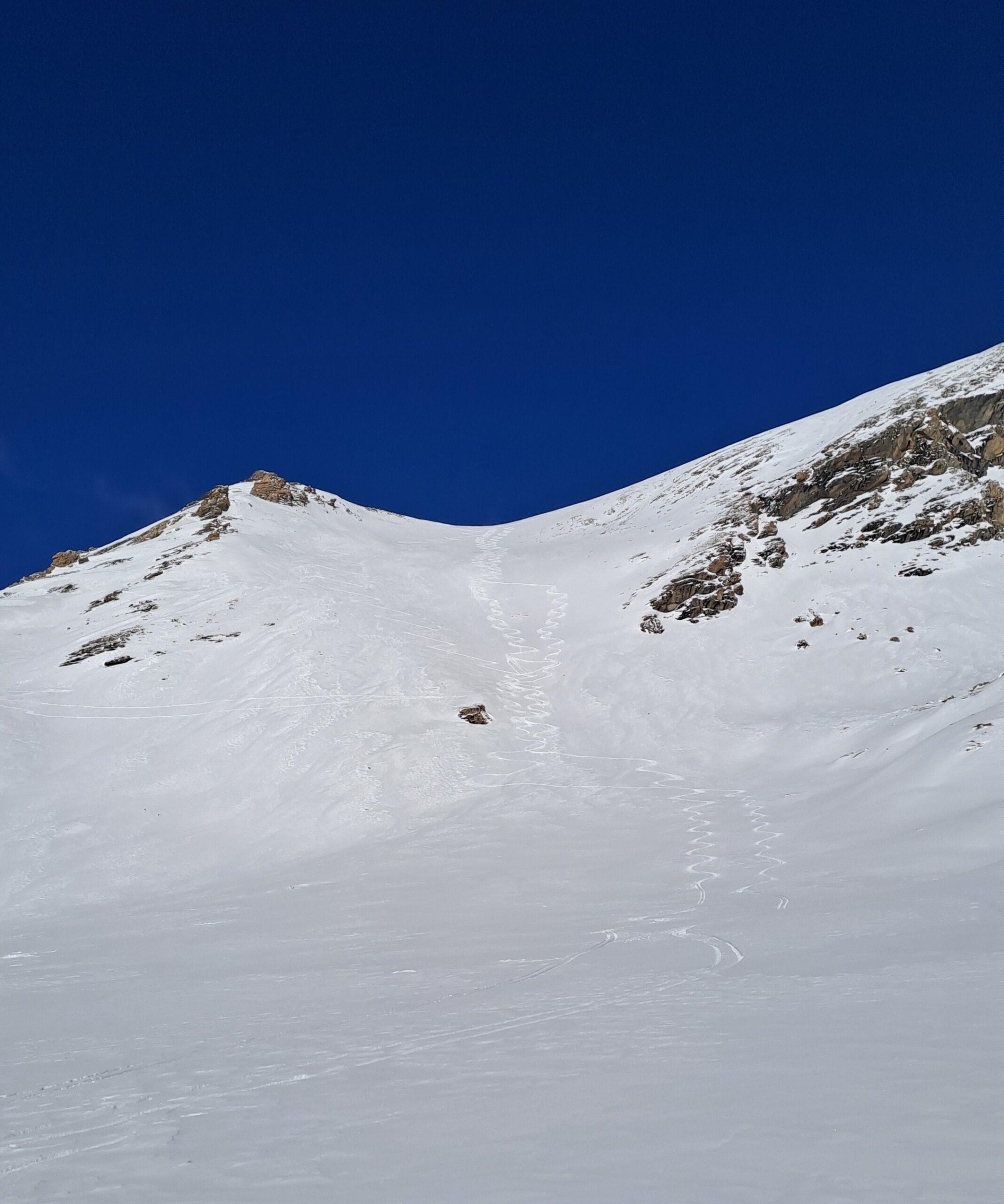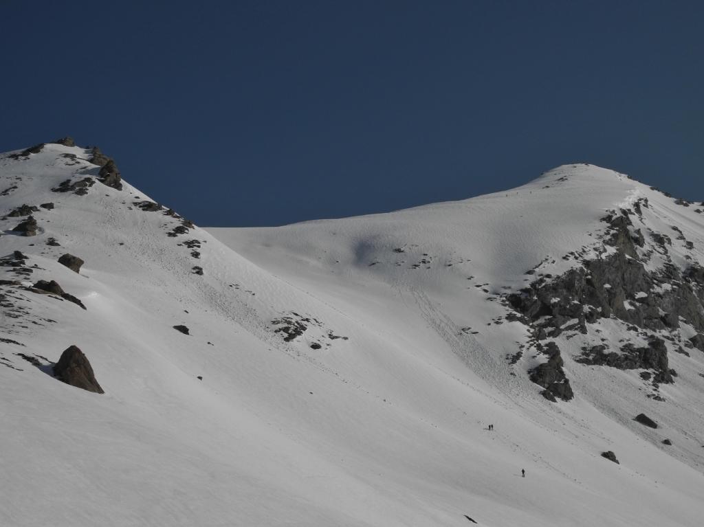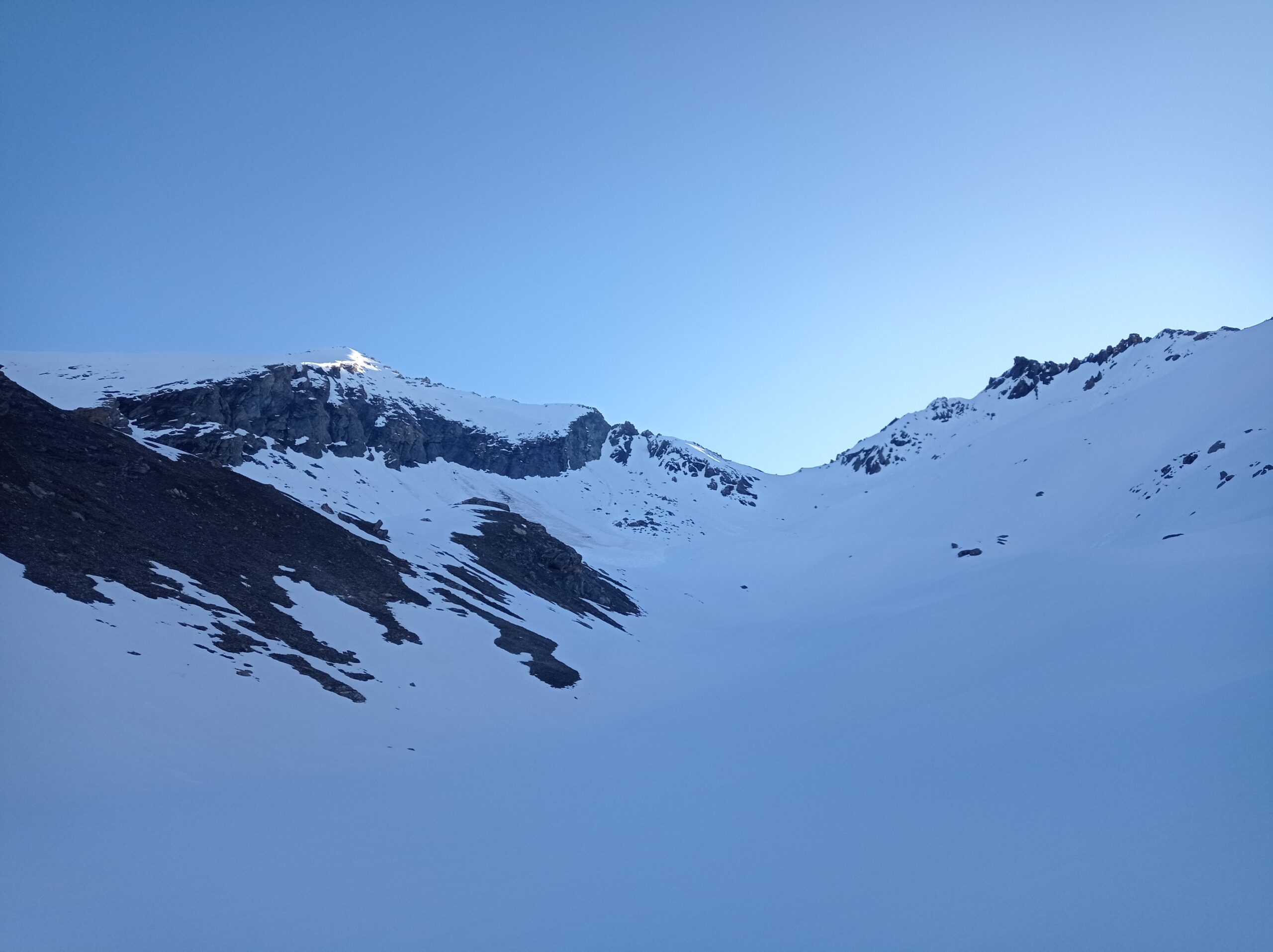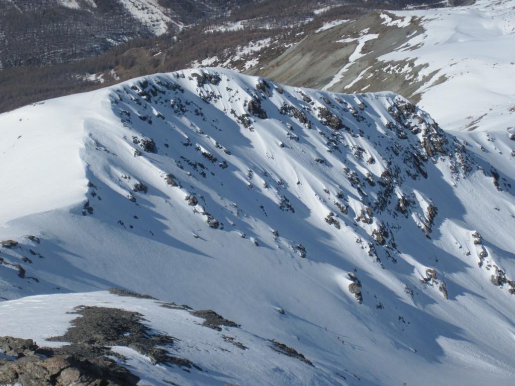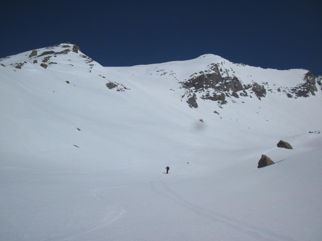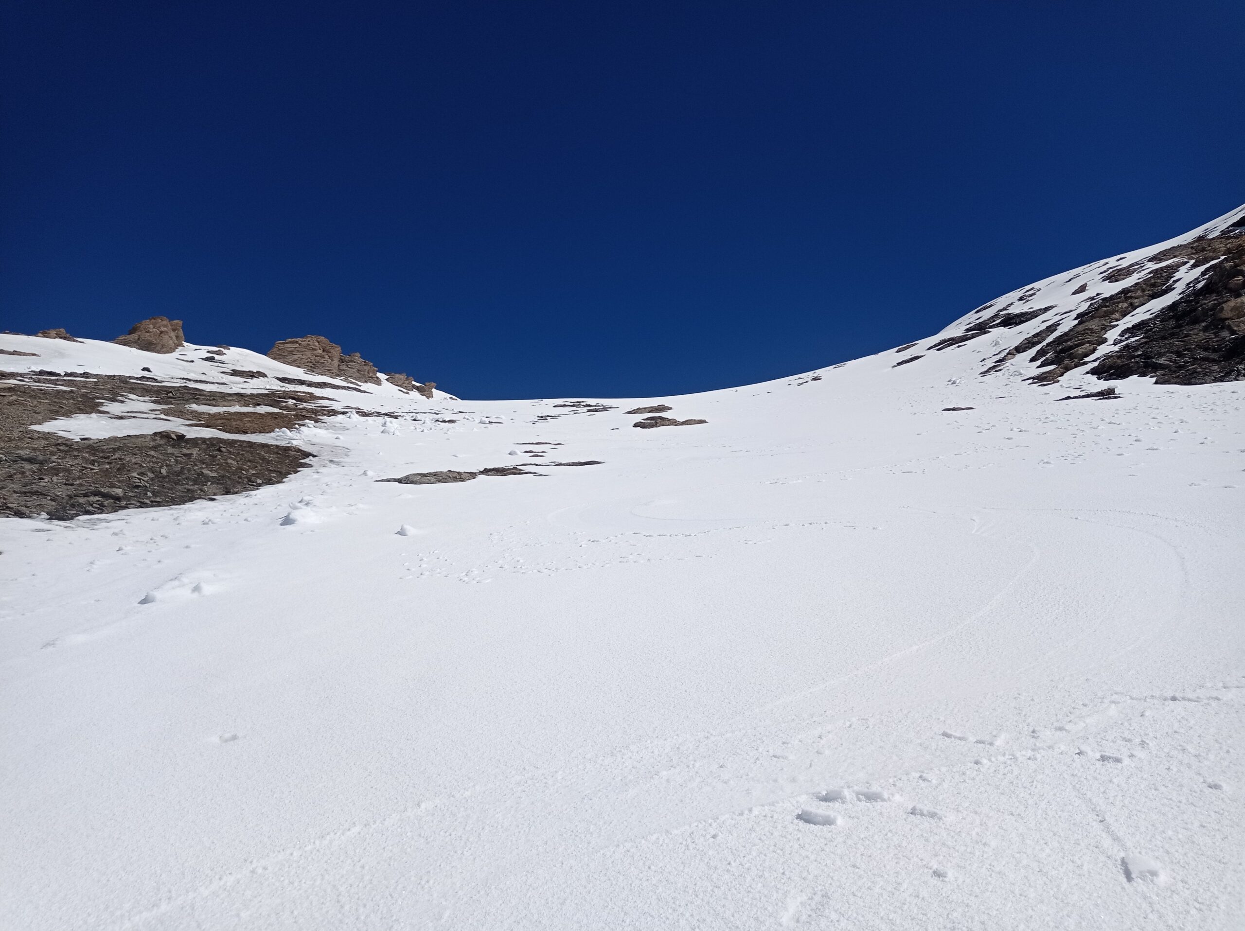 2. proseguire finchè la dorsale lo consente (fino a circa 2900 m) per poi con un breve traverso verso destra si recupera il centro del pendio-canale e quindi al Colle della Rognosa.
