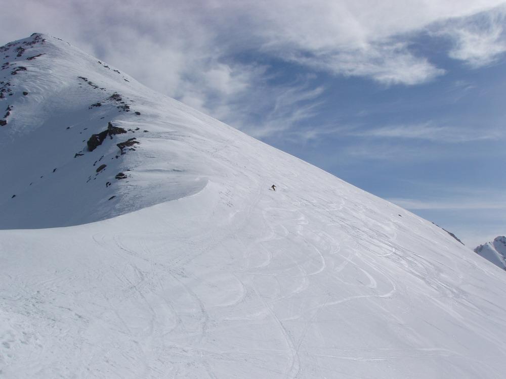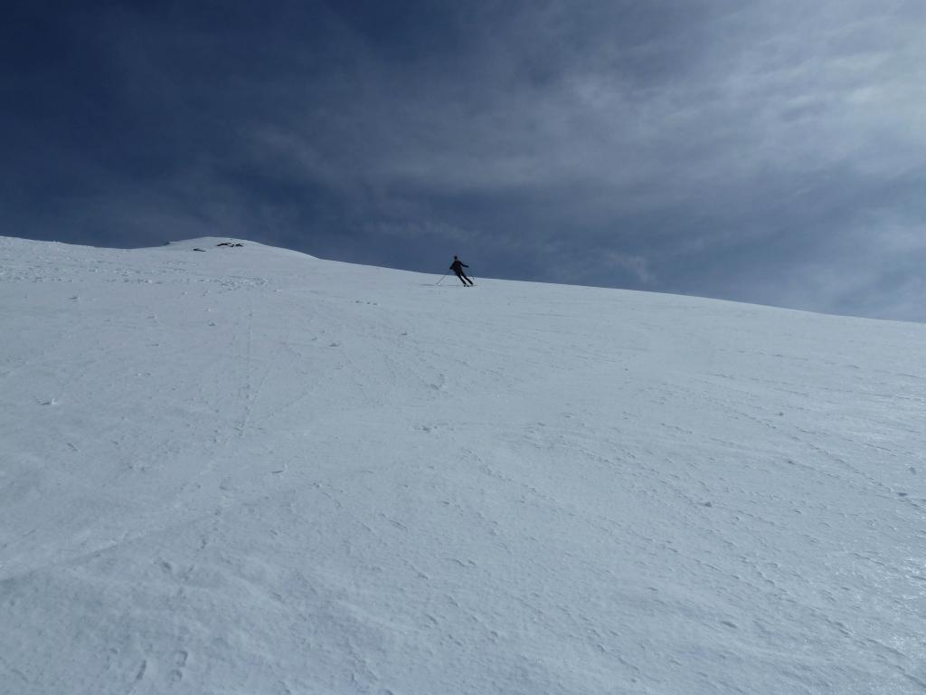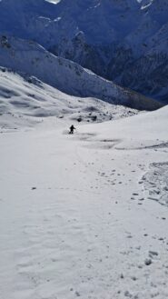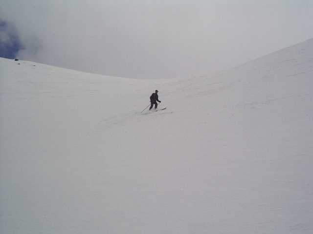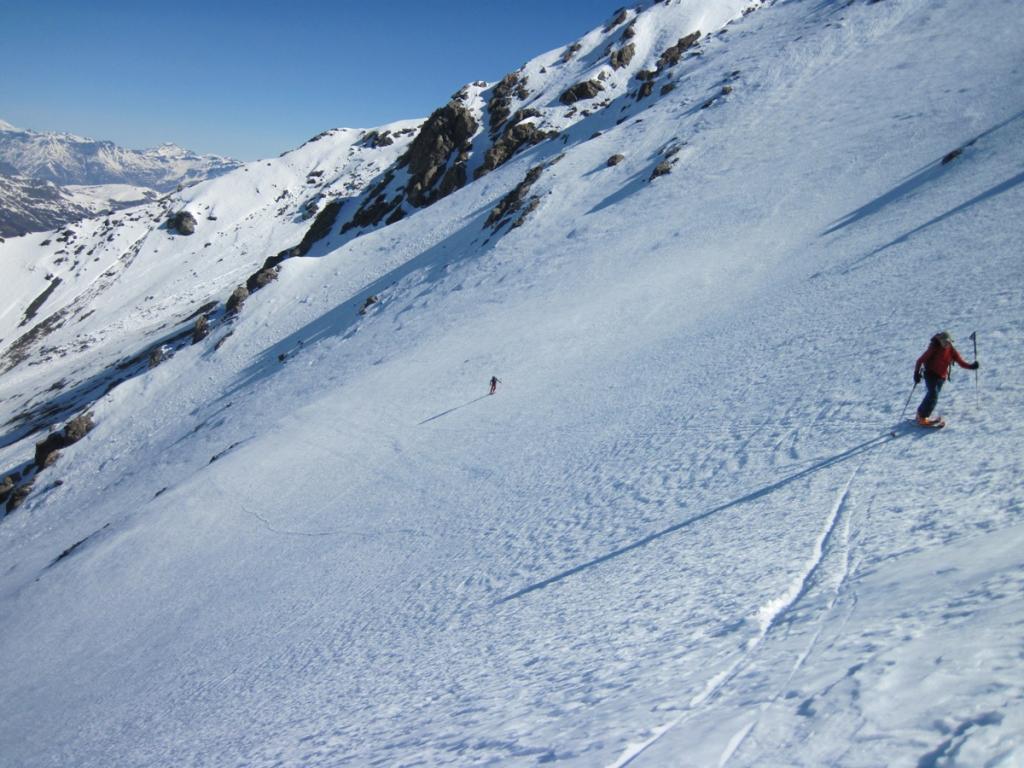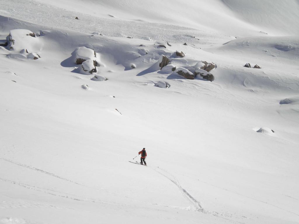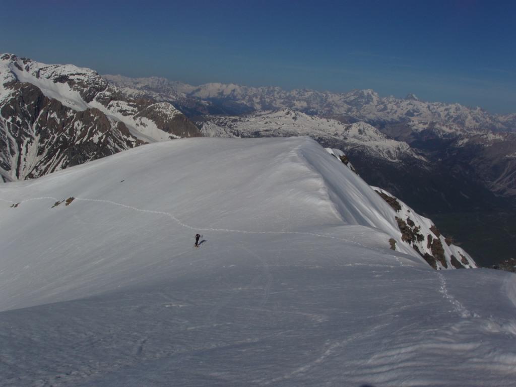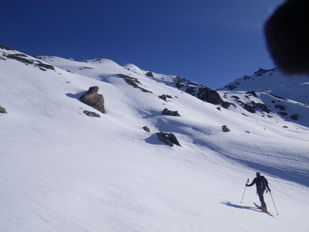 2. proseguire finchè la dorsale lo consente (fino a circa 2900 m) per poi con un breve traverso verso destra si recupera il centro del pendio-canale e quindi al Colle della Rognosa.