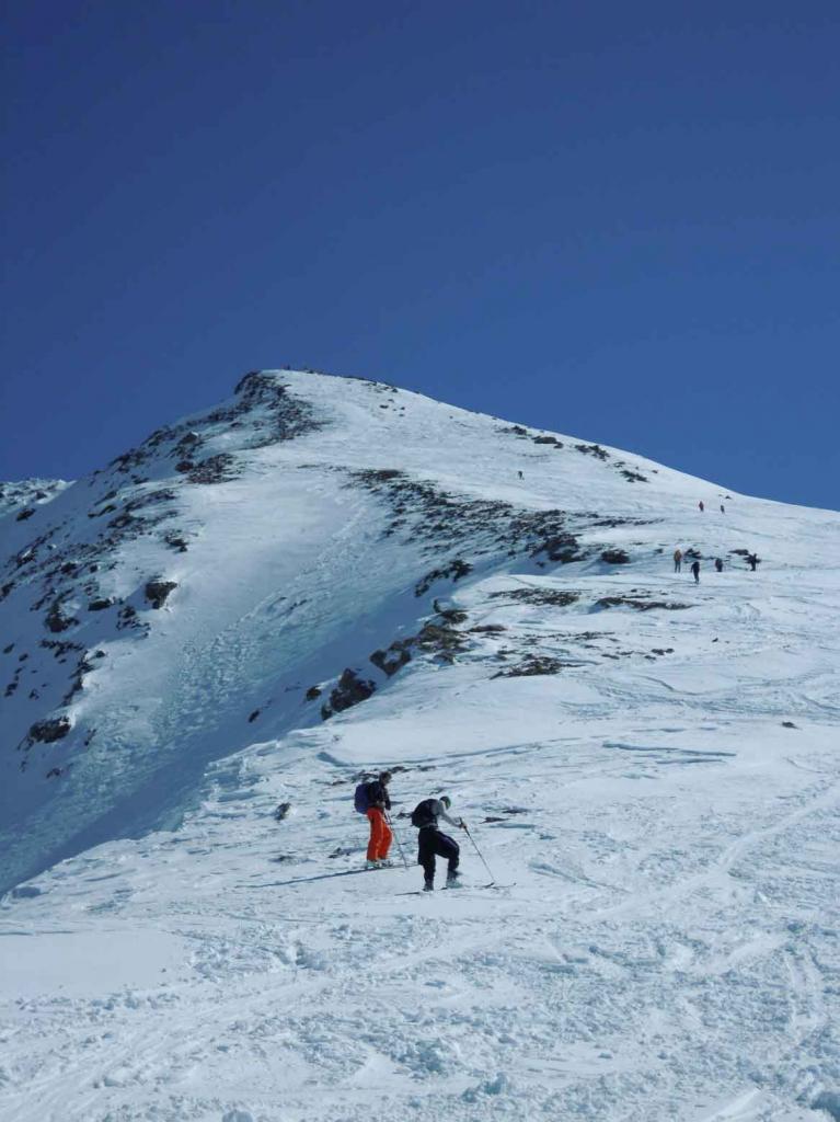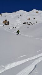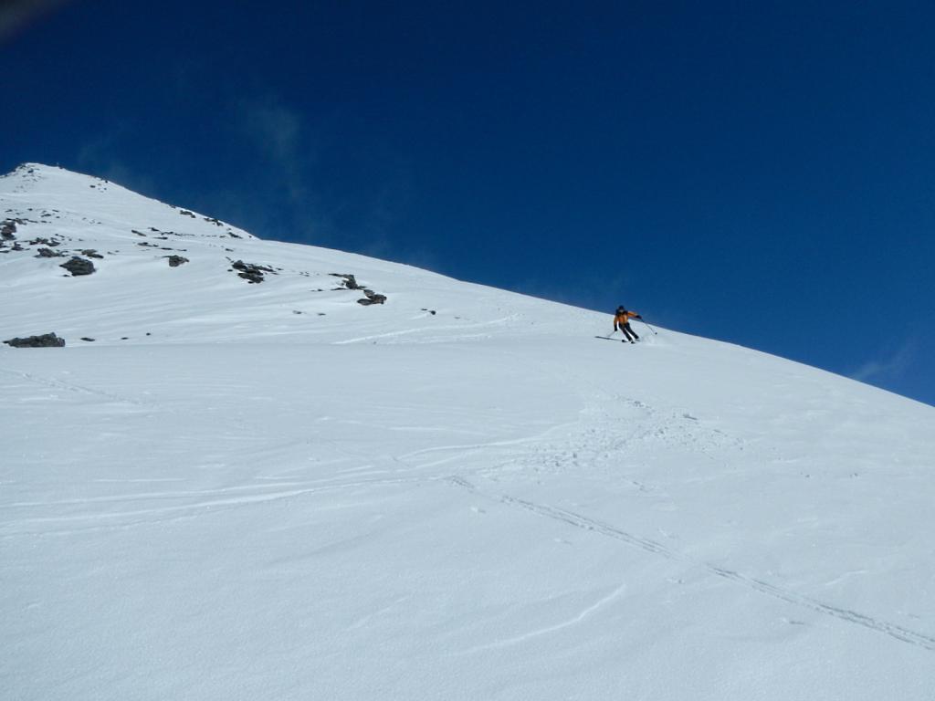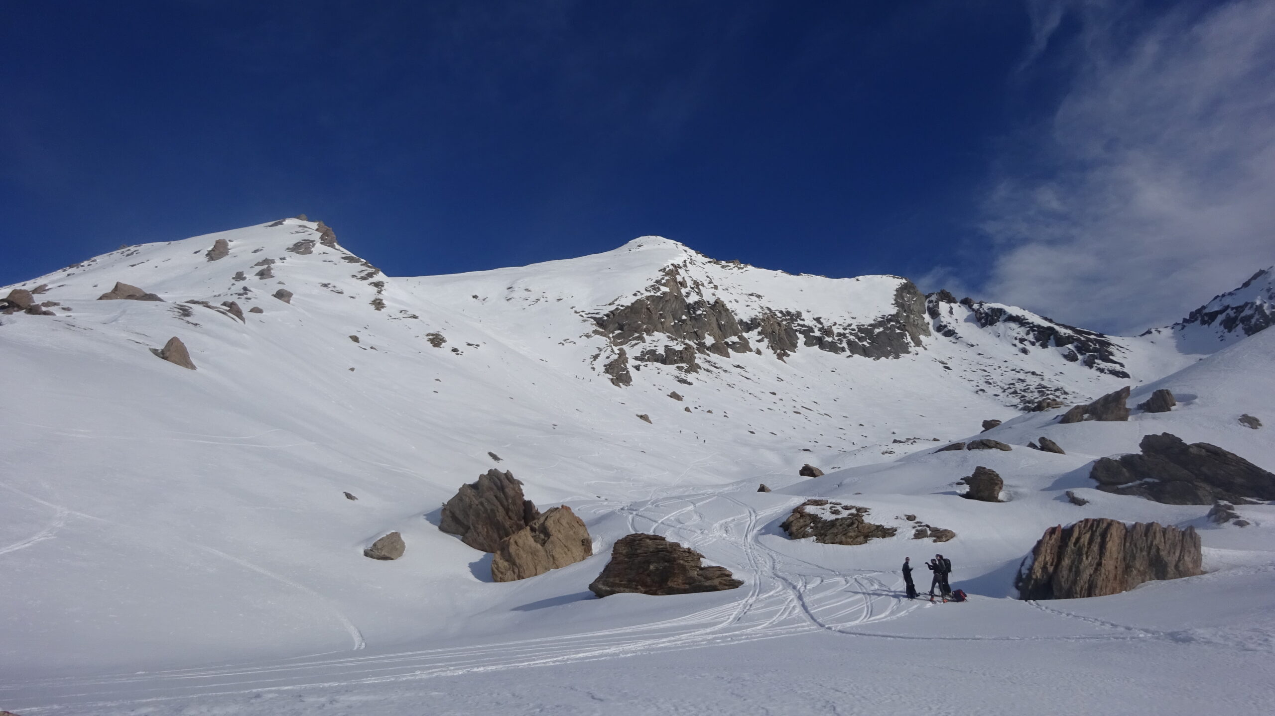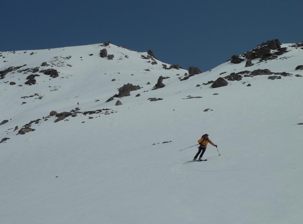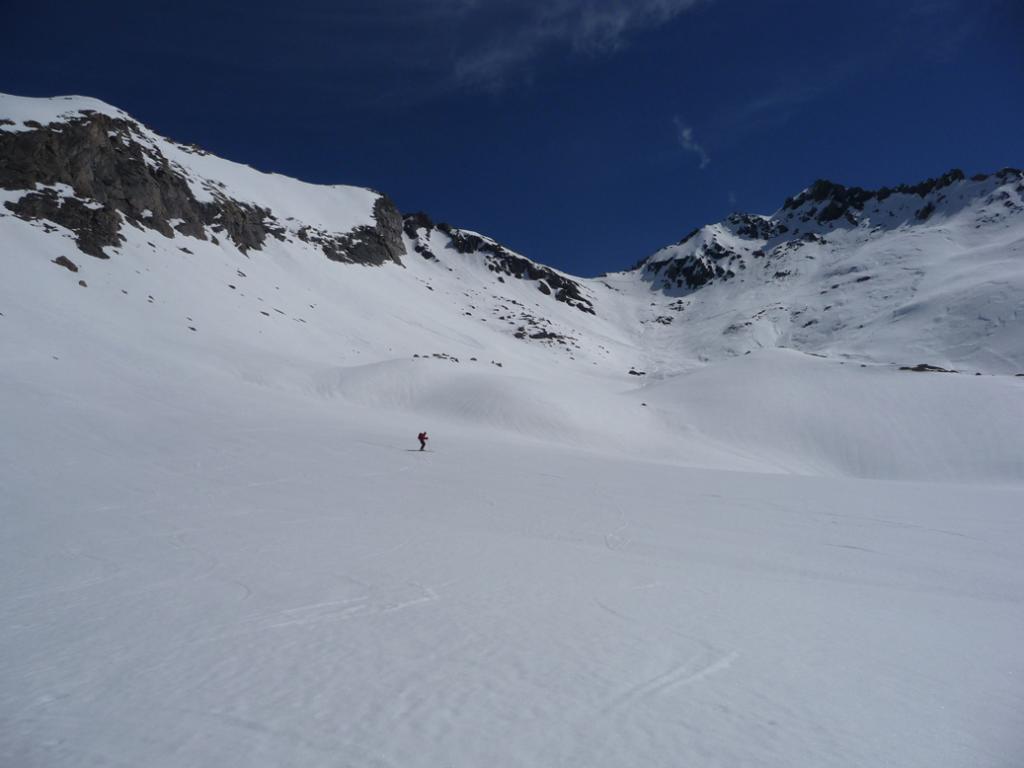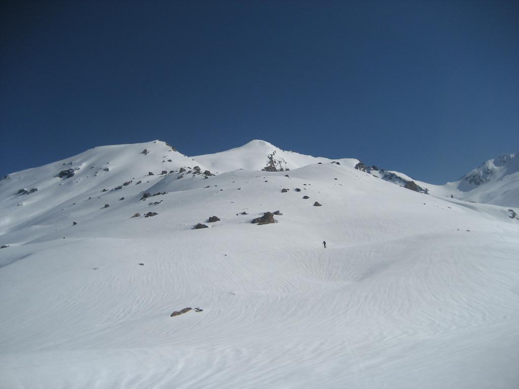 2. proseguire finchè la dorsale lo consente (fino a circa 2900 m) per poi con un breve traverso verso destra si recupera il centro del pendio-canale e quindi al Colle della Rognosa.