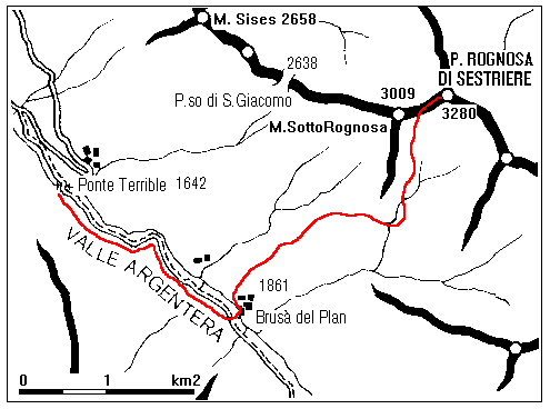 Dal Ponte Terribile, all’imbocco della Valle Argentera, si inizia a salire un canalino in direzione est che sale a destra della strada per Sestriere. Poco dopo spostandosi verso sinistra si aprono bei prati e si toccano le case di Bessen Bas, e quindi si arriva a Bessen Haut.