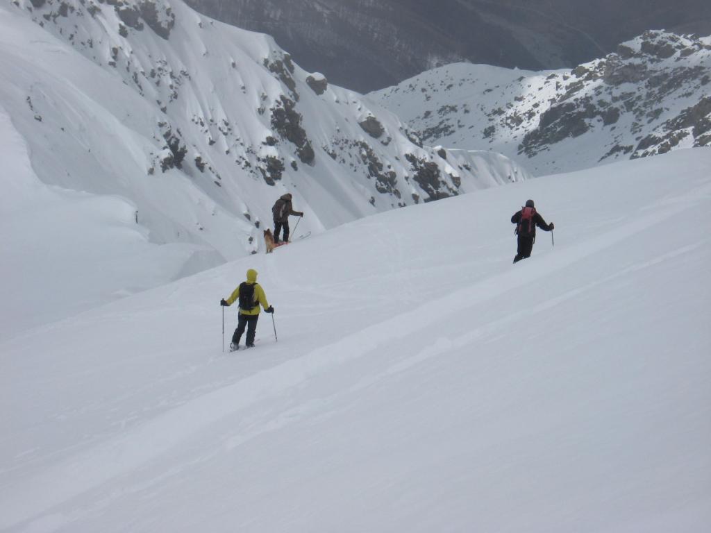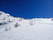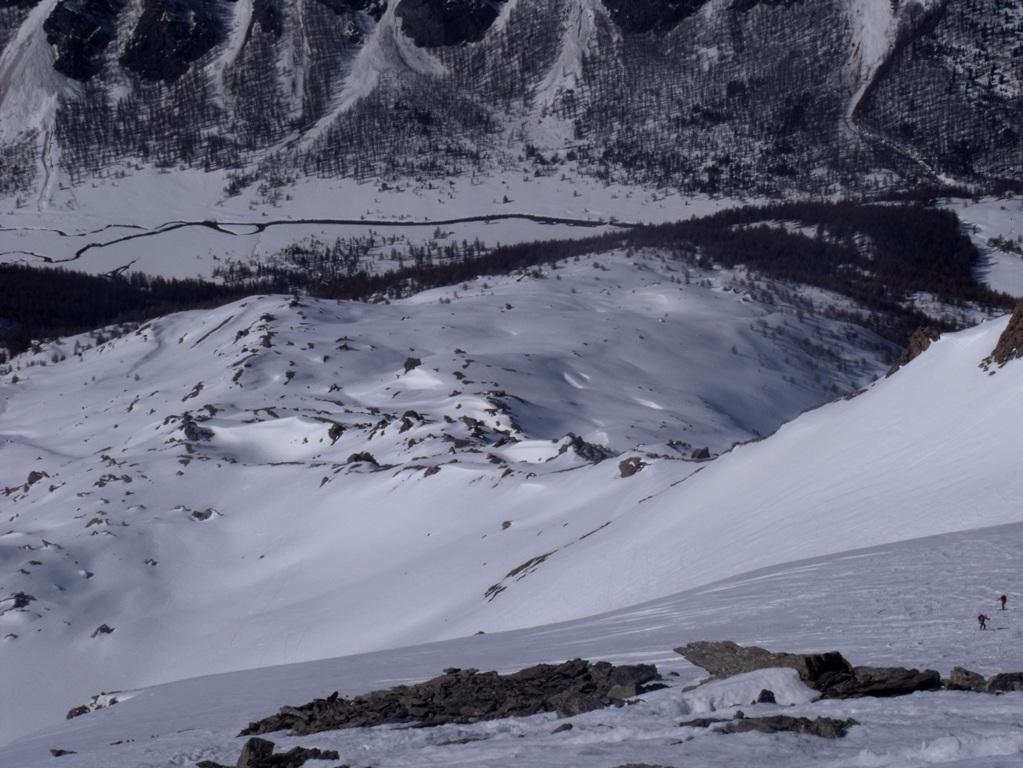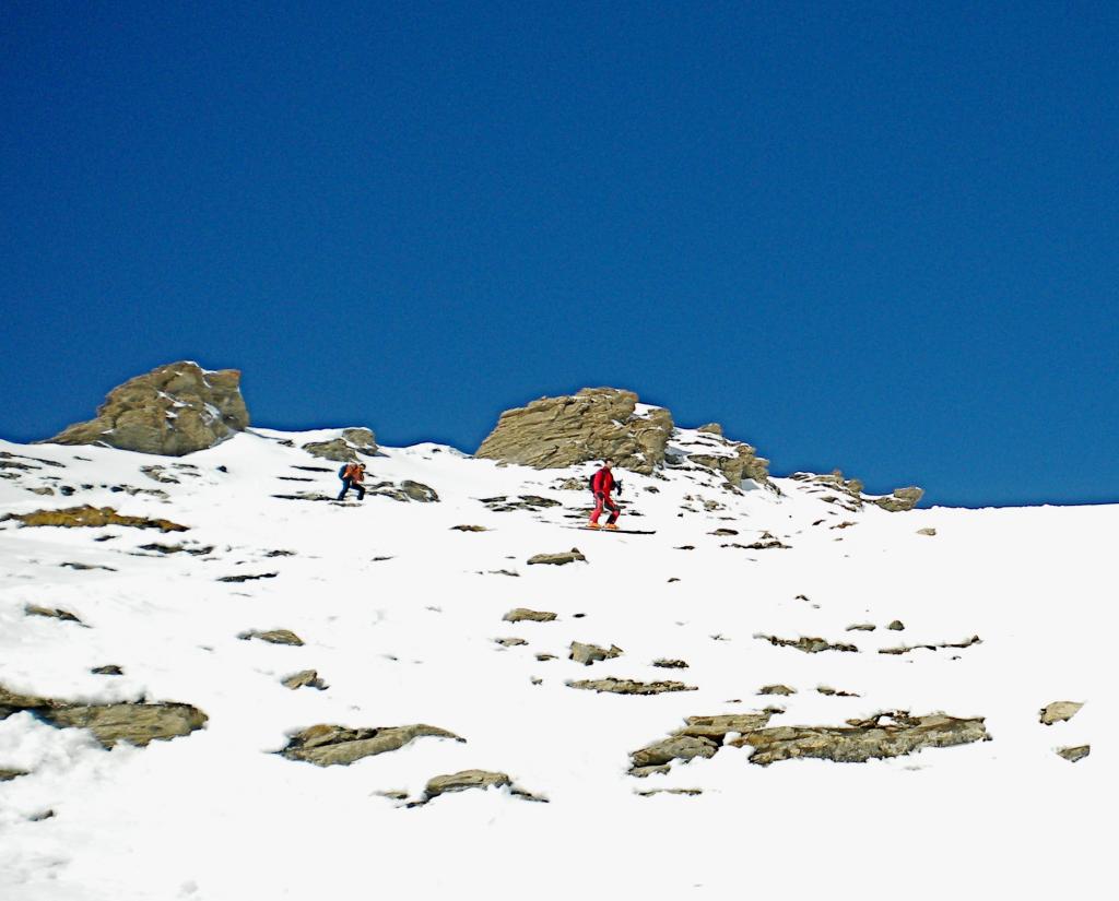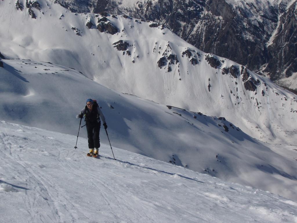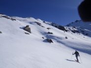 - 1.scendere nel pianoro sottostante e salire interamente il pendio-canalone che adduce al colle della Rognosa, pendio di 300 m di dislivello continuo e piuttosto ripido.