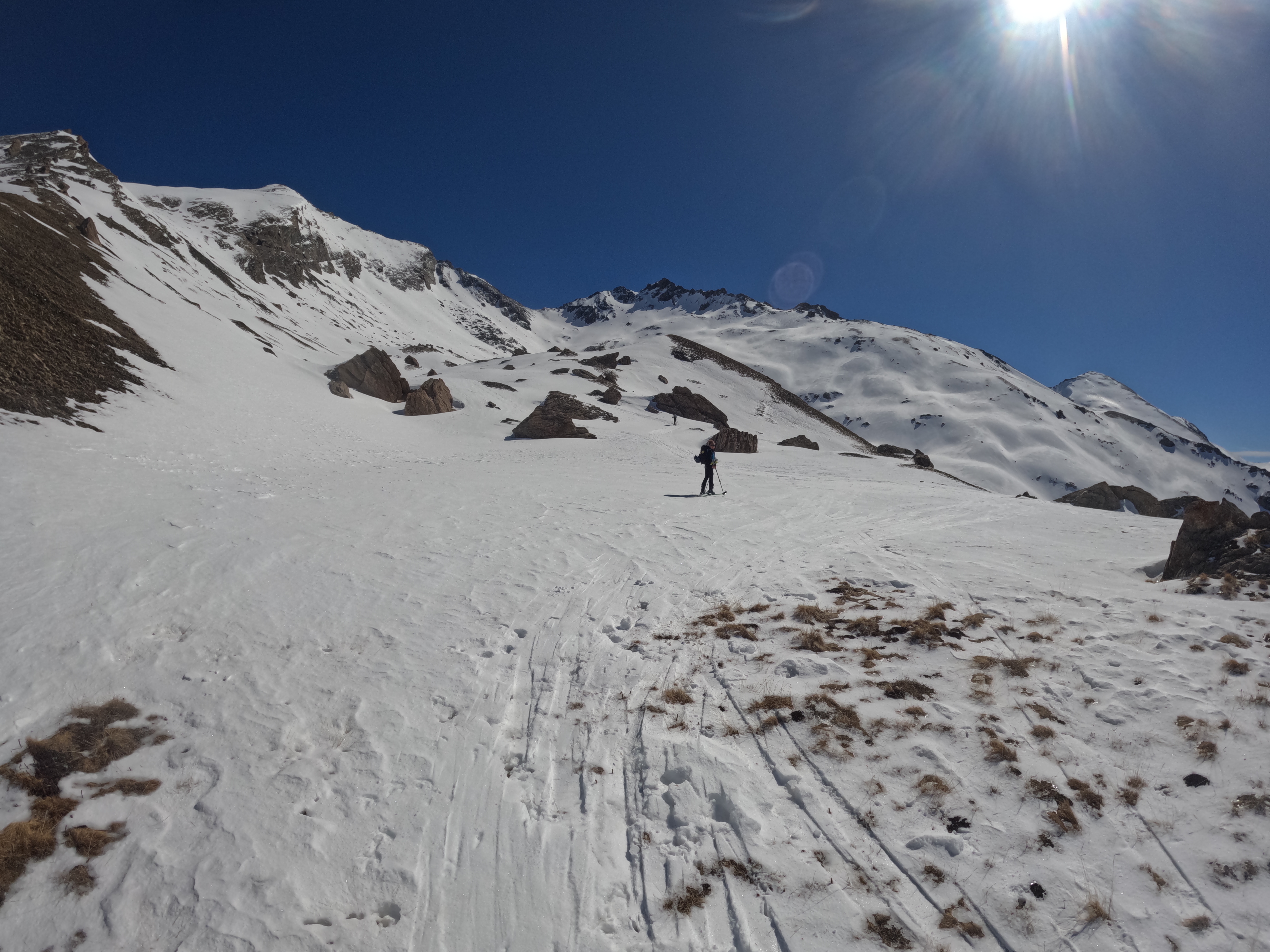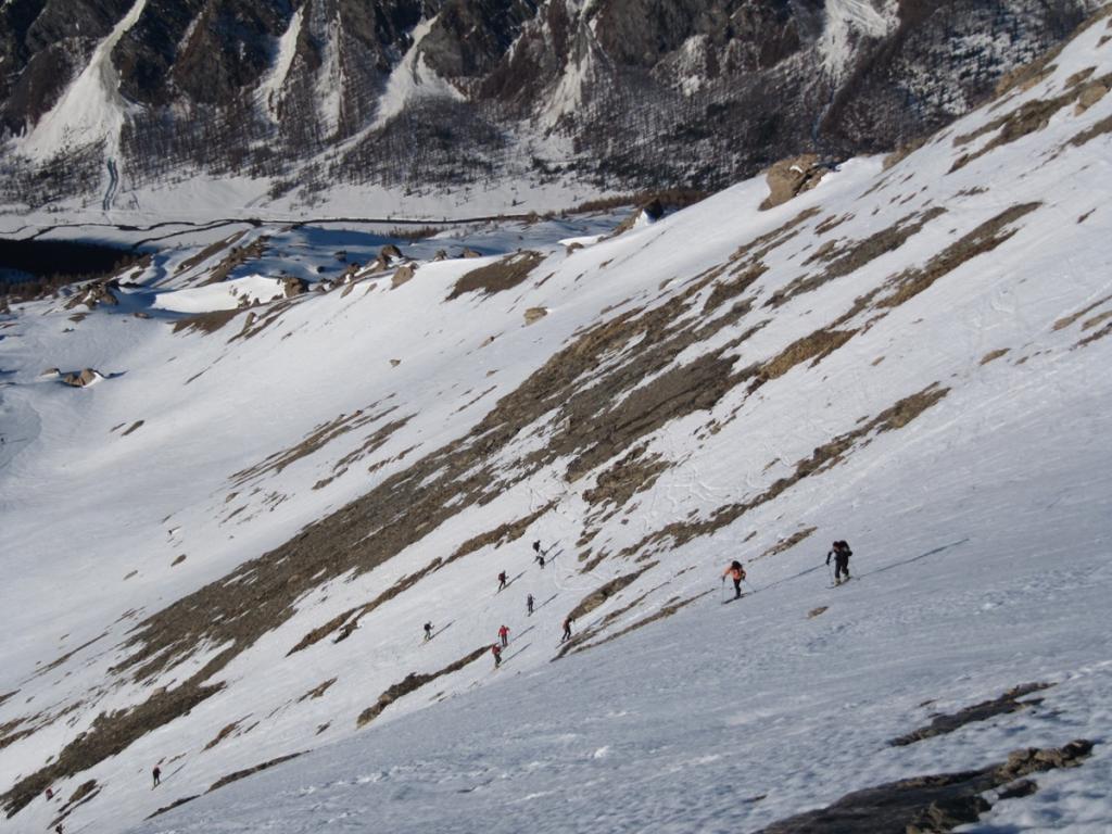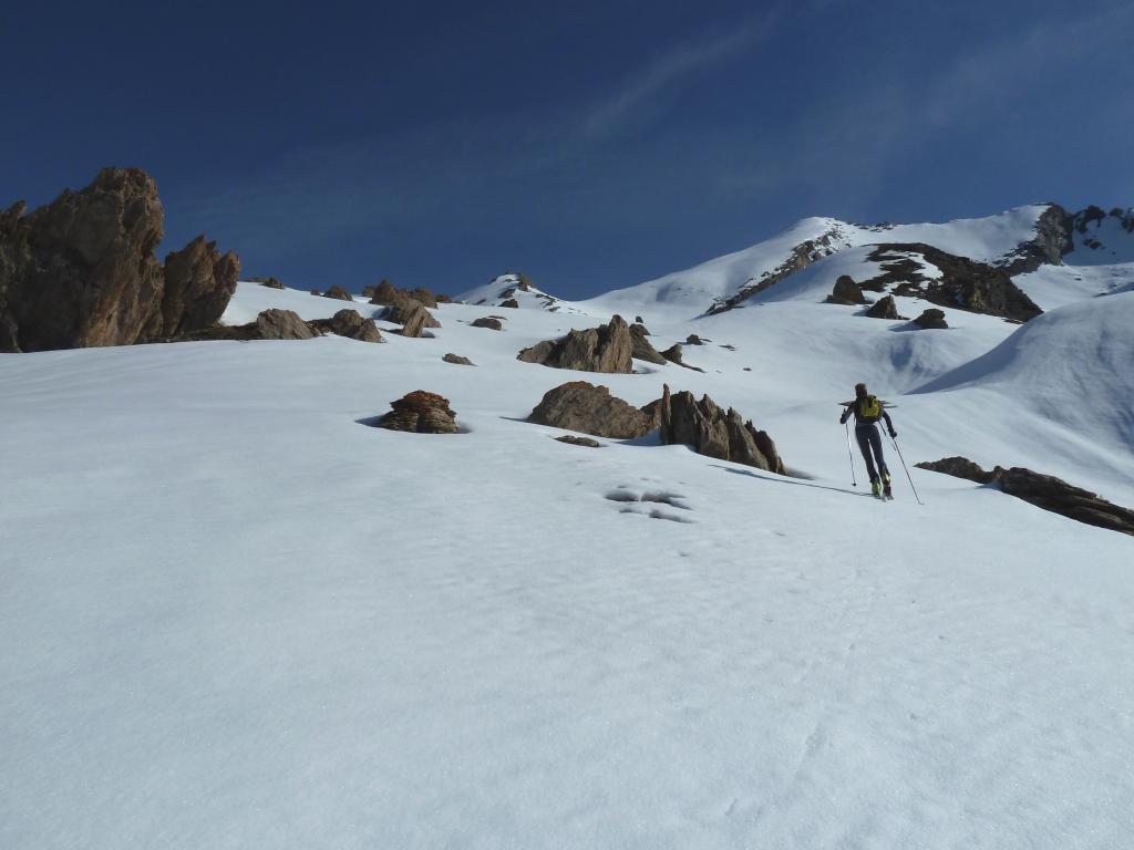 1.scendere nel pianoro sottostante e salire interamente il pendio-canalone che adduce al colle della Rognosa, pendio di 300 m di dislivello continuo e piuttosto ripido.