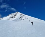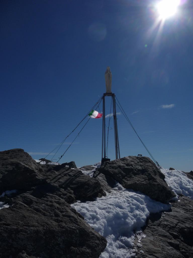 Raggiunto il colle, si prosegue verso destra per un breve tratto pianeggiante, prima di riprendere a salire il la dorsale-pendio conclusivo, con ben visibile la Madonna di vetta.