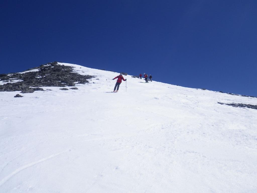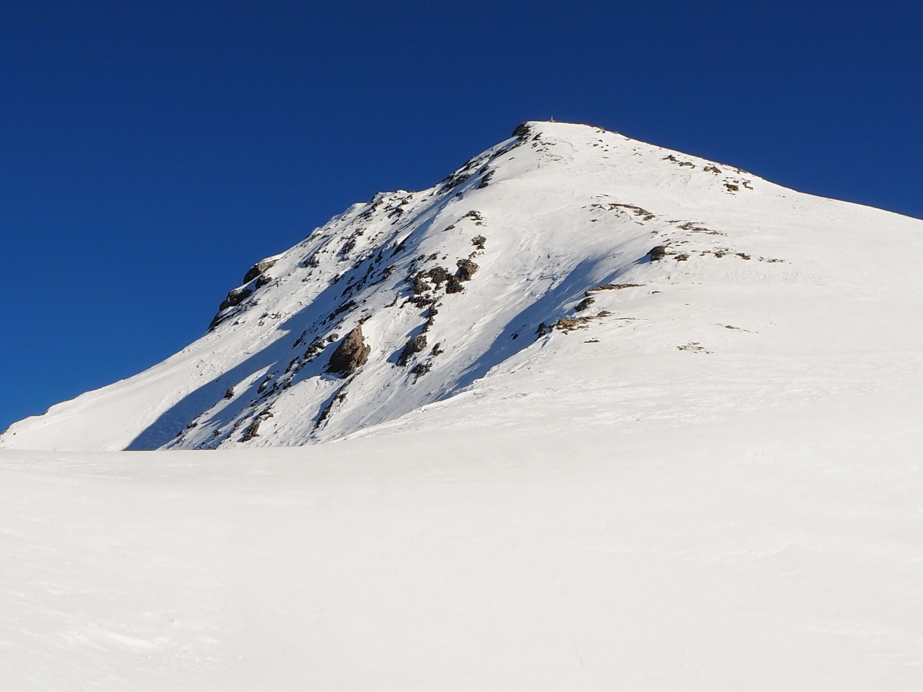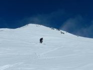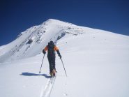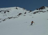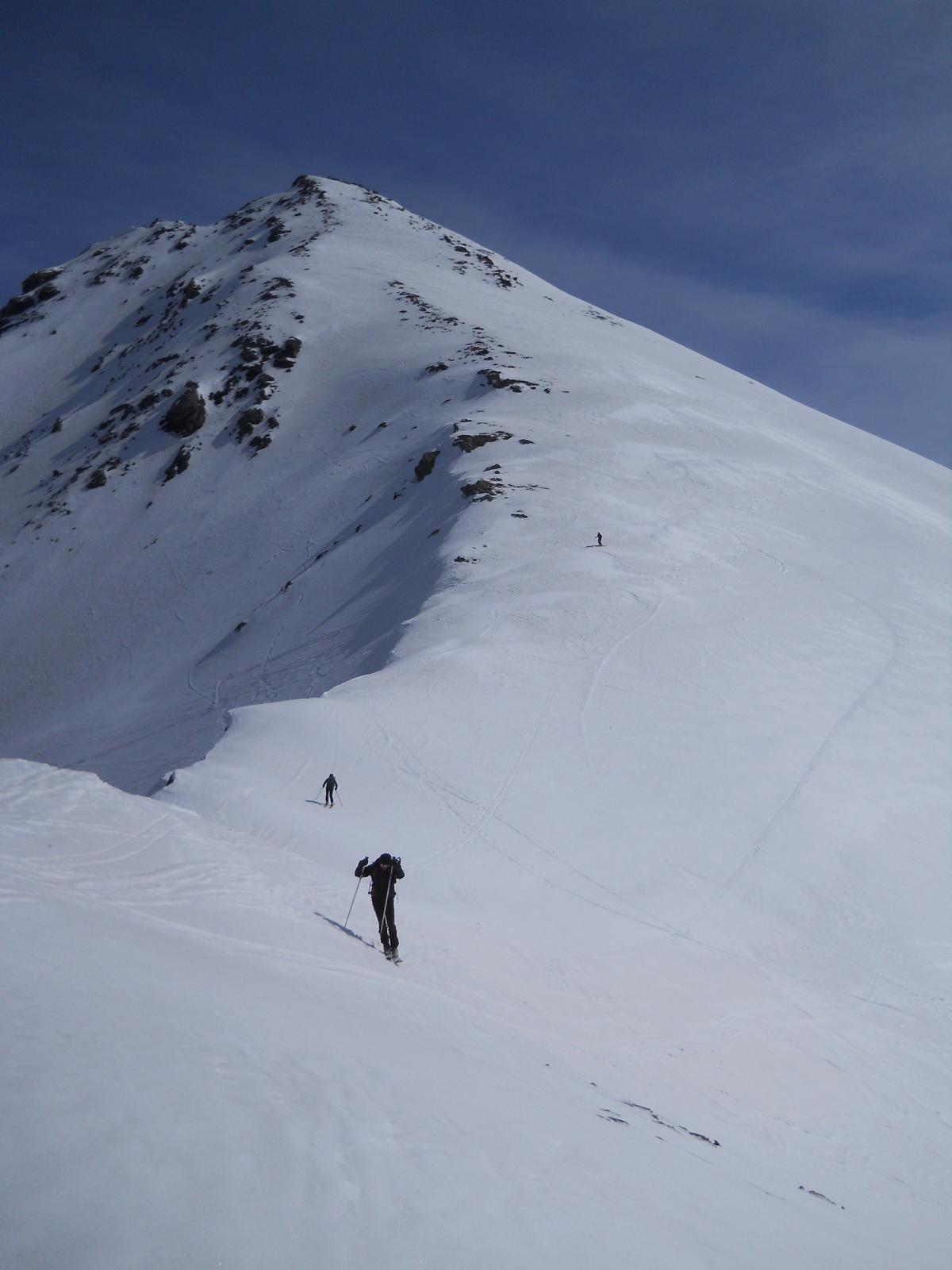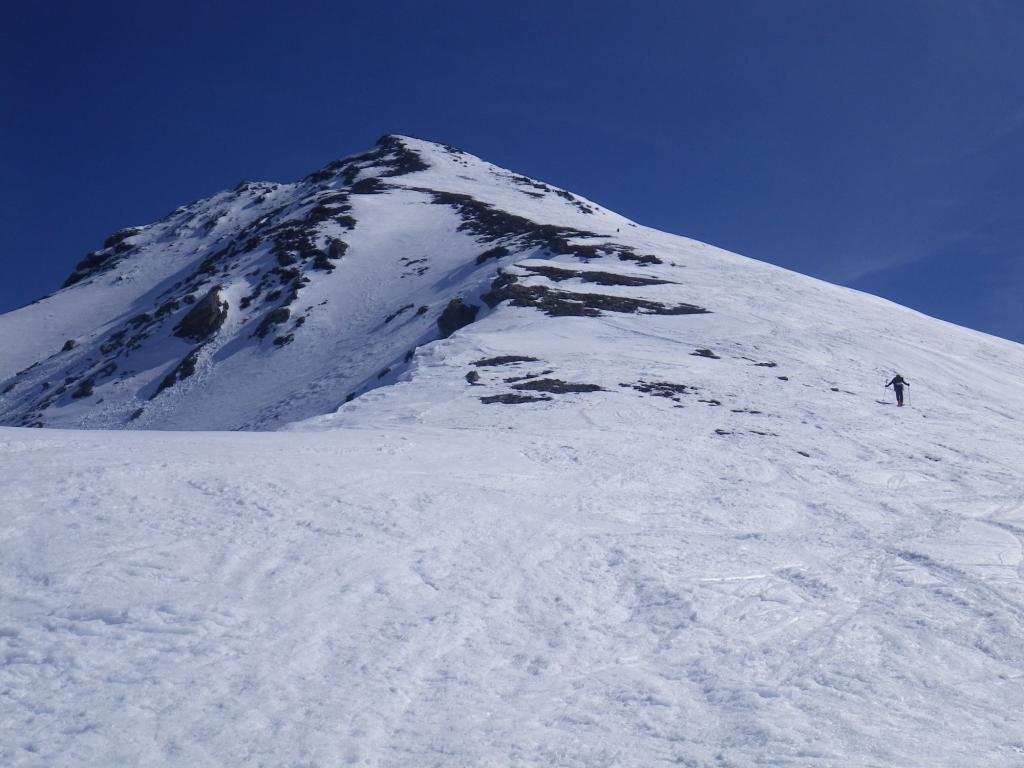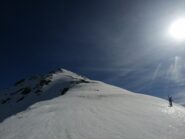 Tenendosi al centro della dorsale la si risale con percorso a piacere privo di ostacoli, gli ultimi 50 m di dislivello si raddrizzano ulteriormente, fino a guadagnare le roccette sommitali.