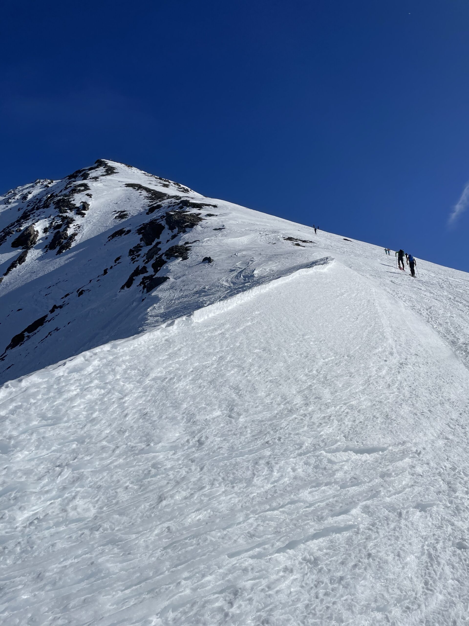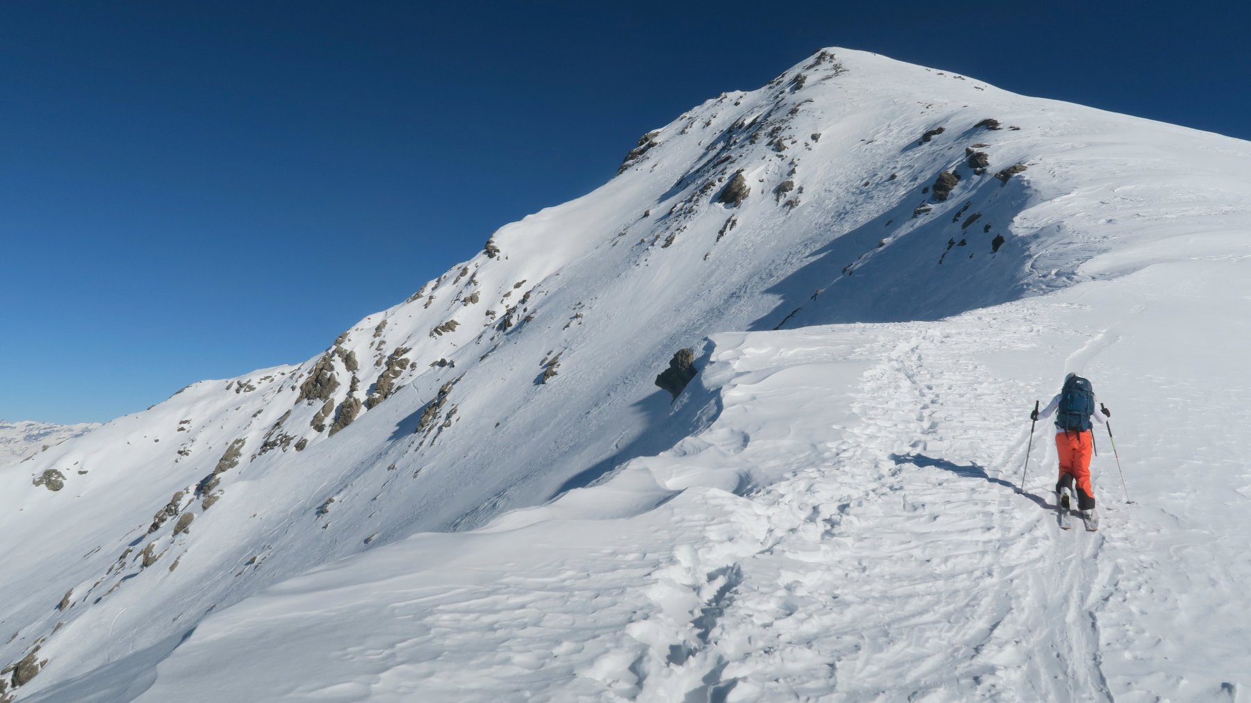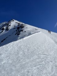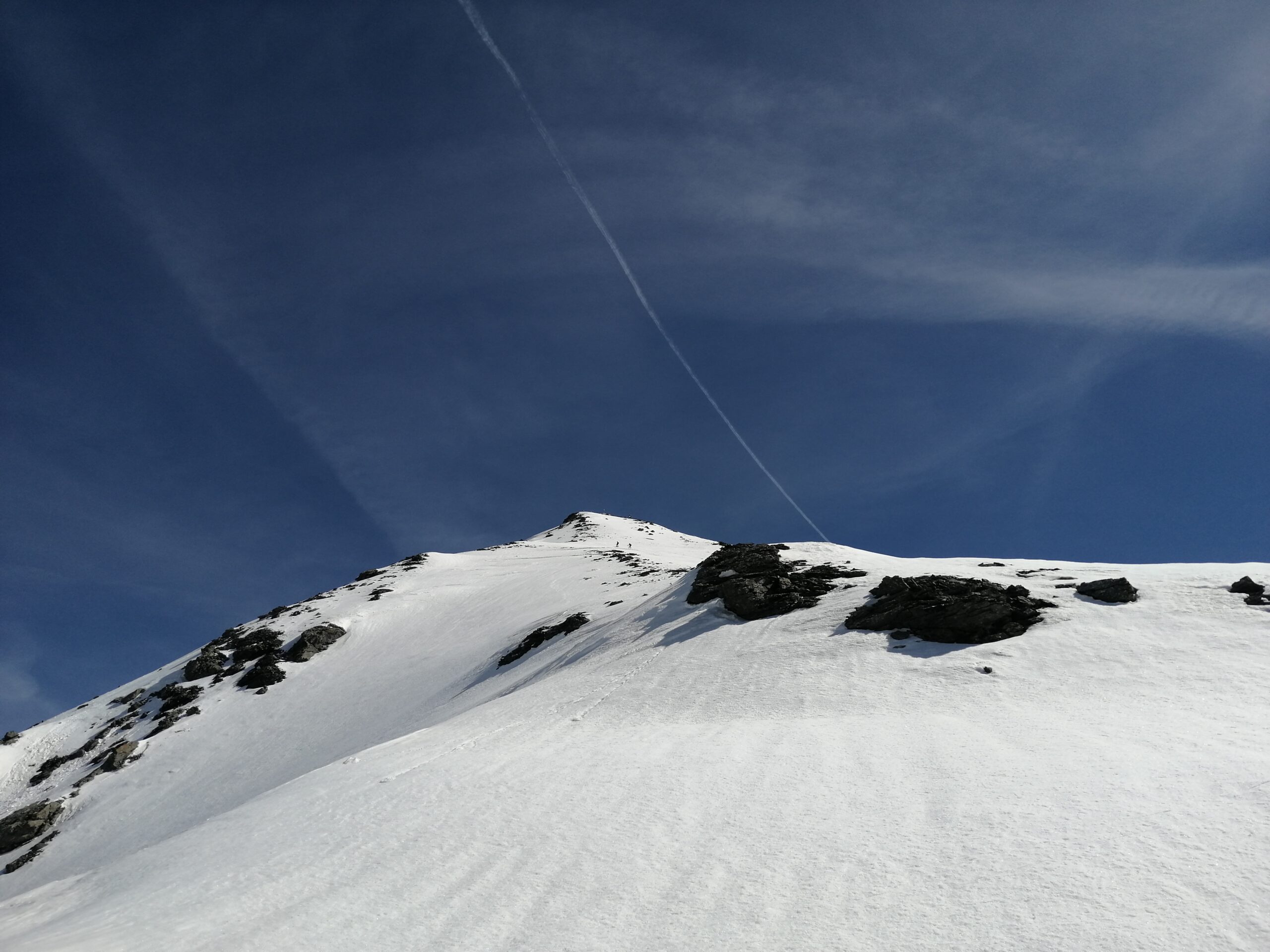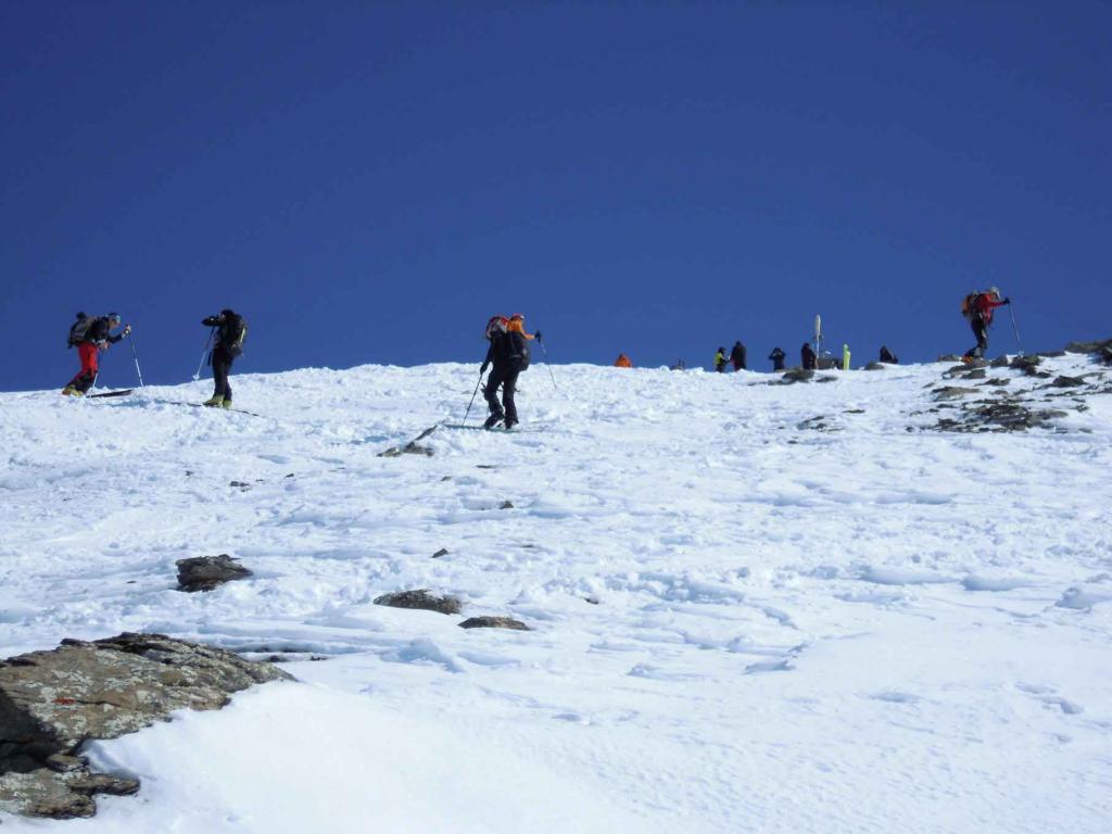 Tenendosi al centro della dorsale la si risale con percorso a piacere privo di ostacoli, gli ultimi 50 m di dislivello si raddrizzano ulteriormente, fino a guadagnare le roccette sommitali.