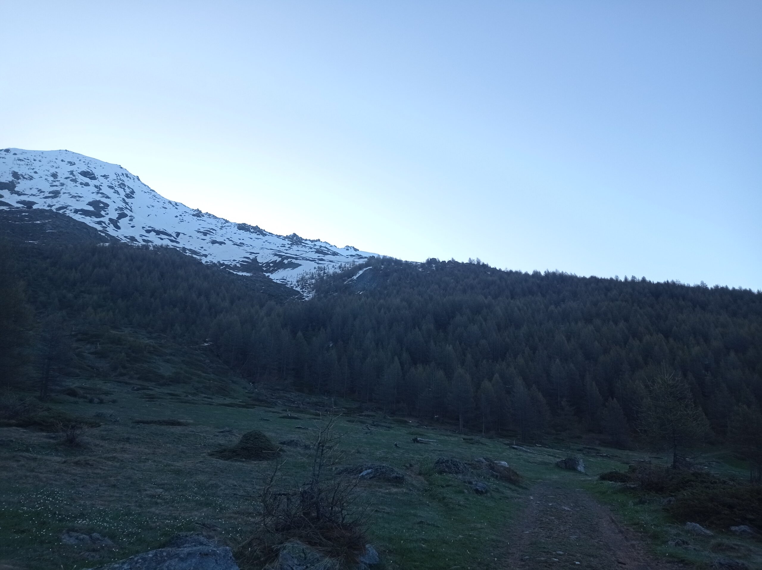 Saliti a monte delle case di Bessen Haut, si prosegue seguendo la strada tra i larici, sempre in leggera salita, fino a raggiungere un vasto vallone con un prato spoglio molto grosso, discendente direttamente dal Monte Sotto Rognosa. Qui si abbandona la strada che si inoltra nella Valle Argentera, e si volge decisamente a sinistra, salendo per i facili pendii con radi alberi e arbusti, piegando progressivamente verso destra in direzione della dorsale Ovest che scende dal Sotto Rognosa. La si può raggiungere da subito superata la fascia di larici, oppure proseguendo al centro della valletta fino ad un pianoro con un masso dipinto di blu (al mattino controsole si vede poco). Da qui proseguire verso destra (sud) e raggiungere la suddetta dorsale.
