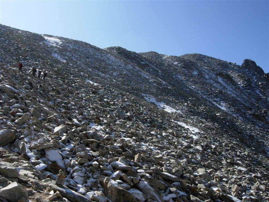 Giunti al lago superiore (quota m.2390 circa) si rintraccia il sentierino che giunge dal Colle di Fremamorta che rovinato sale nella pietraia e arriva alla Baisse de Roguè. Da qui si svolta a destra su pietre e magra erba e per l’ampio e panoramico crestone si giunge in vetta.