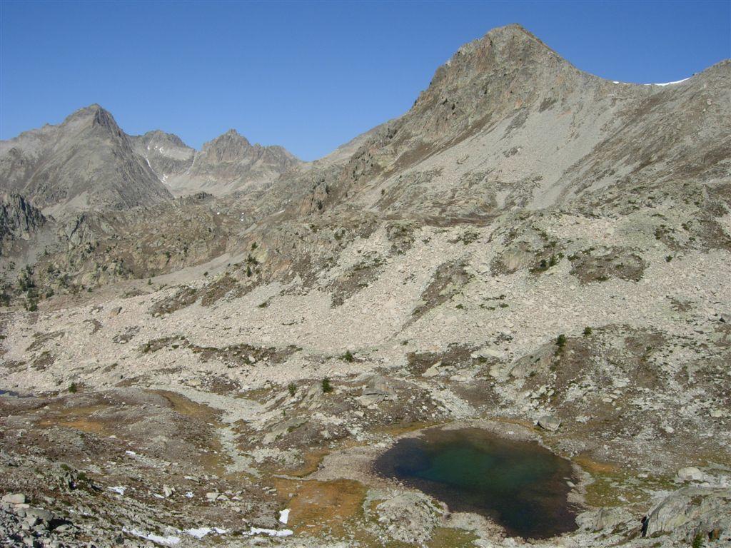 A quota circa 2400 m. si lascia il sentiero per dirigerci verso destra (est) e la nostra meta seguendo degli ometti e tracce attraverso la conca dei Lacs de Fremamorte. (Non trovando la traccia o volendo proseguire con sentiero si può salire ancora lungo il sentiero verso il colle di Fremamorta e poco sotto il colle prendere una deviazione a destra che con piccolo sentiero scende nella conca sottostante sede dei bei laghi, ma occorre aggiungere un pò di dislivello all’itinerario precedente).