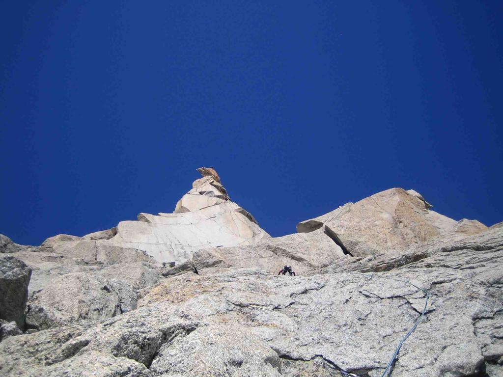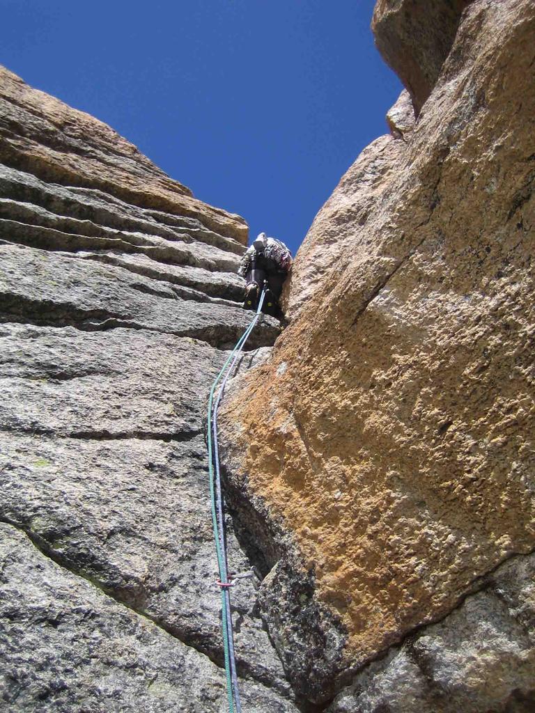 b) Piegare a destra e raggiungere un diedro ampio ed appoggiato che porta in cresta. Saltare una sosta che è ivi posta e proseguire fin dove la cresta muore sotto il triangolo sommitale della montagna. La sosta è posta su di un pulpito sulla sinistra.