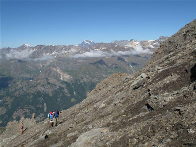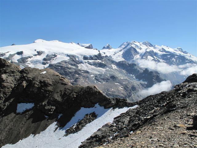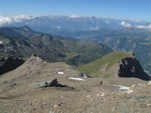Primo piano su Dent d’Herens, Cervino, e il gruppo del Rosa fino al Gran Combin, il Bianco, il Gran Paradiso, ecc un pò più in là.