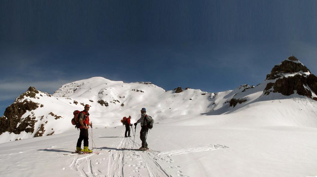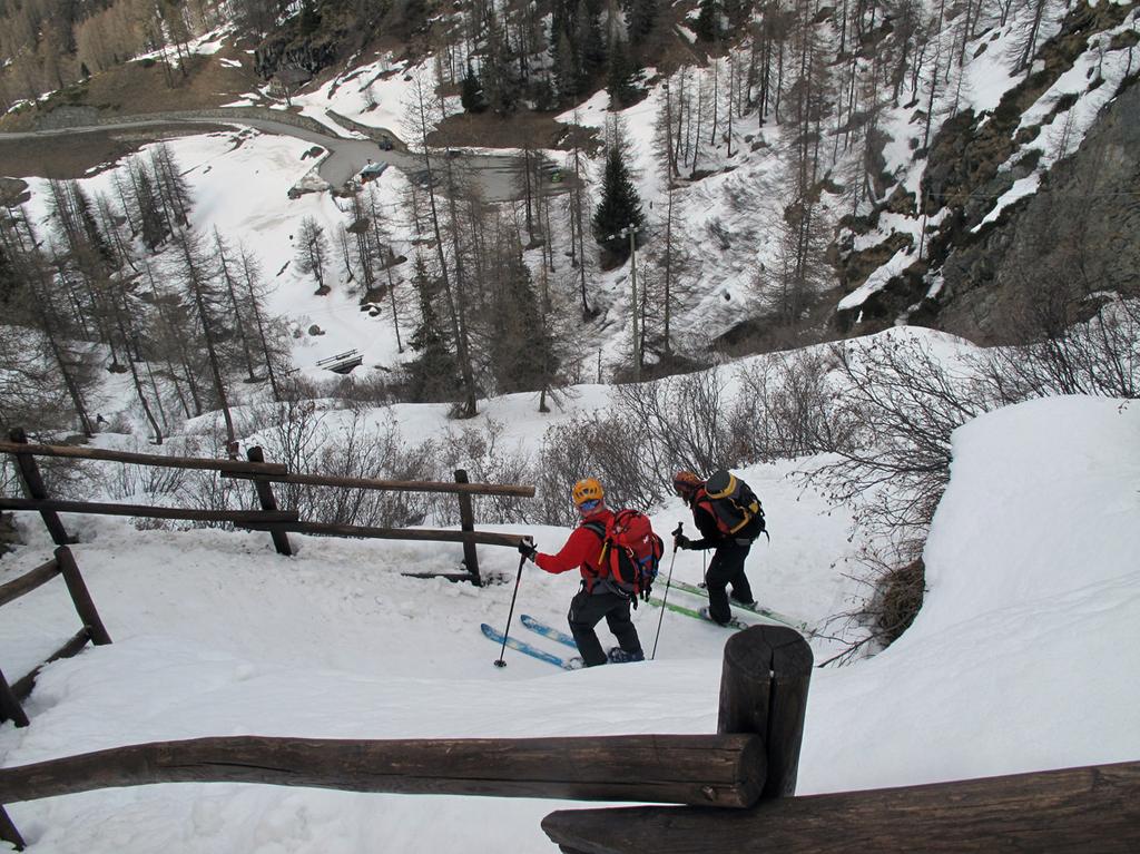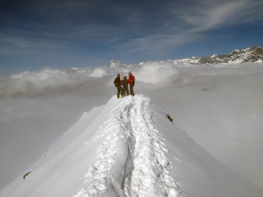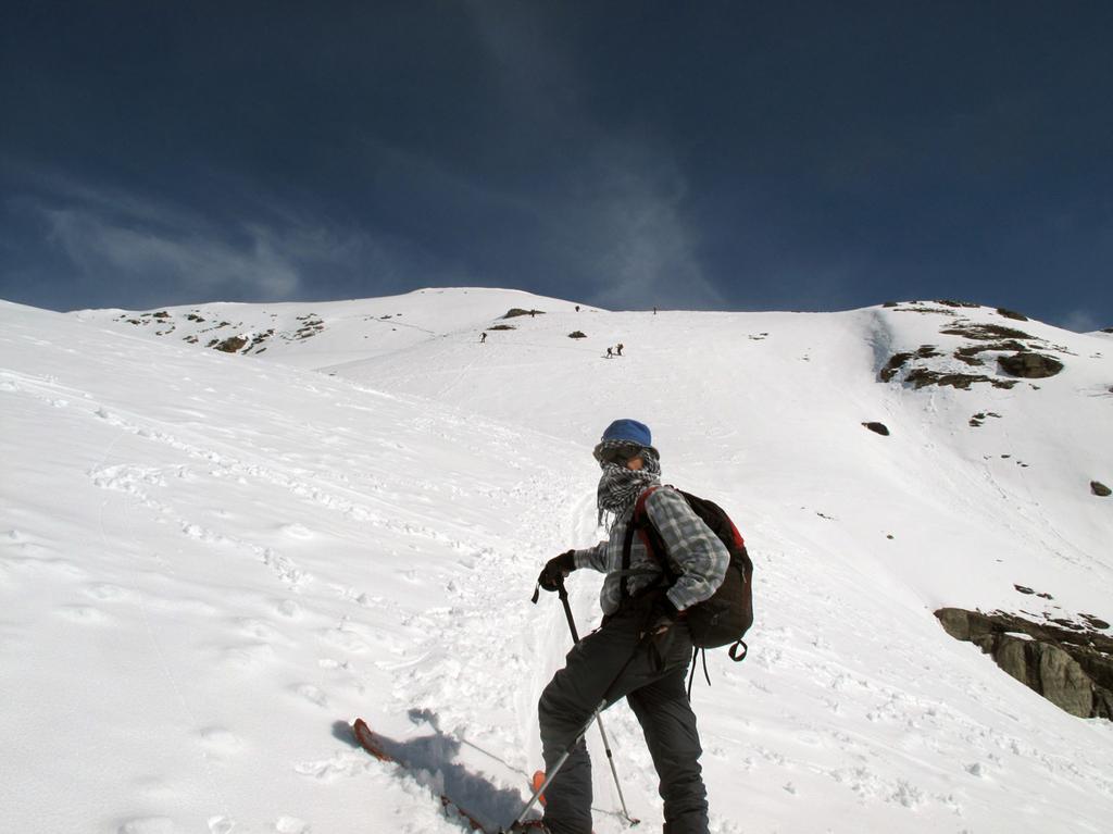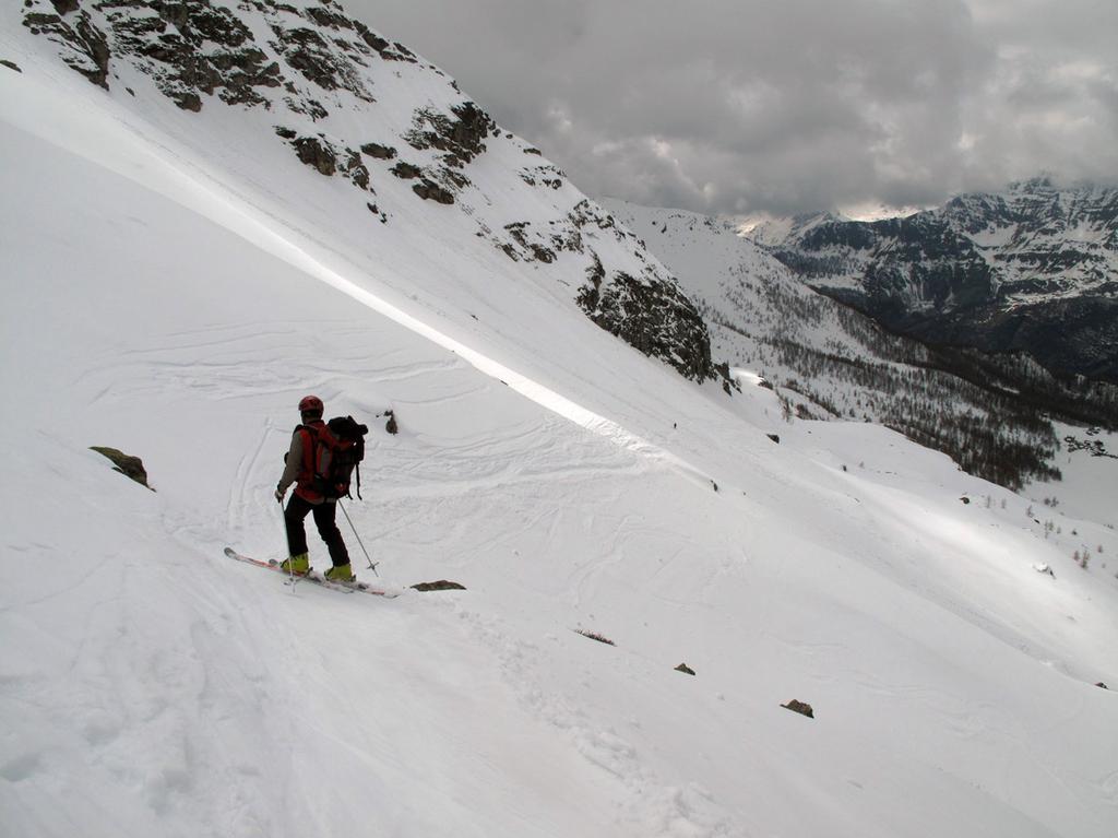 La cosa buone è che i pendii sopra il traverso sono scarichi, la cosa cattiva è che la temperatura era alta (1°C a Cheneil). Comunque salendo la qualità della neve è migliorata. Sul pendio finale un pò di polvere, scendendo fino al traverso qualità buona, sotto uniformemente molle.