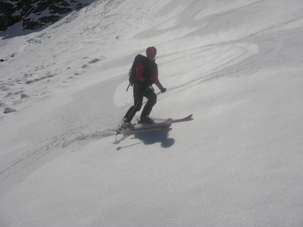 Ivano e claudio partenza ore 6 e mezza. Le stelle sarebbero 5 e per Claudio lo sono. Le mie gambe in discesa invece erano budinose. Neve dura e a tratti durissima in salita, faticoso attraversamento di notevoli “pere” gelate sul traverso, perdita e faticoso recupero di uno sci. Insomma in cima gia troppo tardi e cotto. Un’ora prima: perfetto! Comunque è Perfetta, da fare ora, appena torna il bello. Decine di persone sul Petit Tournalin, probabilmente meglio data l’esposizione e il trasferimento più breve. Alcuni in effetti hanno cambiato idea in salita. Discesa a tratti entusiasmante sul famoso firn firn.