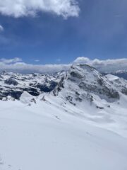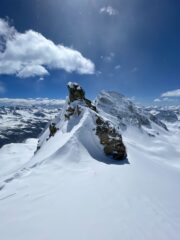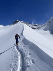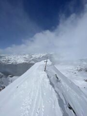Il lungo traverso con le condizioni attuali non è problematico, la neve tiene bene e mai messo i rampant. Cima sud si raggiunge tranquillamente sci ai piedi, la cima nord è carica di cornici e non ci sono tracce che la raggiungono.