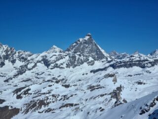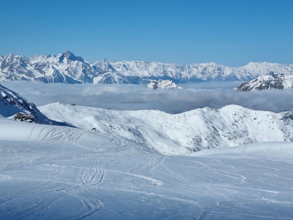 Discesa (ore 12). Nei primissimi pendii, fin ancora un po’ duretta, poi, sui pendii ben esposti a sud-est, cremina perfetta. Su altre esposizioni non aveva ancora mollato affatto, benché prendesse il sole già da ore. Nel traverso, ancora gelato e devastato da 100 tracce, dopo aver passato il punto esposto, mi sono buttato sui pendii sottostanti, ancora poco battuti, per recuperare poi in basso. Dura, ma ben sciabile. Nel bosco sarebbe ancora stata crosta portante, ma anche questo è devastato dalle tracce vecchie in ogni angolo, quindi male. Di nuovo bellissimi i dolci pendii sotto il bosco, prima di iniziare a spingere per tornare a Cheneil. Voto complessivo: 3 stelle 1/2.