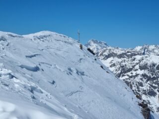Finalmente le temperature sono calate! 0°C al parcheggio alle 8.30, rigelo ottimo. Salita senza problemi, se non che fare il traverso con la neve gelata mi ha fatto sbucciare il malleolo interno sinistro….. nel resto della salita, più volte gridai la mia pena e il suo nome.