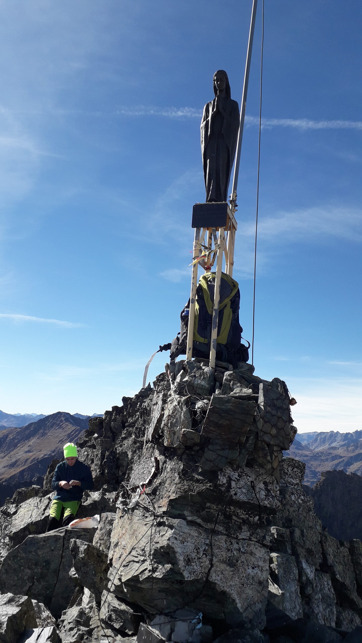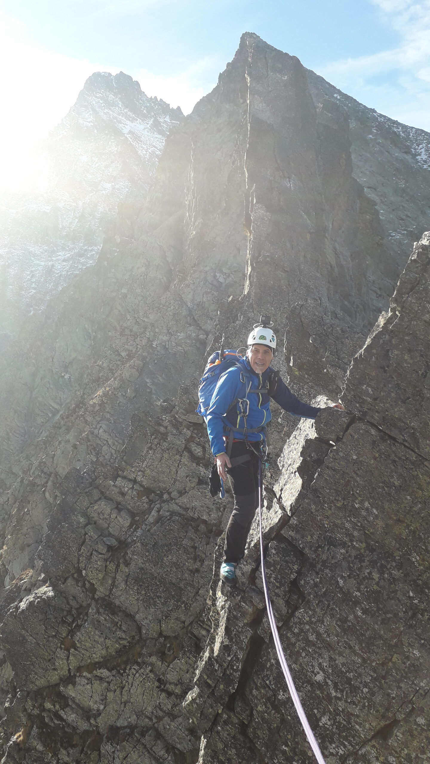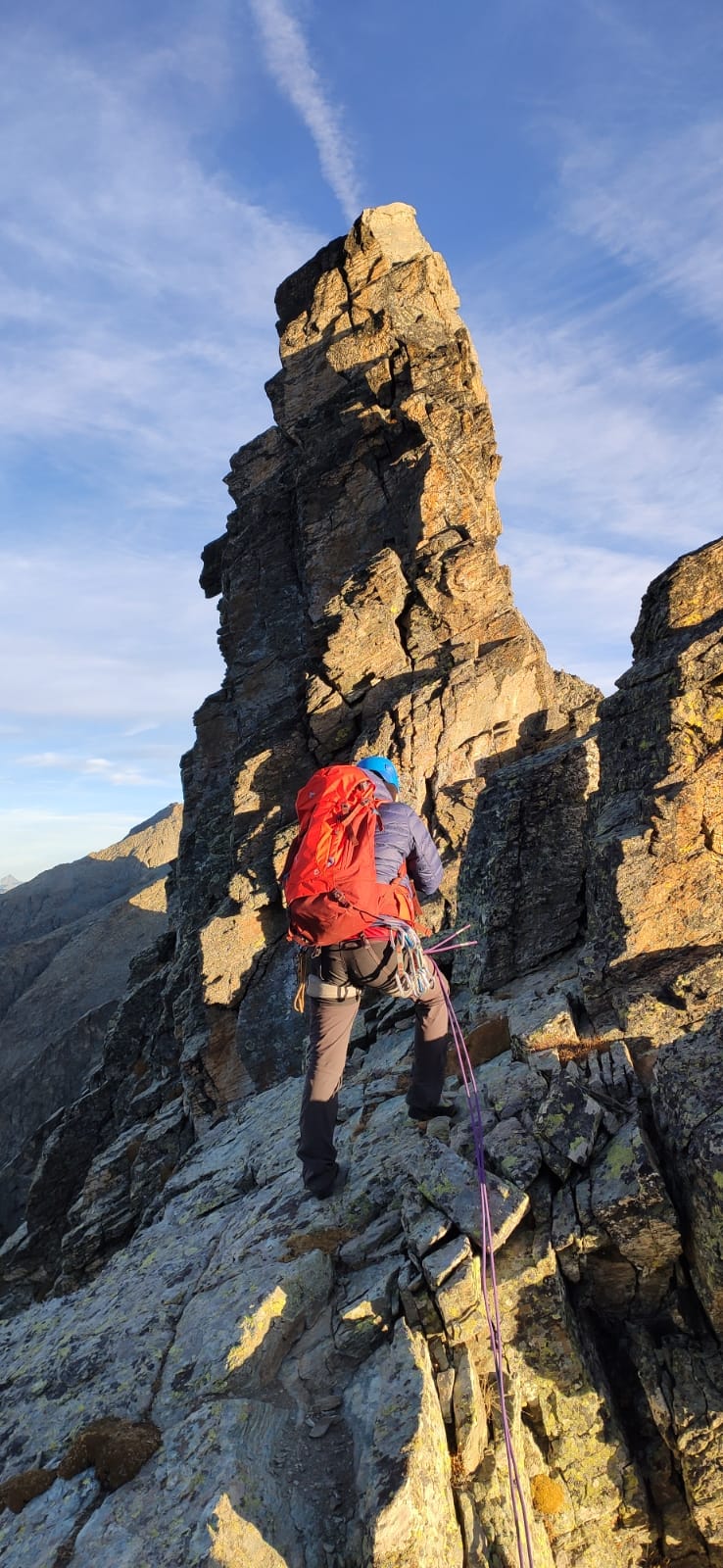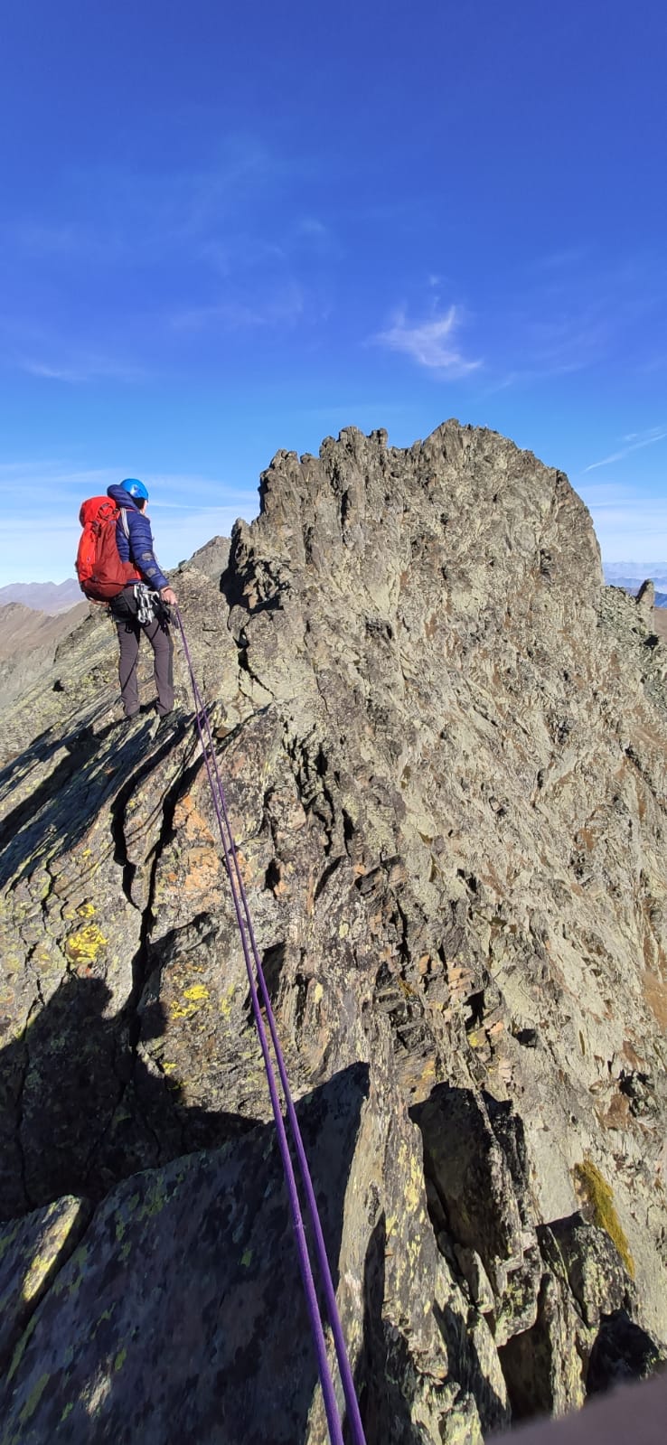Sul filo oggi, impossibile procedere se non ben abbottonati. Un po’ meglio nei tratti al riparo dal vento, annunciato forte oggi in quota. In realta’ ‘tanto forte non era, certo e’ che comunque neanche caldo appariva. Piu’ faticosa che difficile la seconda parte dopo il diedro, unica sezione questa dell’intera cresta dove si arrampica un minimo. Per il resto pura ginnastica come gia’ ebbi occasione di accennare nel post di quattro anni fa sempre su questo itinerario.