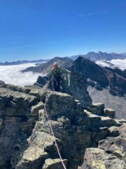 Bellissima cresta all’ombra del Monviso. In qualche punto si cammina. Spit nei punti utili. Fatta con scarpe da avvicinamento.