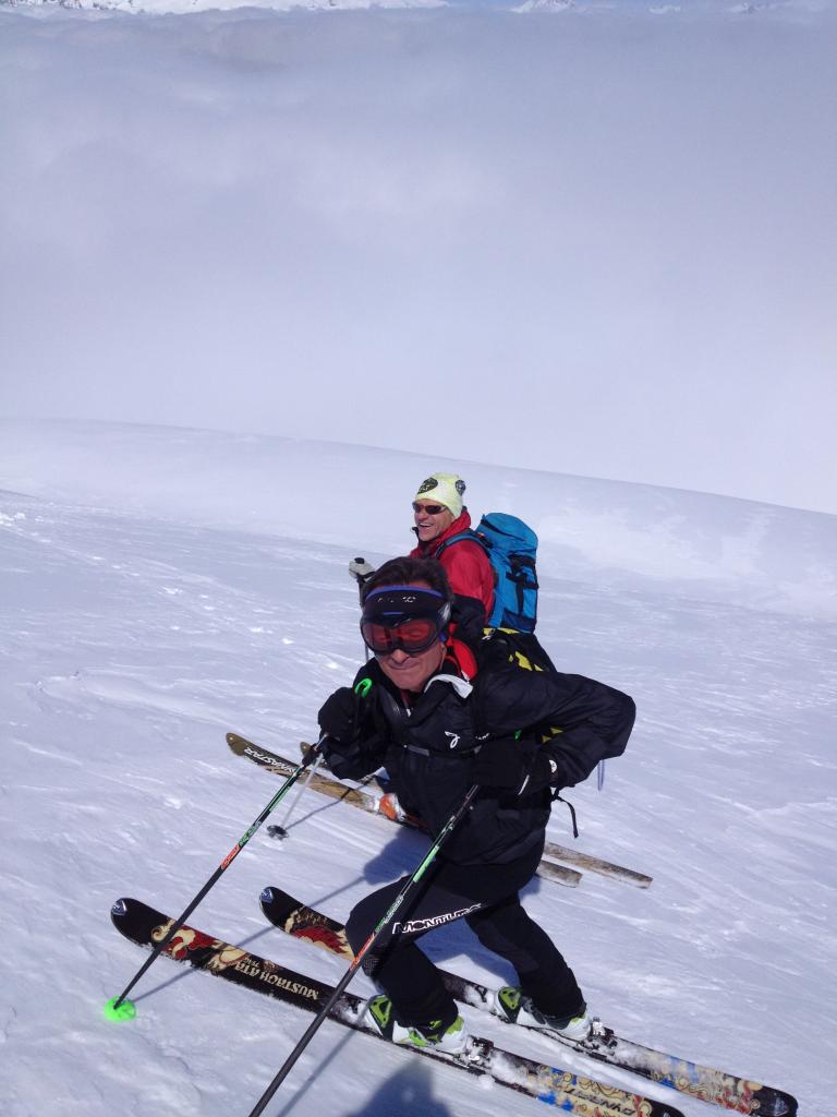 Salendo nella nebbia, siamo stati troppo a dx (faccia a monte). In alto il vento dei giorni scorsi ha fatto il resto, trasformando la farina del pendio in una crosta dove bisognava sciare decisi. Nella parte intermedia, siamo riusciti a fare 300 m. di belle curve su neve dura e firn a cui si è presto sostituita una bella pauta. Finale su lingue di neve nel bosco fino a 20 m. dall’auto.