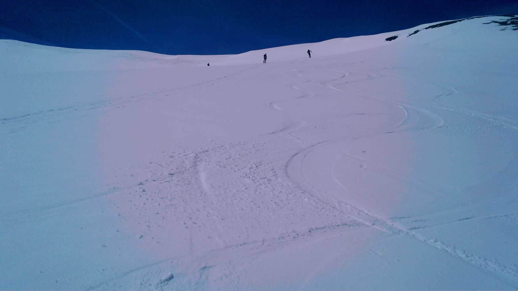 Brevissimo tratto sfondosa verso i 3000mt, ma deviato a sinistra a reperire i pendii in contro pendenza non ancora toccati troppo dal sole e di nuovo ottima portante.