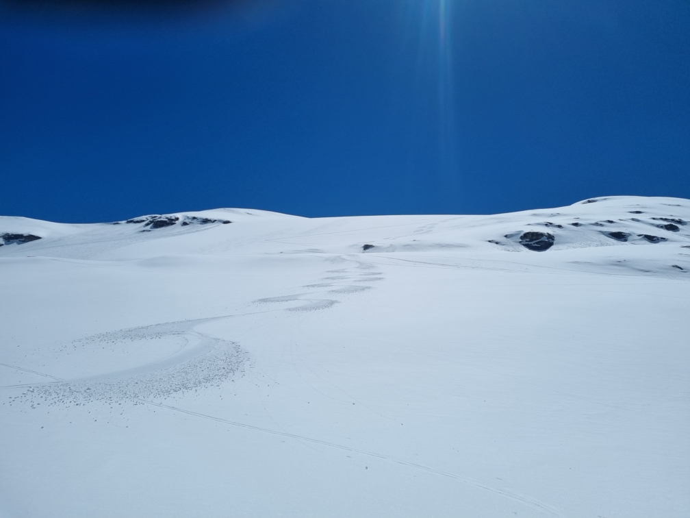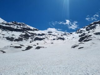 Discesa (ore 12). Tutta la parte alta e mediana, sopra i canali, perfetta: una moquette portante, veloce e perfettamente liscia. Ancora buona la parte alta del canale di discesa, poi inizia ad essere un po’ molle. Ma si è quasi alla fine della neve. Comunque mai lenta anche sotto.